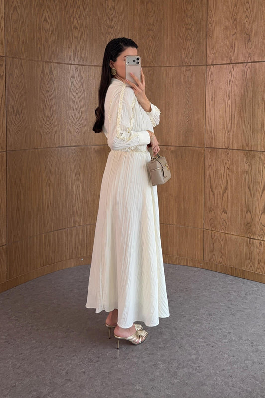 Cream Ruffle Trim Co-ord Set with Tie Neck, Puff Sleeves & Drawstring Waist