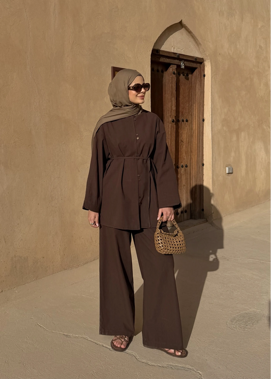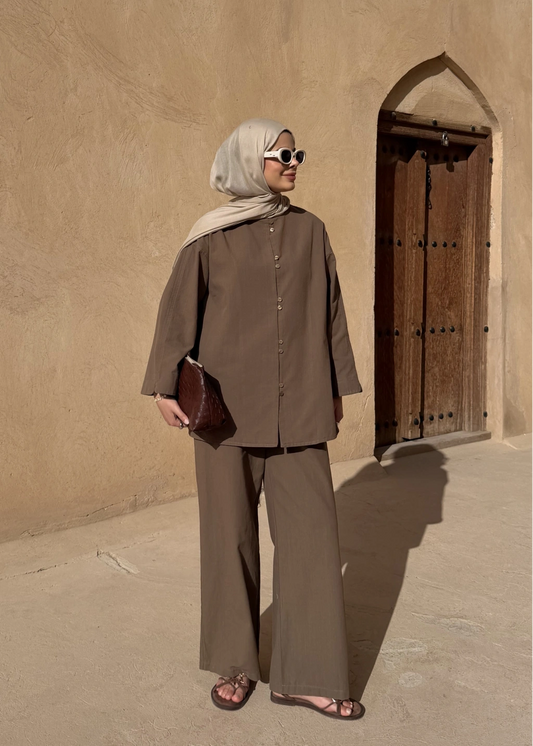 Mocha Button Detail Linen Set – Adjustable Waist