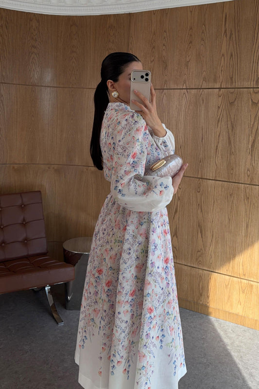 Digital Flower Print Linen-Look Maxi Dress with Puff Sleeves & Belted Waist