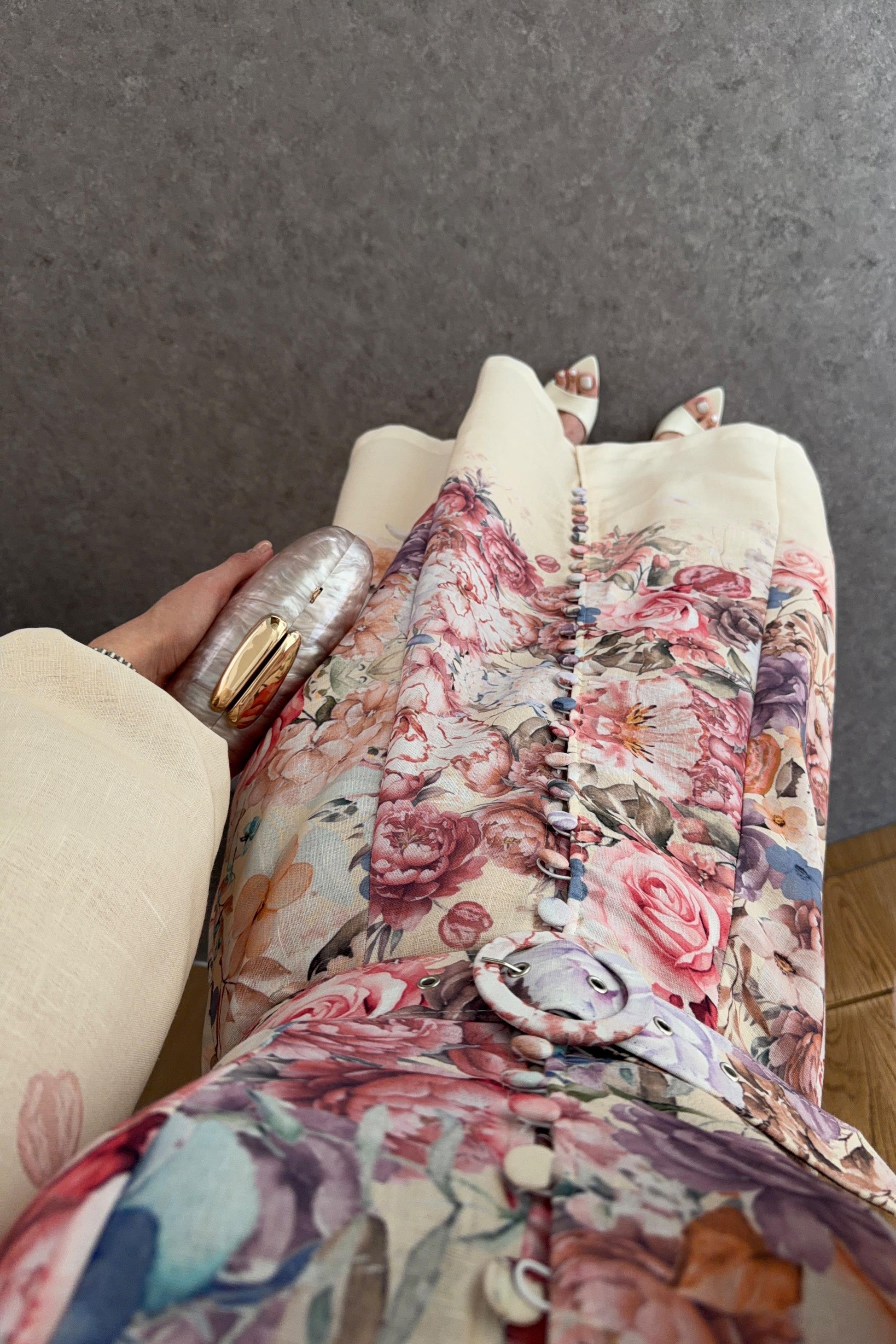 Bold blooms meet effortless elegance in this show-stopping digital rose print maxi dress. A full-coverage watercolour floral print in soft pinks, purples and blush tones covers the body, while the contrast cream linen-look puff sleeves add a romantic, editorial touch. The button-front closure runs the full length of the dress, and a matching wide belt with a statement buckle cinches the waist beautifully for a defined, feminine silhouette.