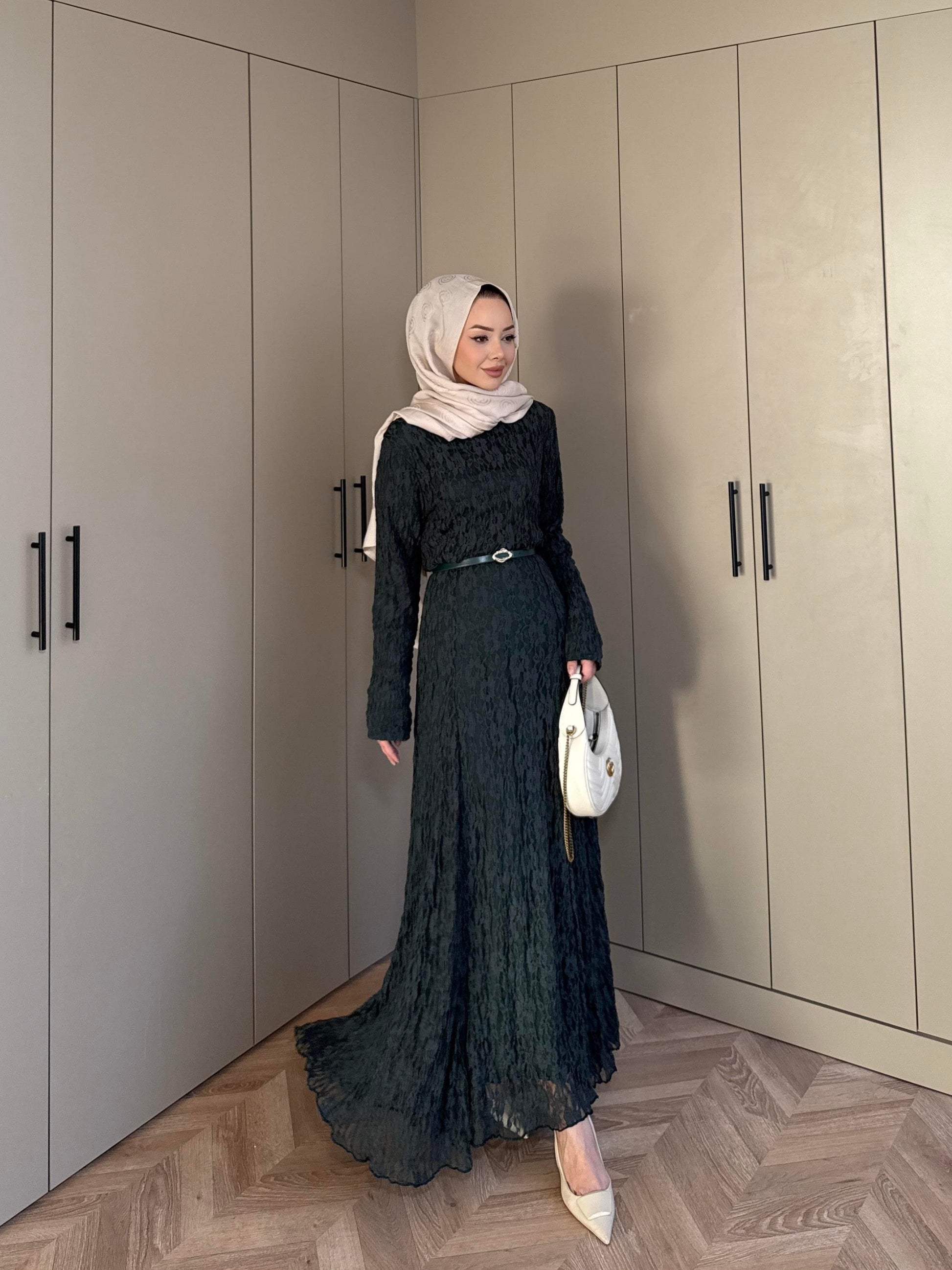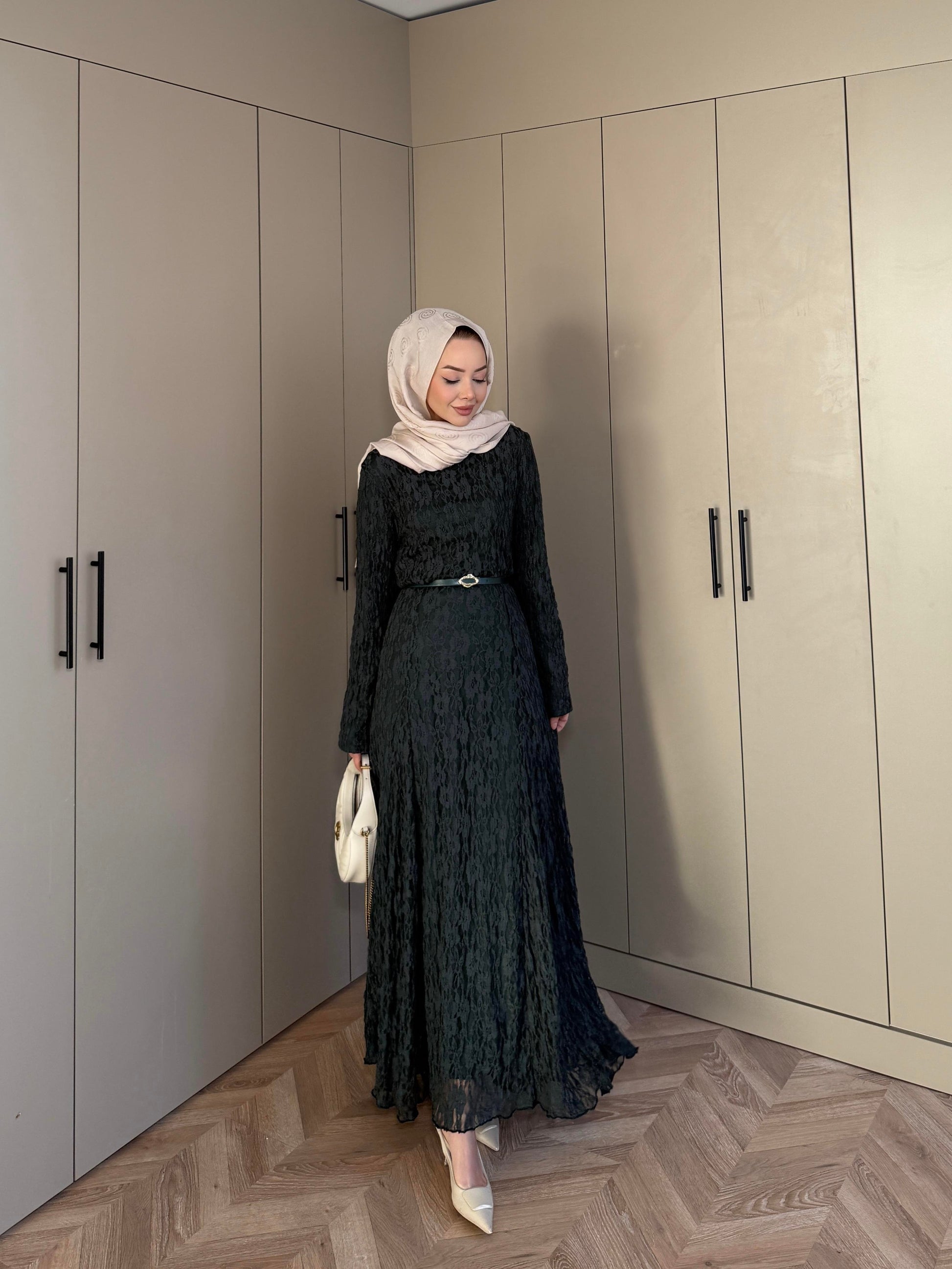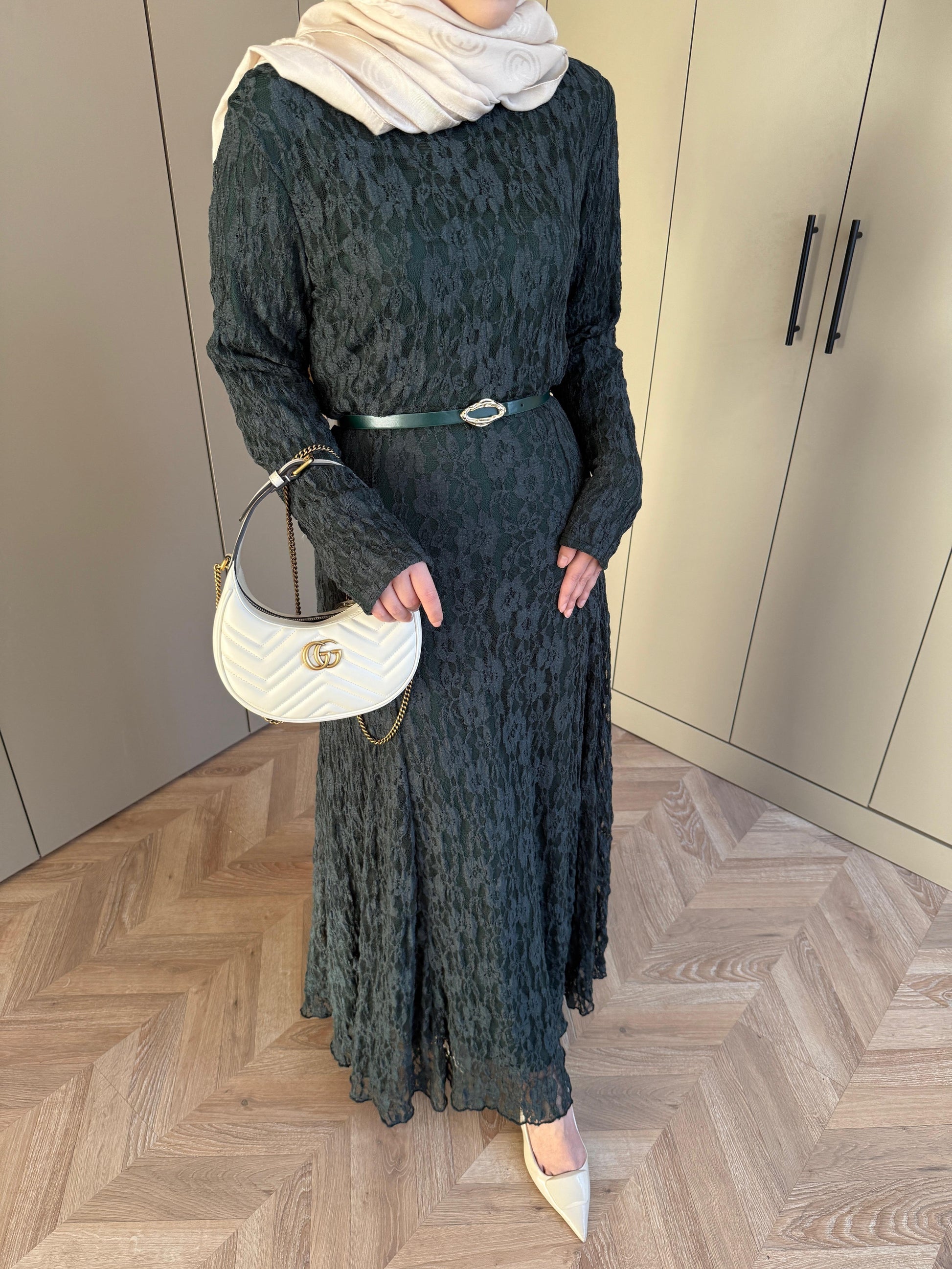 The Brown Lace Dress features elegant lace fabric with a fitted silhouette and a removable belt for adjustable styling. Designed with an invisible back zipper and lining for comfortable wear, this dress offers refined details and effortless sophistication suitable for daily or special occasions.