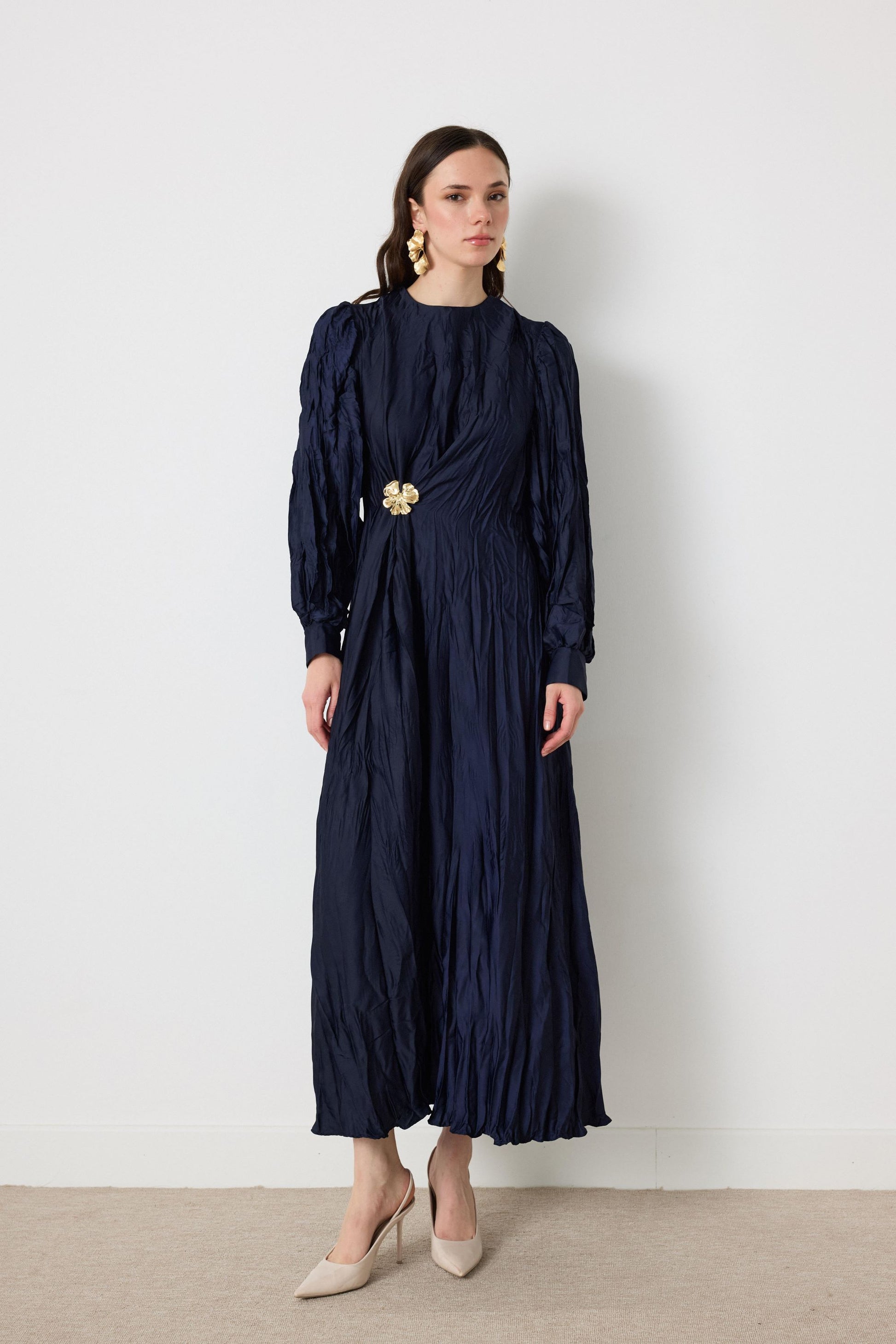 Crinkled Silk Satin Dress with Brooch in Navy Blue