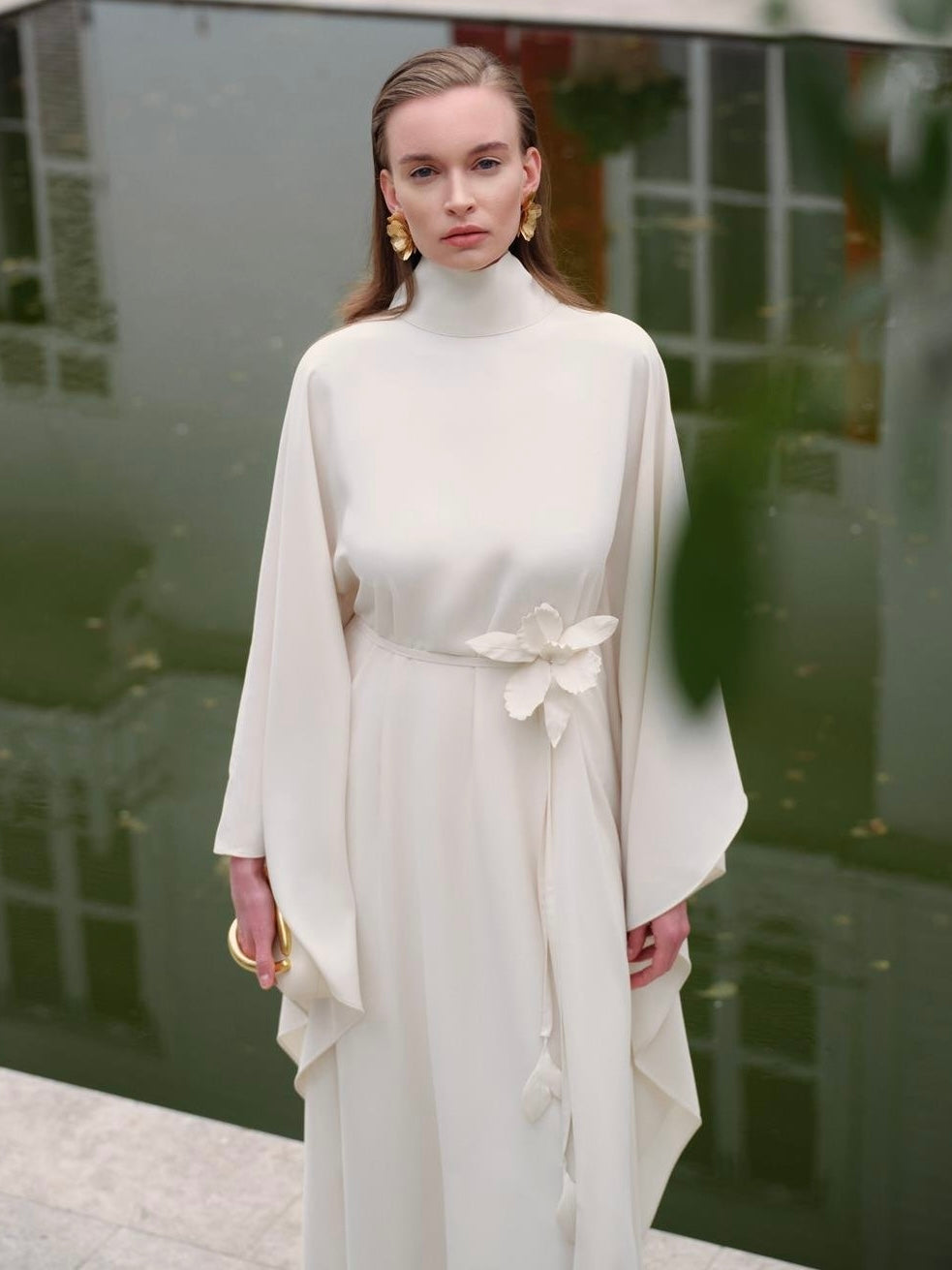 This kaftan comes with a handmade floral belt, crafted by our master floral designer.