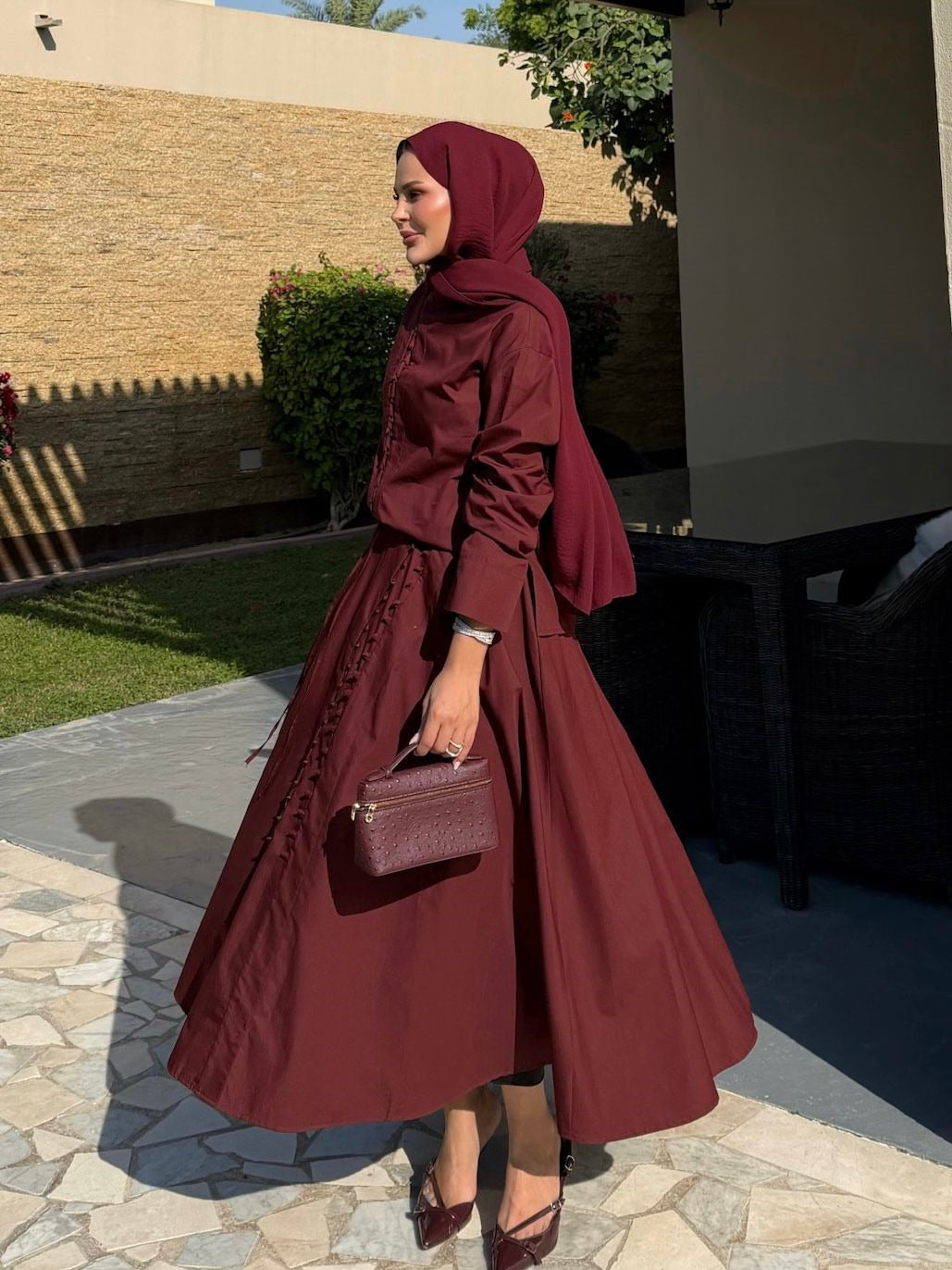 Ruffle Trim Button-Down Co-ord Set with Flared Maxi Skirt - Burgundy