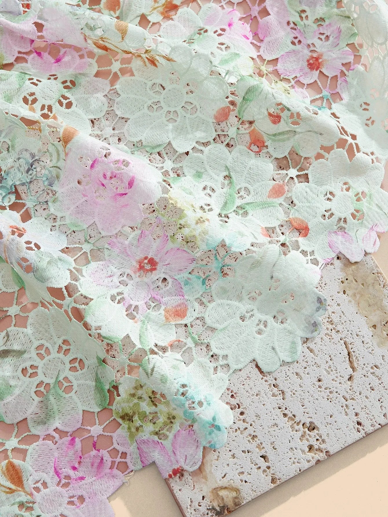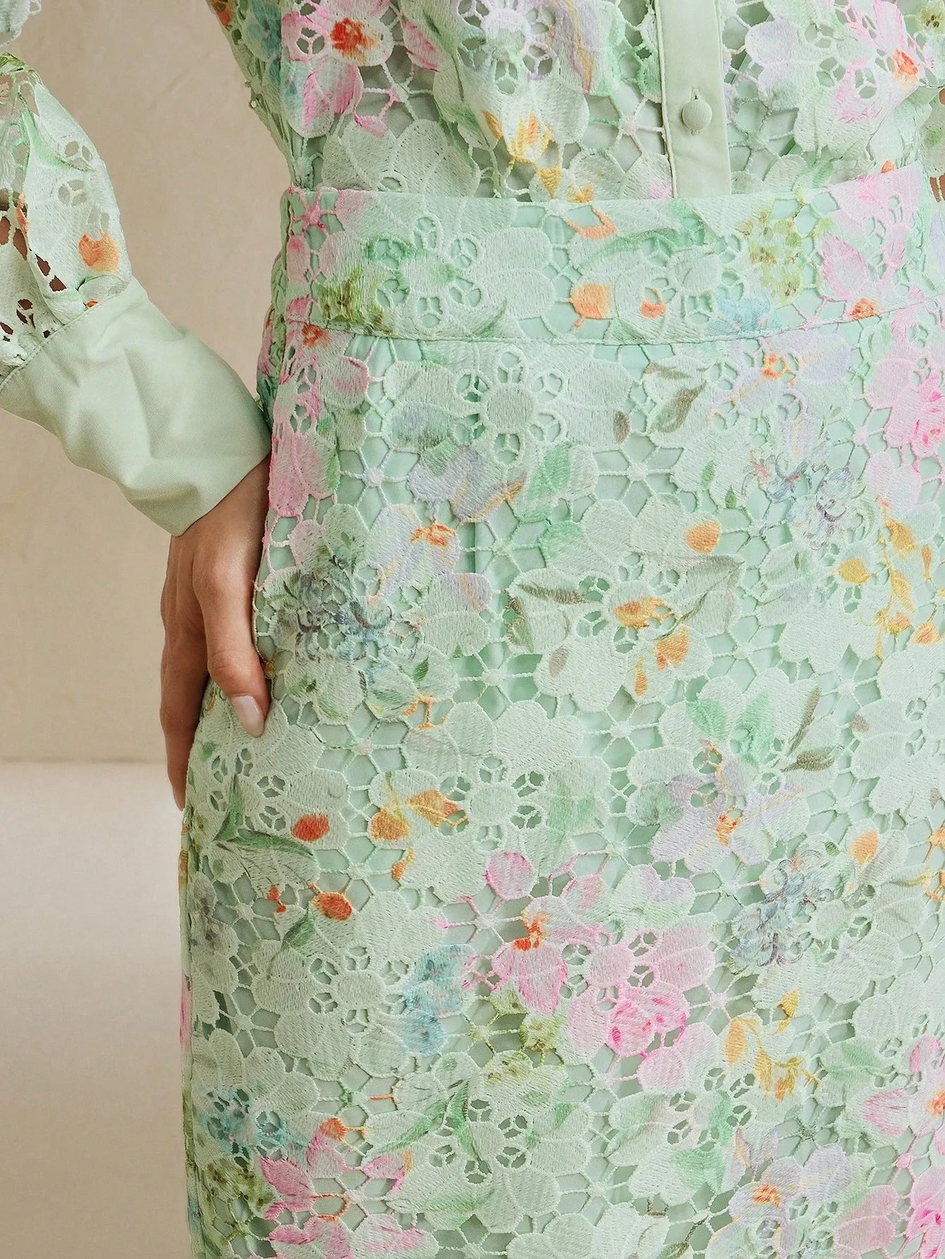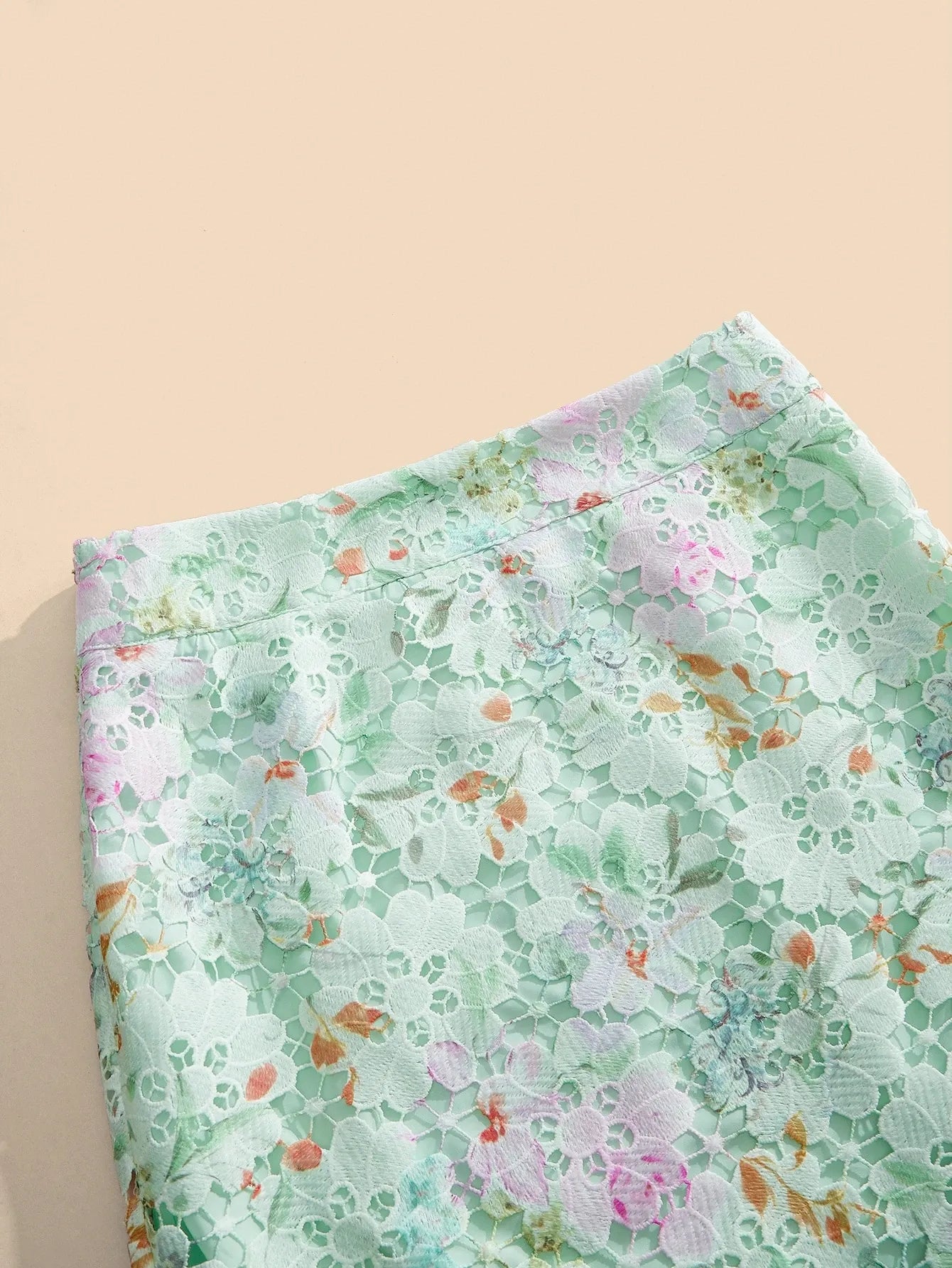 This skirt features a delicate lace design with hollow cut-outs and a ruched fishtail hem, creating an elegant and feminine silhouette perfect for summer events, parties, or evening wear.