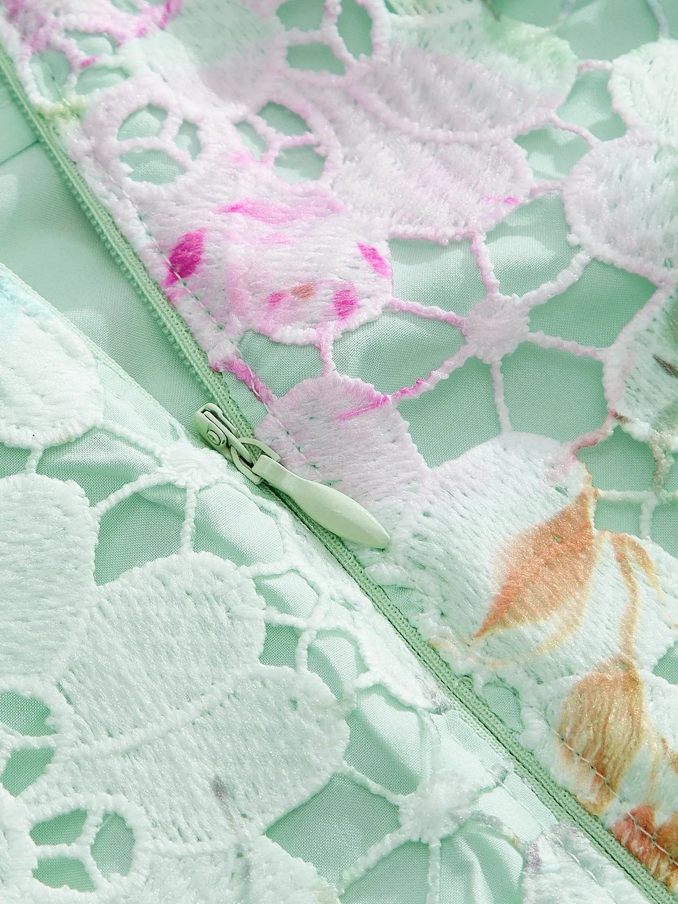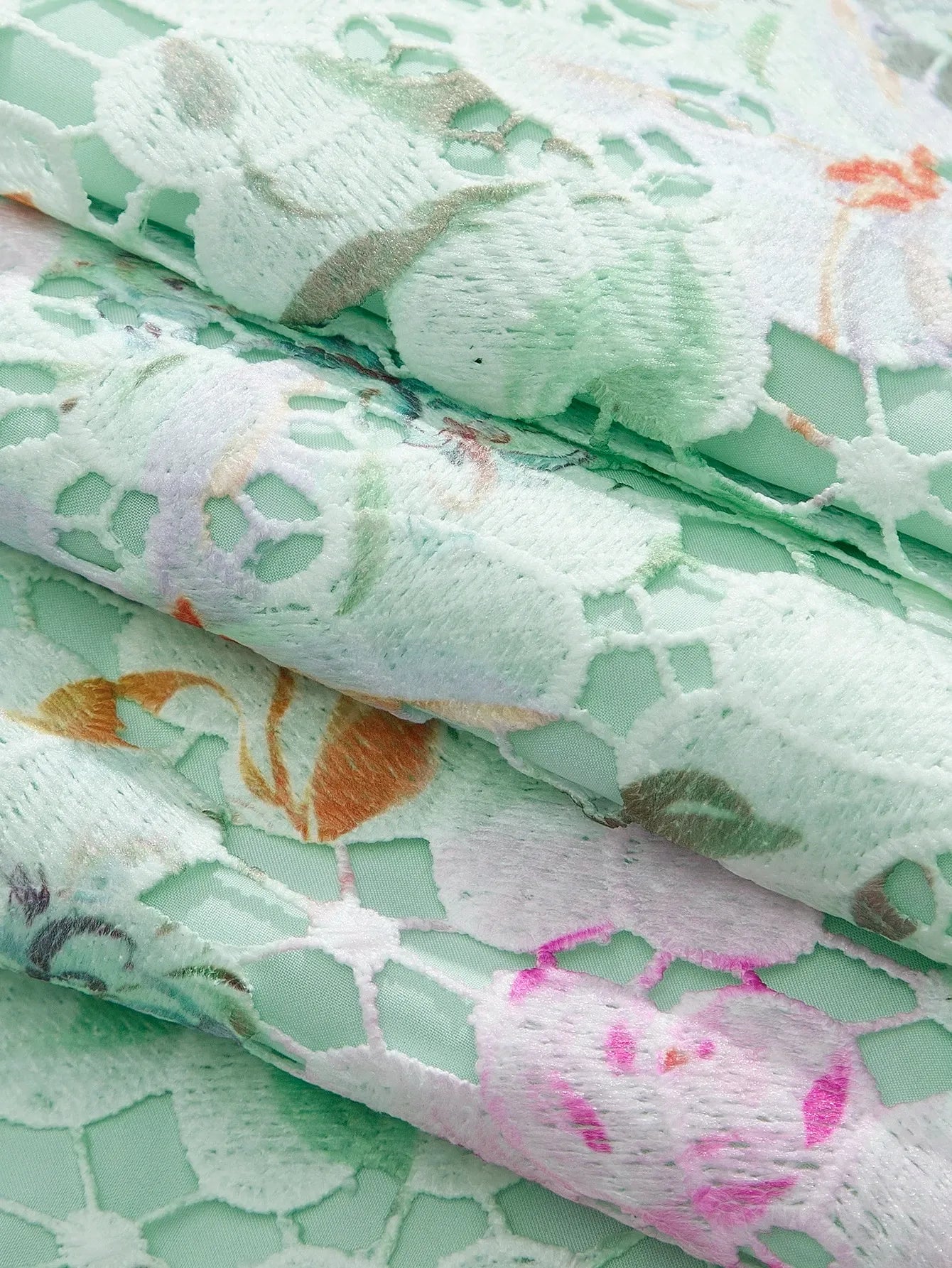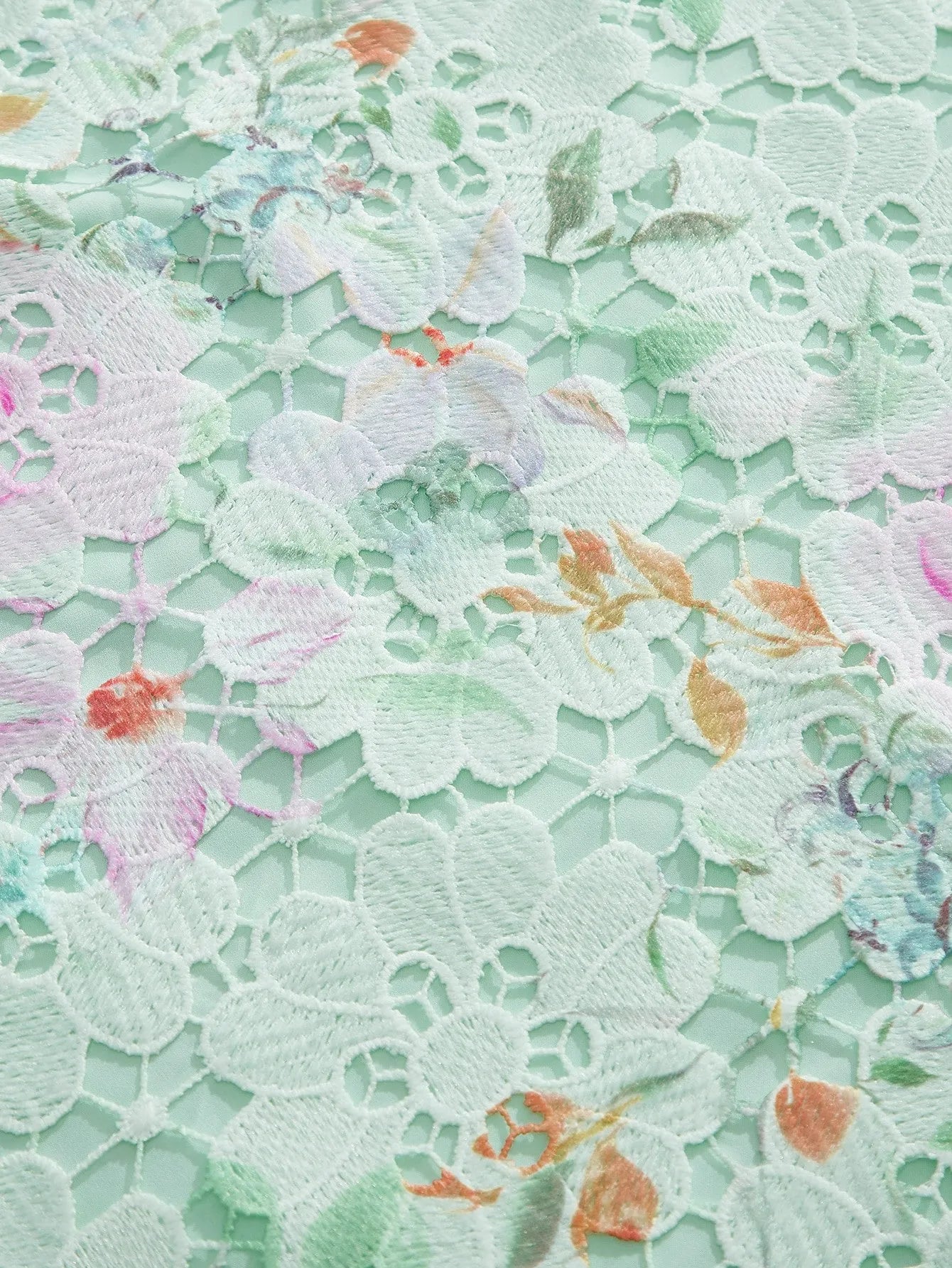 This skirt features a delicate lace design with hollow cut-outs and a ruched fishtail hem, creating an elegant and feminine silhouette perfect for summer events, parties, or evening wear.