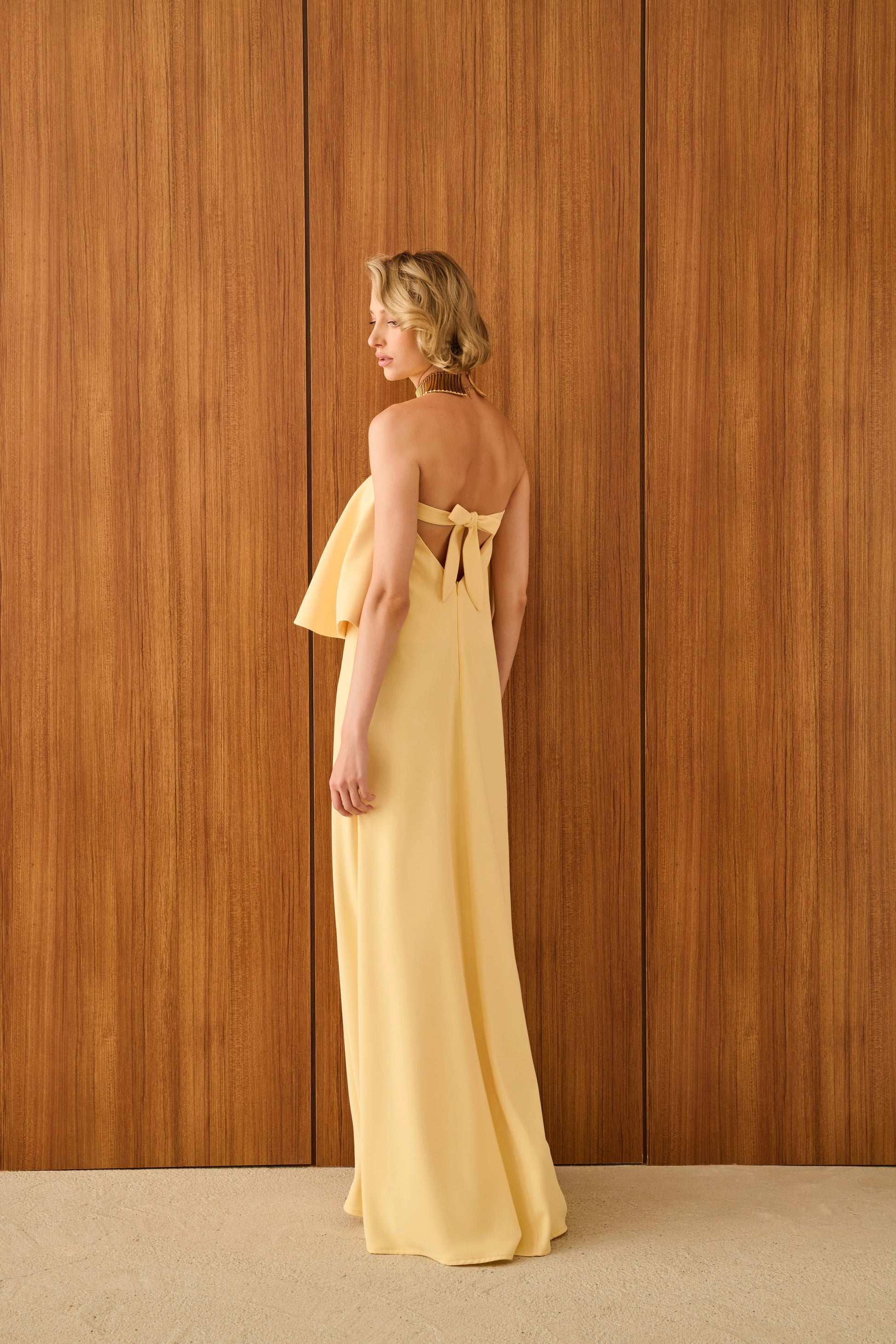 Strapless and adorned with a ruffled bodice, it catches attention even while standing still. The full-length skirt drapes with dramatic but soft ease, creating a silhouette that moves with you. One color, many layers of expression.