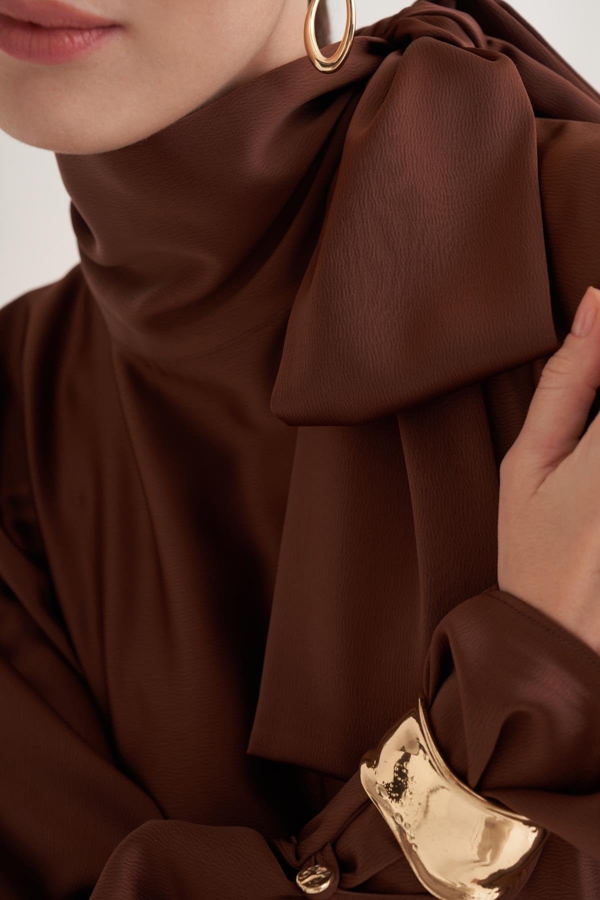 Brown Satin Batwing Sleeve Maxi Dress with Bow Neck Detail