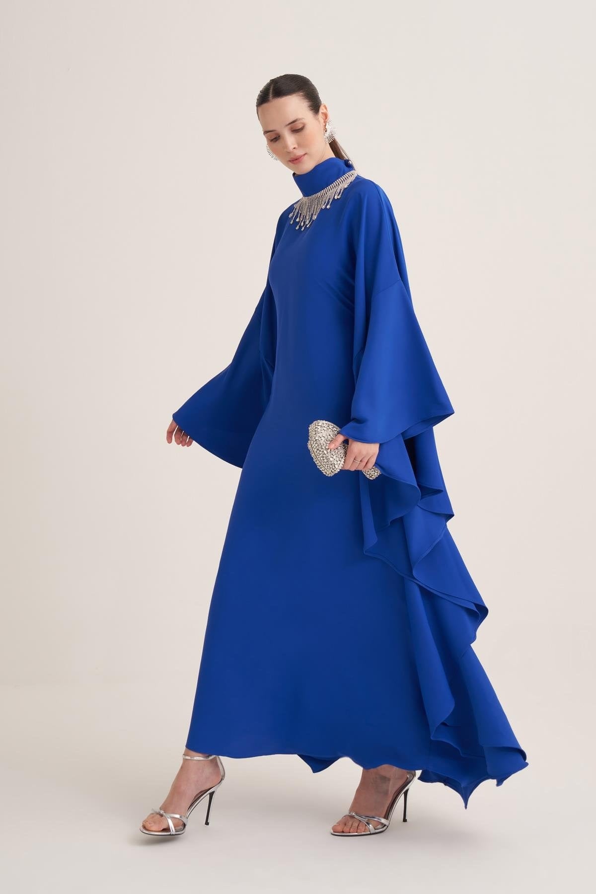 Royal Blue Kaftan Dress with Draped Cape Sleeves & Crystal Fringe Neckline