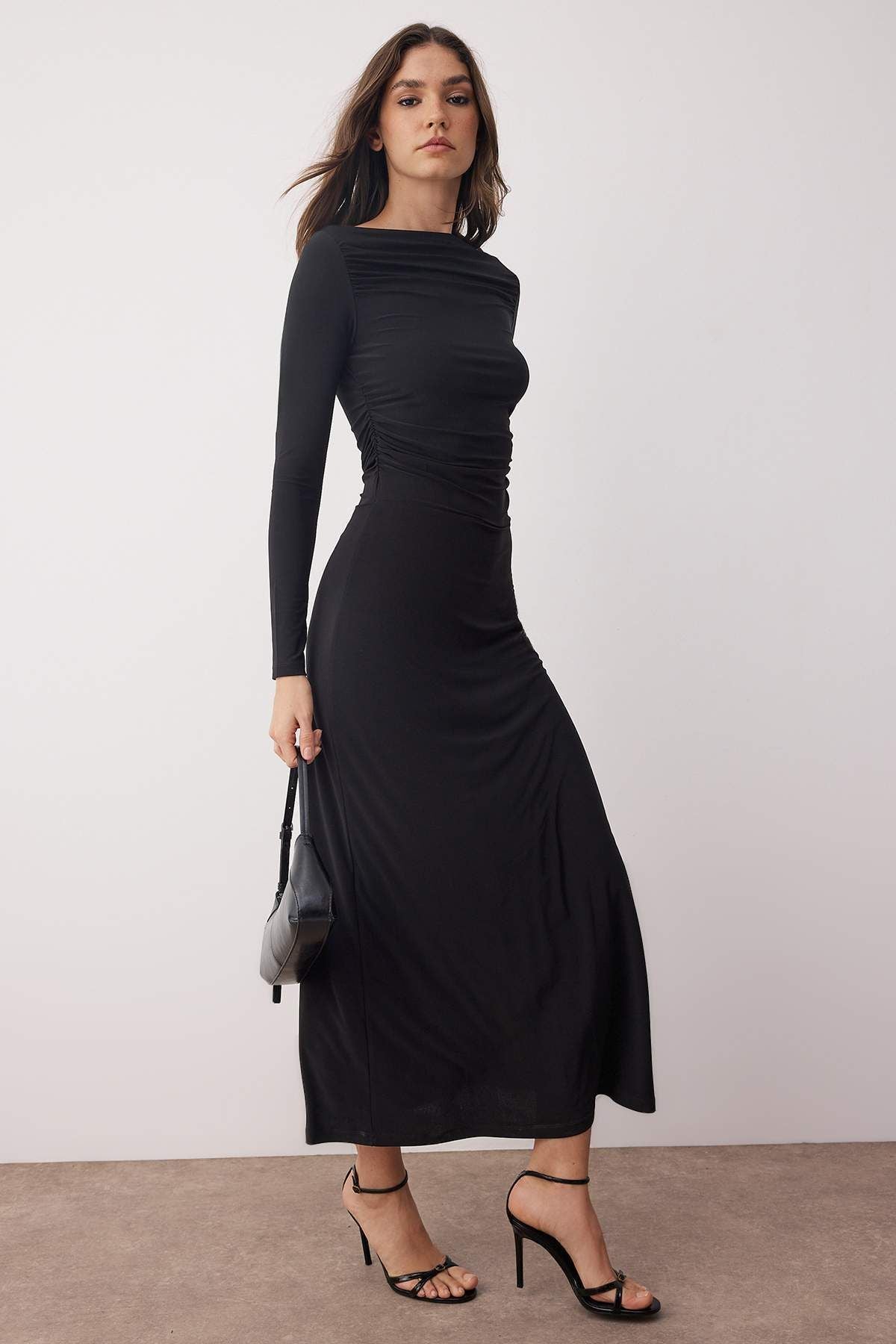 Embrace effortless sophistication with this black midi knit dress, designed with a chic boat neck and elegant ruched detailing. Its asymmetrical hem adds a modern touch, while the stretchy knitted fabric, a comfortable blend of polyester and cotton, ensures a flattering and comfortable fit. Perfect for versatile styling, this dress can be dressed up with heels or down with sneakers for a polished everyday look.