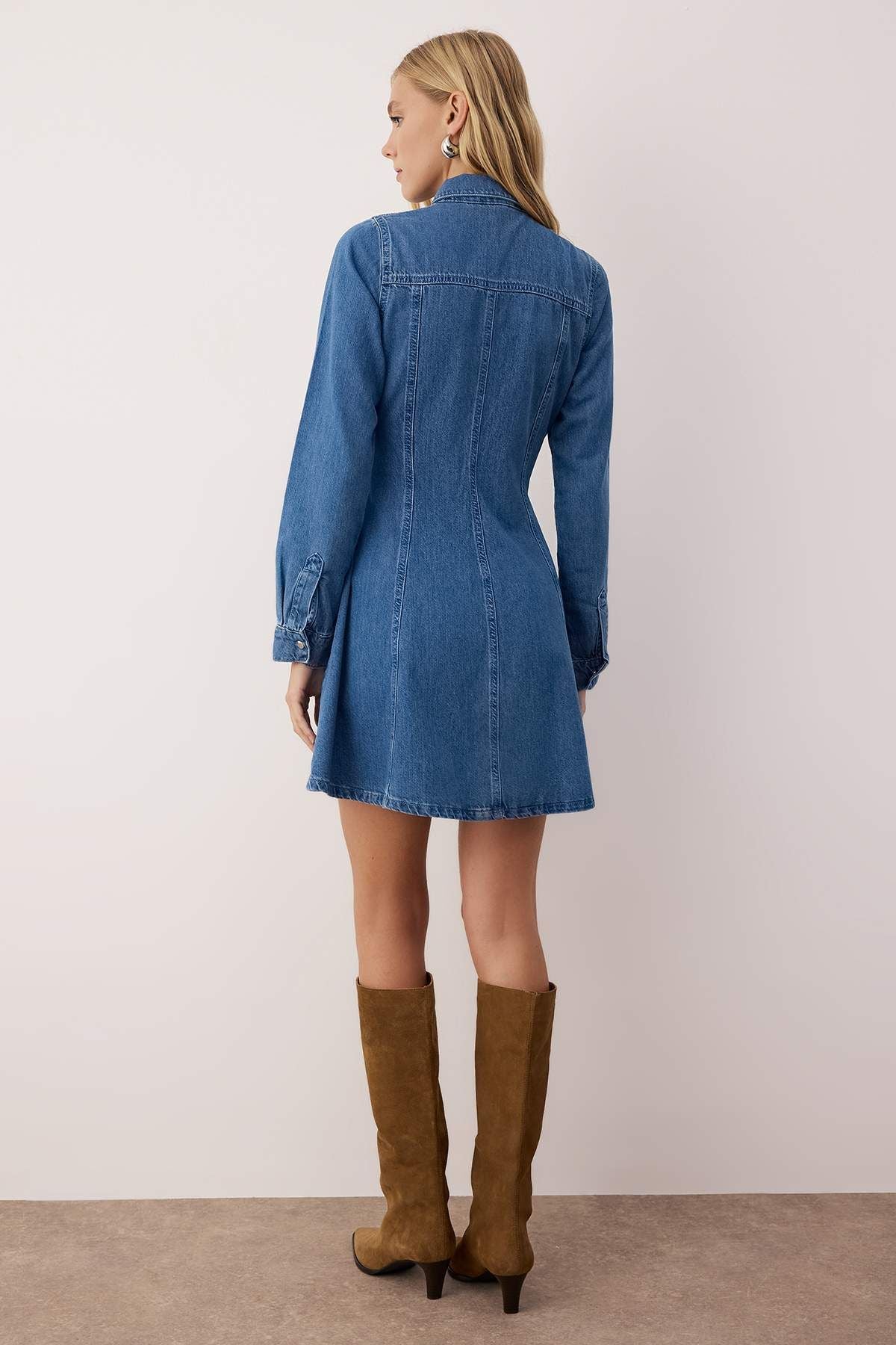 Crafted from a comfortable blend of 60% polyester and 40% cotton, this mini denim shirt dress offers a chic and versatile look. The vibrant blue hue adds a refreshing touch, while the classic shirt dress silhouette provides an effortlessly stylish appeal. Perfect for transitional weather, this dress can be paired with sneakers for a casual daytime ensemble or dressed up with boots and accessories for an evening out.