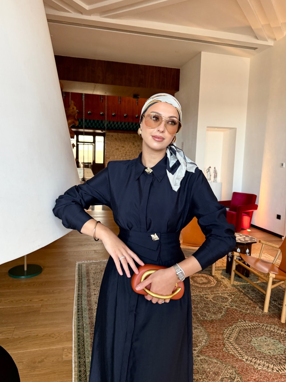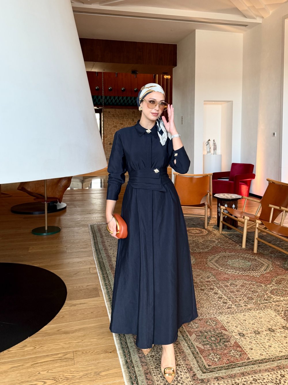 Elegant and modest buckle Dress in navy blue, crafted from premium Zara cupra fabric for a smooth and comfortable feel. This full-length dress features buttons down the front and comes with a belt at the waist for a flattering silhouette. The belt has an elasticized back for added comfort and flexibility.