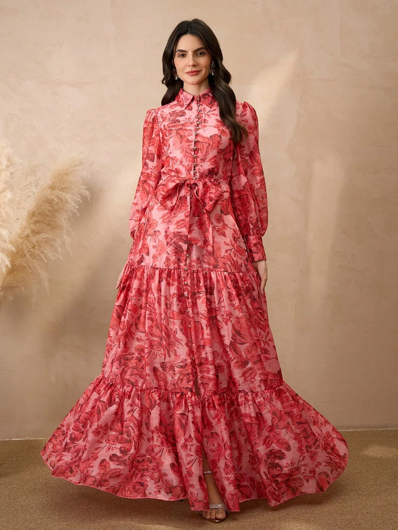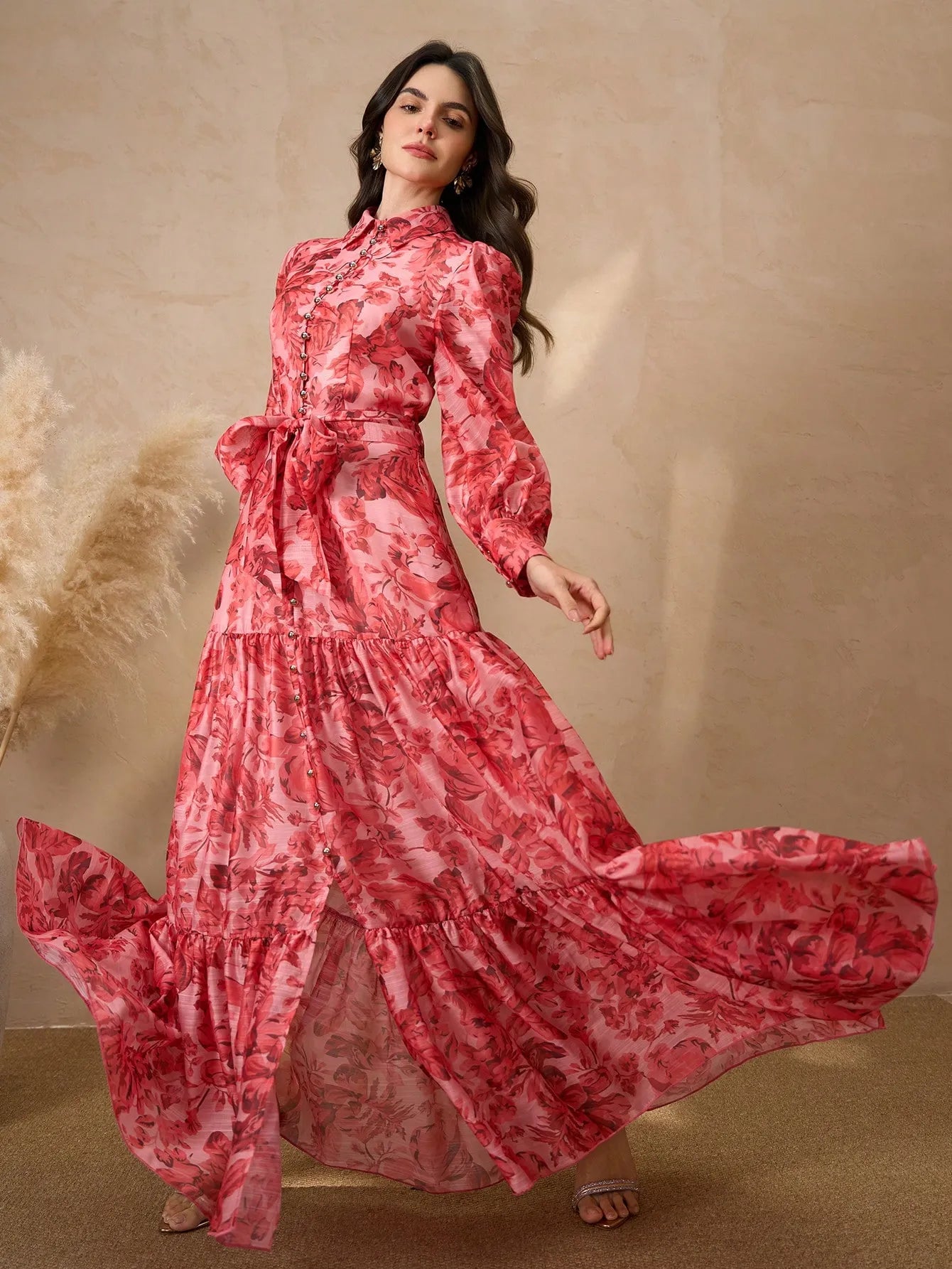 This romantic dress channels vintage charm with its floral print, button-down bodice, and layered skirt. The soft flowing tiers and decorative buttons create a graceful, feminine silhouette that’s perfect for garden parties, tea dates, or an elegant day out.