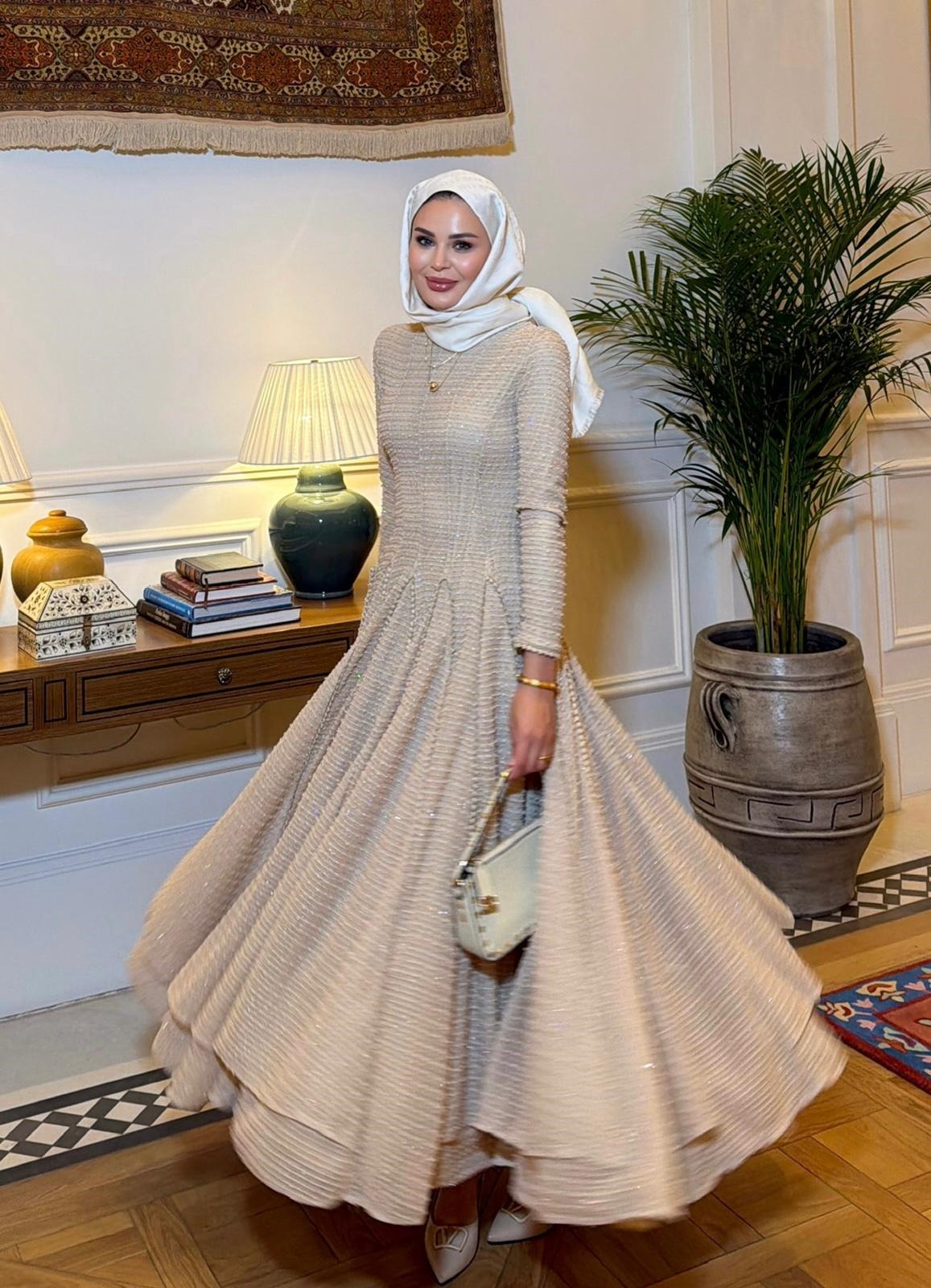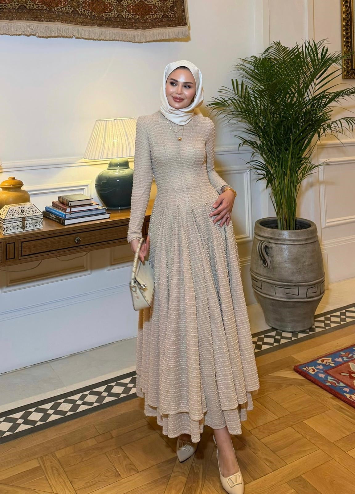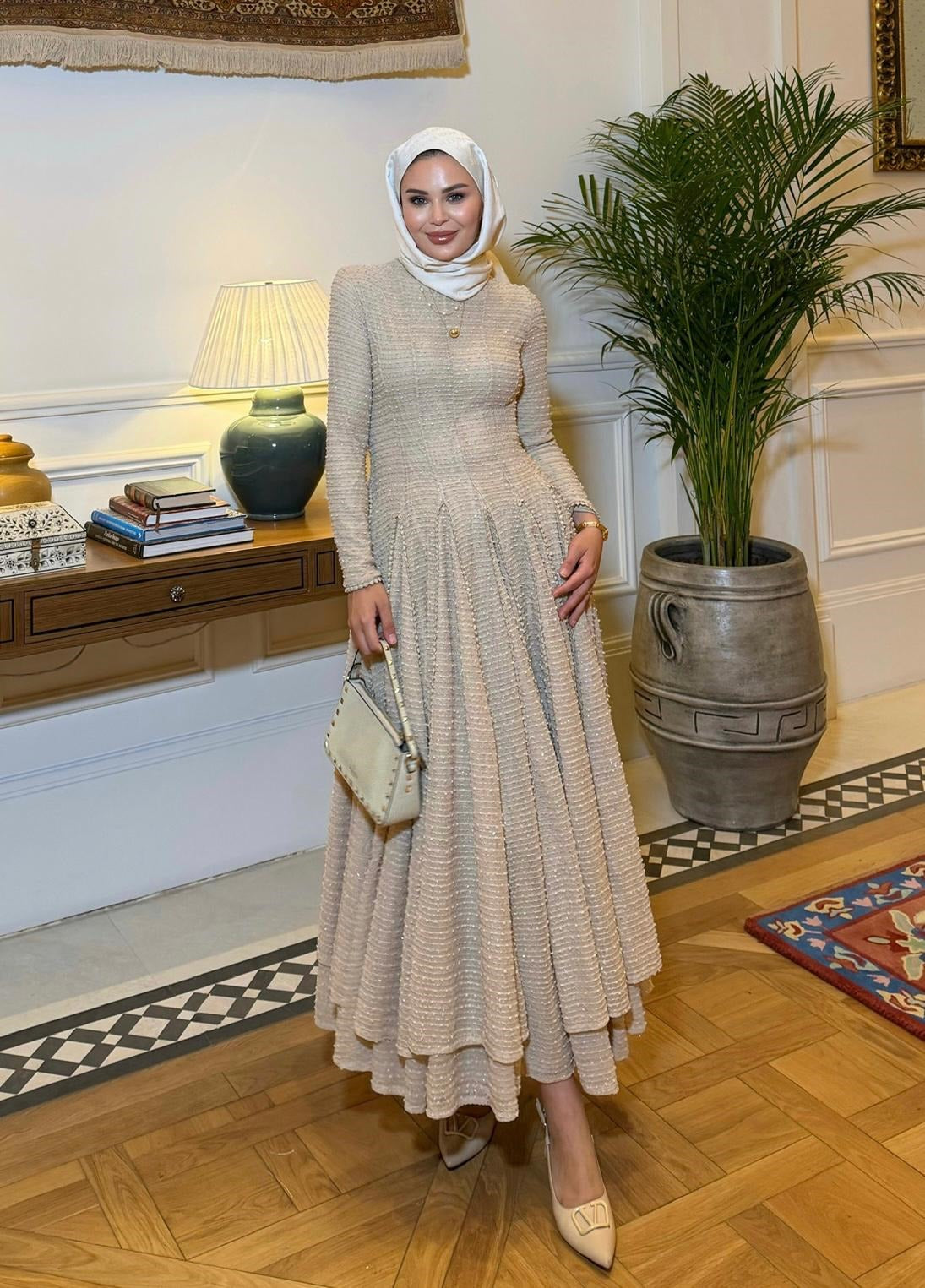 Turn every room into your runway — this cream shimmer maxi dress is crafted from a densely textured, sparkle-woven fabric that catches the light with every movement. The fitted smocked bodice gives way to a dramatically full tiered skirt, creating a silhouette that is both modest and breathtaking. Long sleeves and a high round neckline complete the elegant, occasion-ready look.