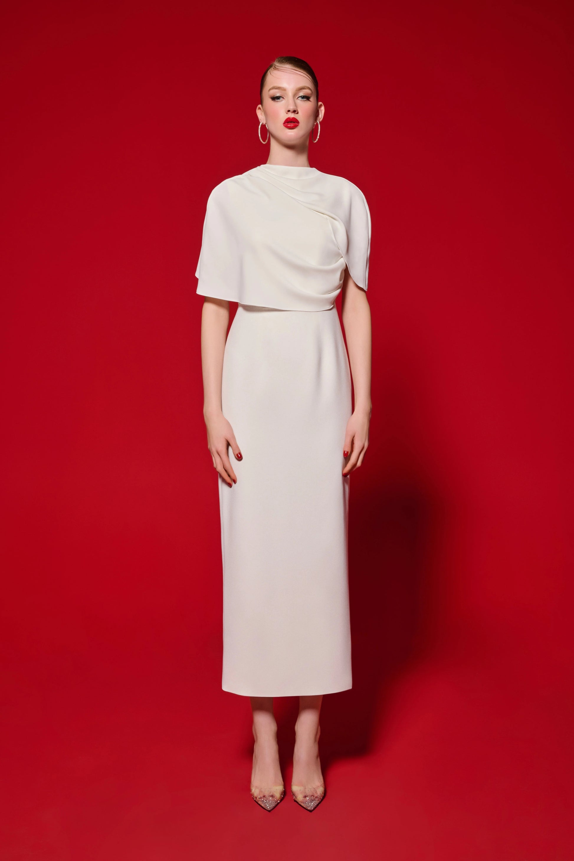 Effortlessly refined, the Flap-Detail Midi Dress in White features a striking flap-style neckline and a balanced midi length that makes it perfect for both day events and evening occasions. Made in Istanbul with a premium blend of 20% viscose and 80% polyester, this dress delivers a sleek silhouette with purposeful tailoring.