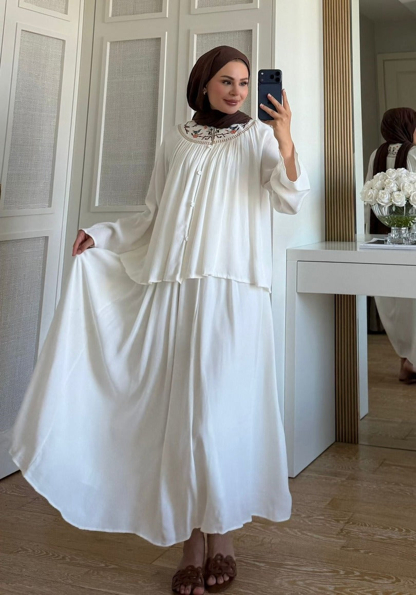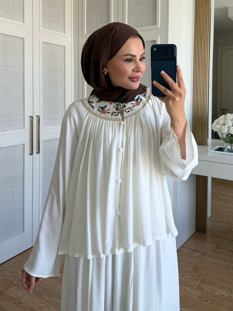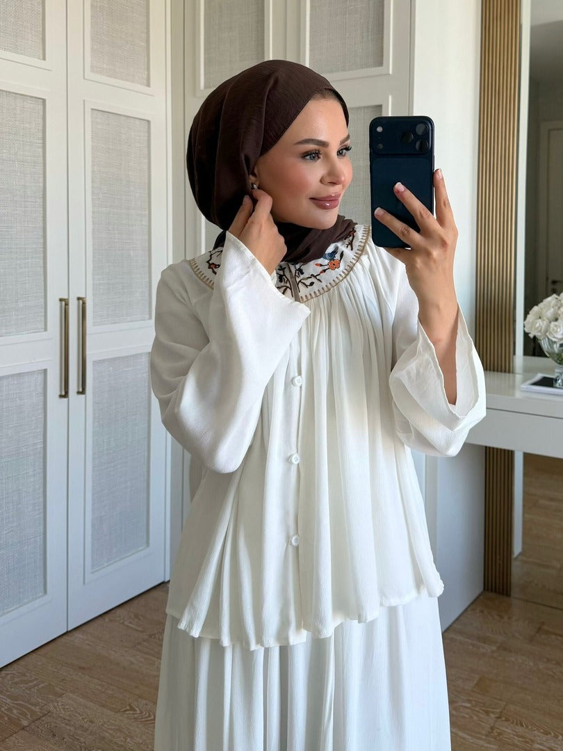 The Embroidered Set is a masterpiece of modest elegance, defined by its intricate tonal embroidery and sophisticated open-work accents. Crafted from high-quality slub linen, this duo combines artisan craftsmanship with a modern, structured silhouette.