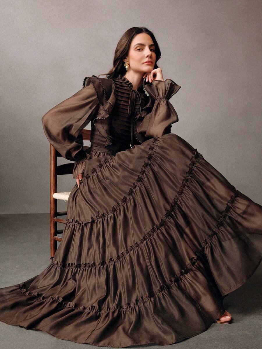 Elaire Elegant Ruched‑Hem Party Dress -Brown