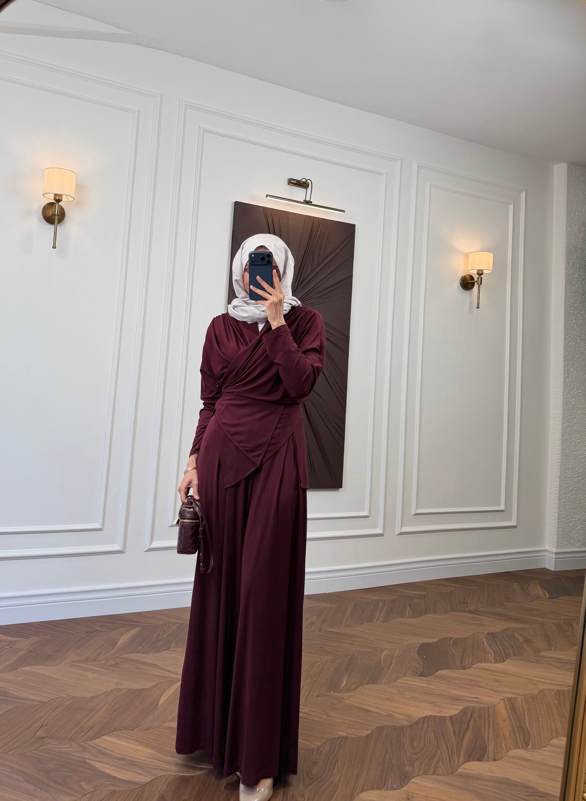 Sophistication meets comfort with the Elira Drape Two-Piece Set. Designed to offer a minimal yet modern aesthetic, this set is perfect for those seeking an effortless transition from high-end daily wear to special evening occasions. The deep burgundy tone combined with a soft, flowing silhouette makes it a standout piece for any wardrobe.