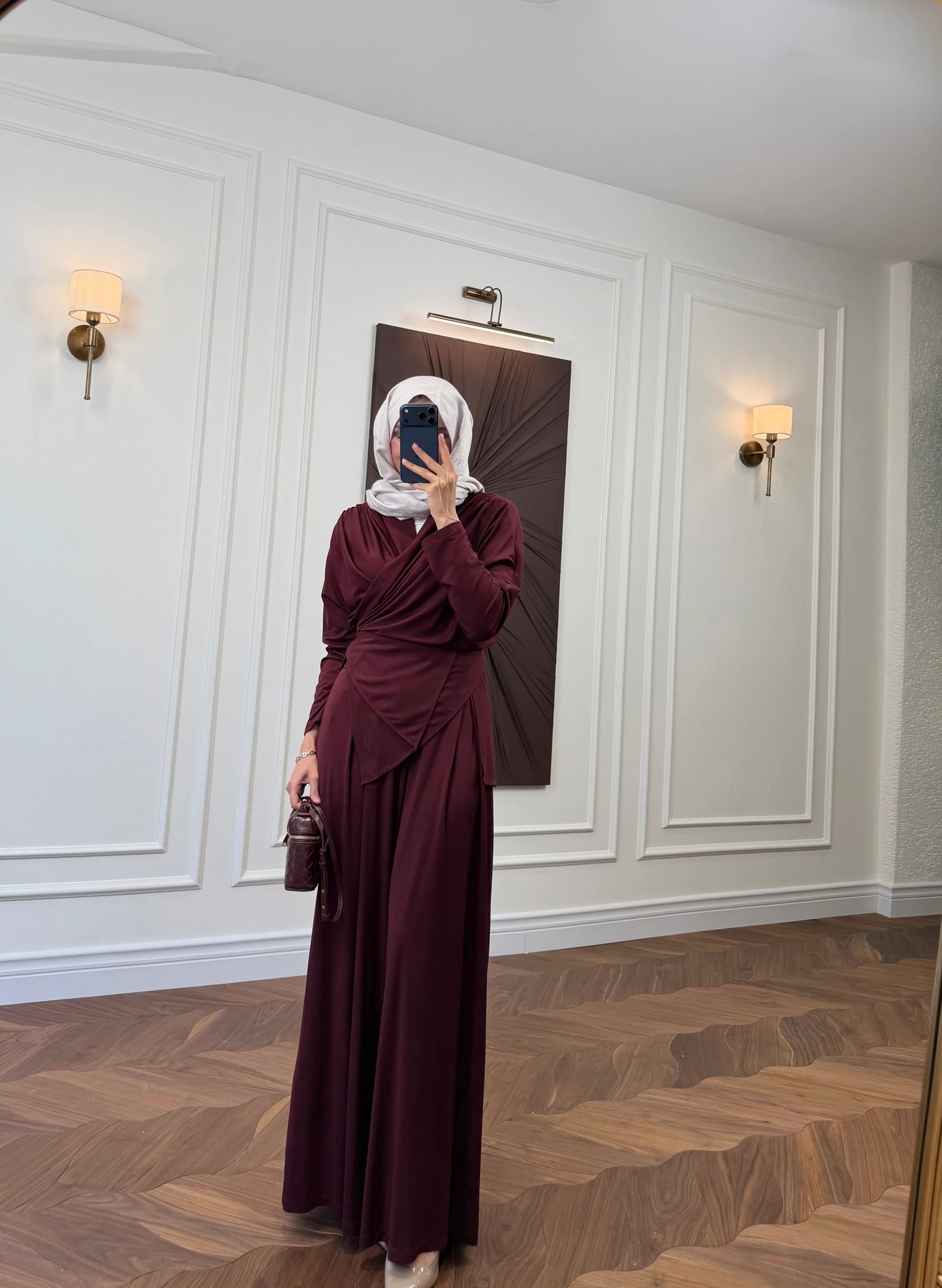 Modern Design: Features a draped top design for a contemporary look and a long, comfortable skirt for a modest yet chic finish.