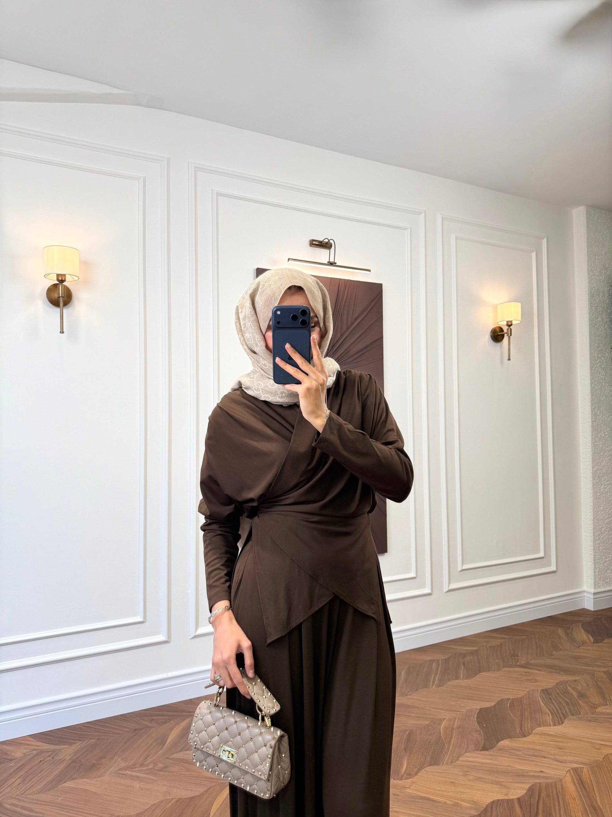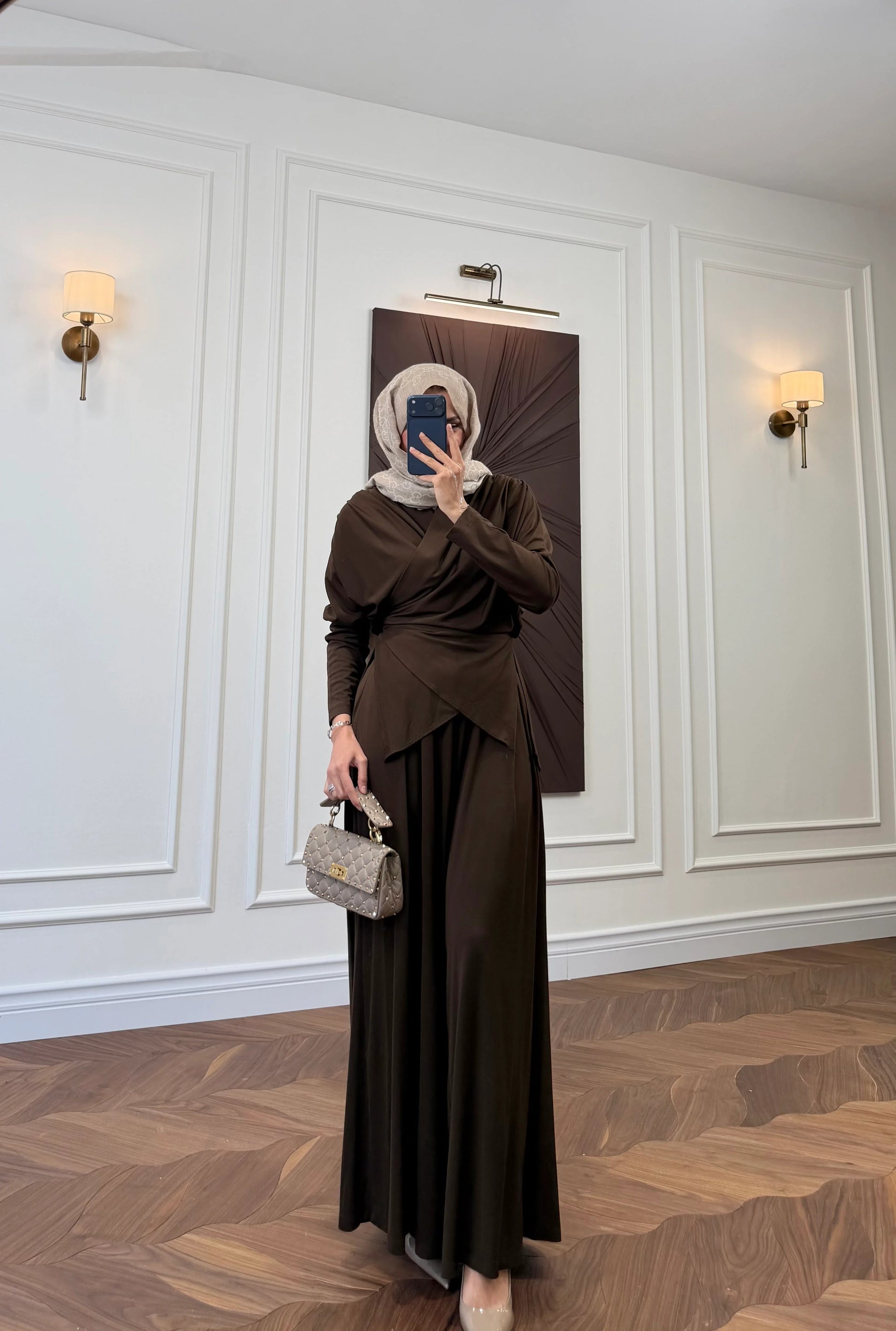 Modern Design: Features a draped top design for a contemporary look and a long, comfortable skirt for a modest yet chic finish.