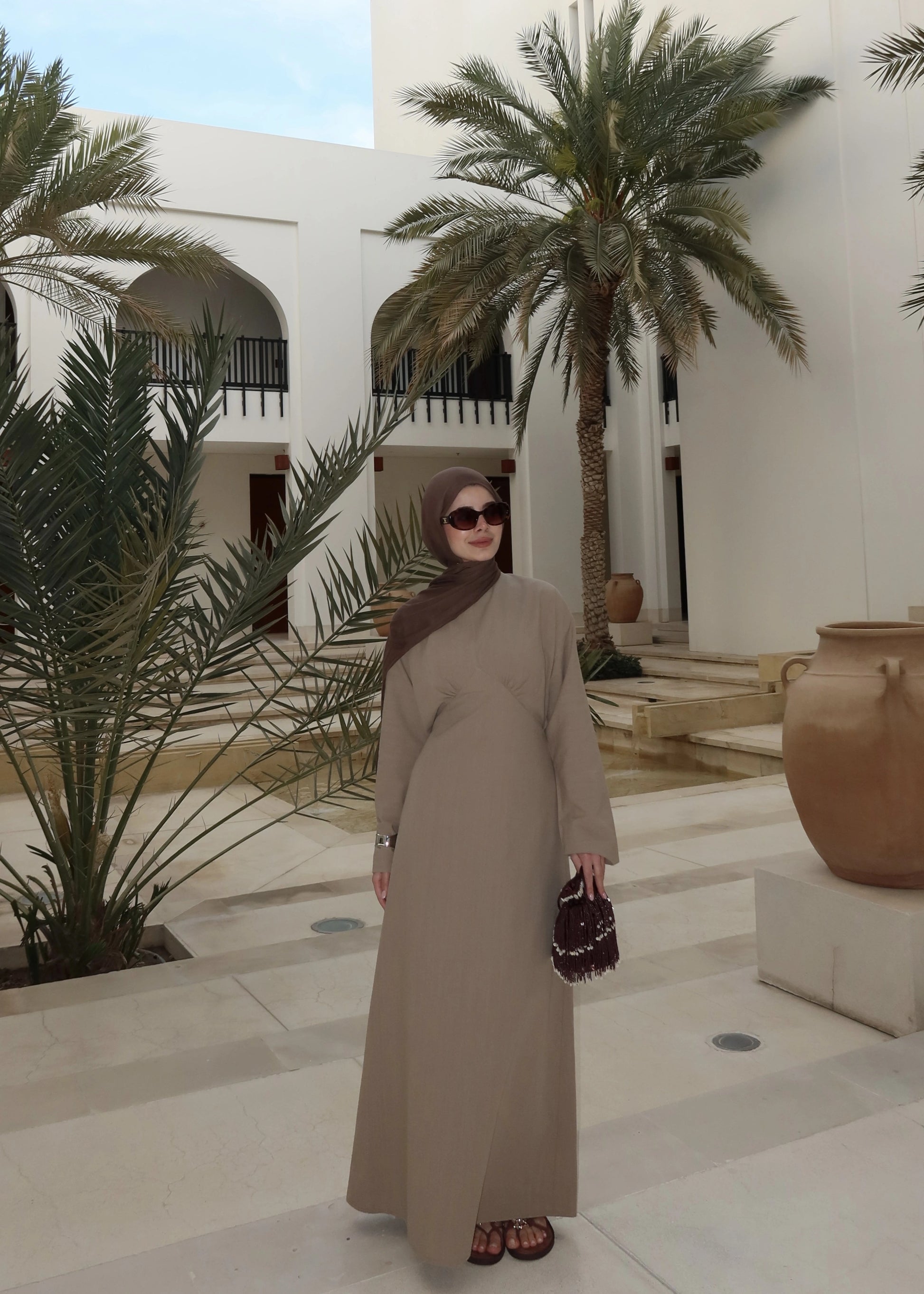 Khaki Cotton Tie-Back Maxi Dress - Waist Detail Long Sleeve Gown