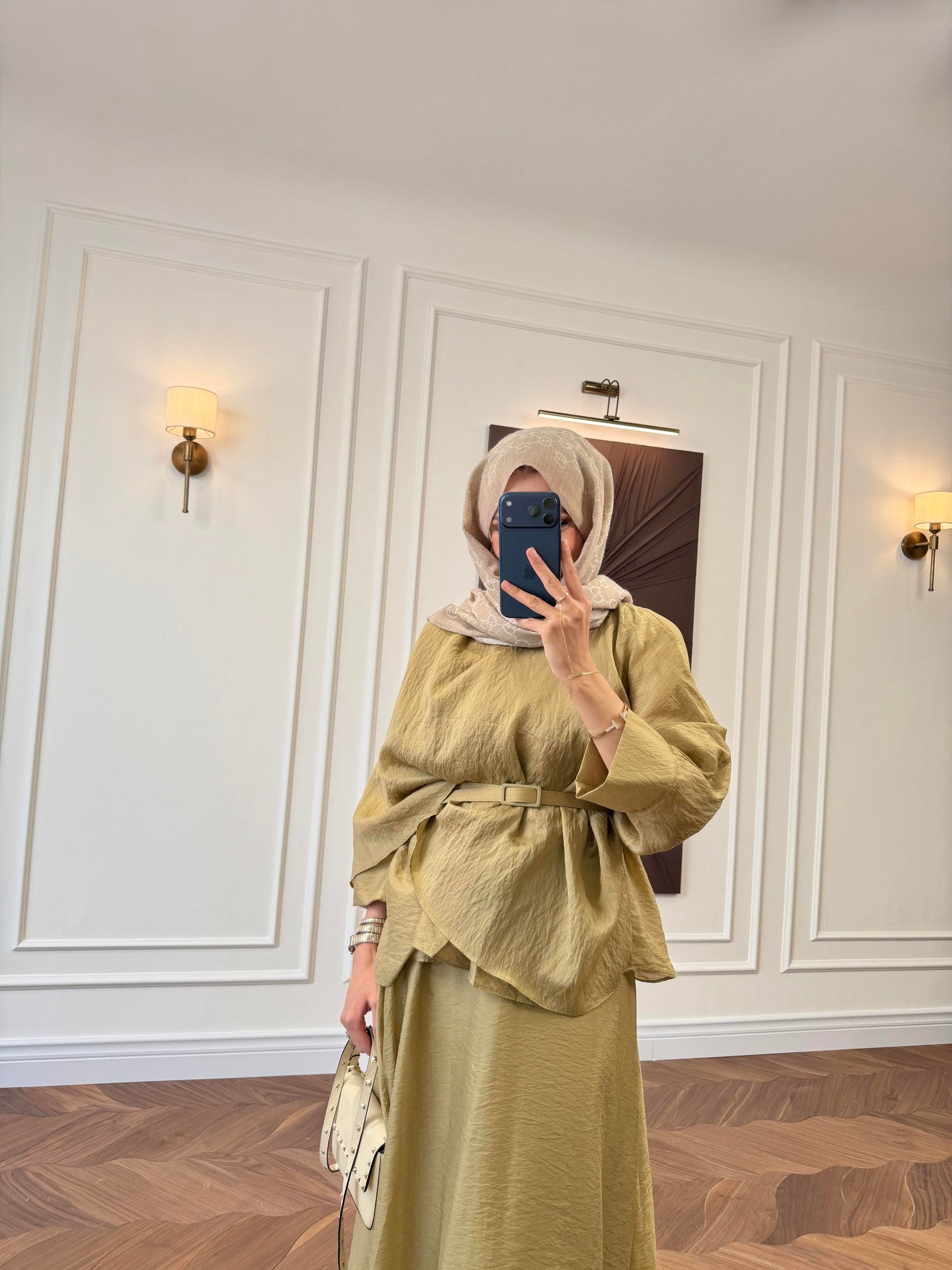 Dress with intention — this belted co-ord set is designed for women who want to look polished without compromising on modesty. The structured yet flowing cape-sleeve top is cinched at the waist with a matching belt, creating a defined silhouette, while the full flared maxi skirt moves beautifully with every step.