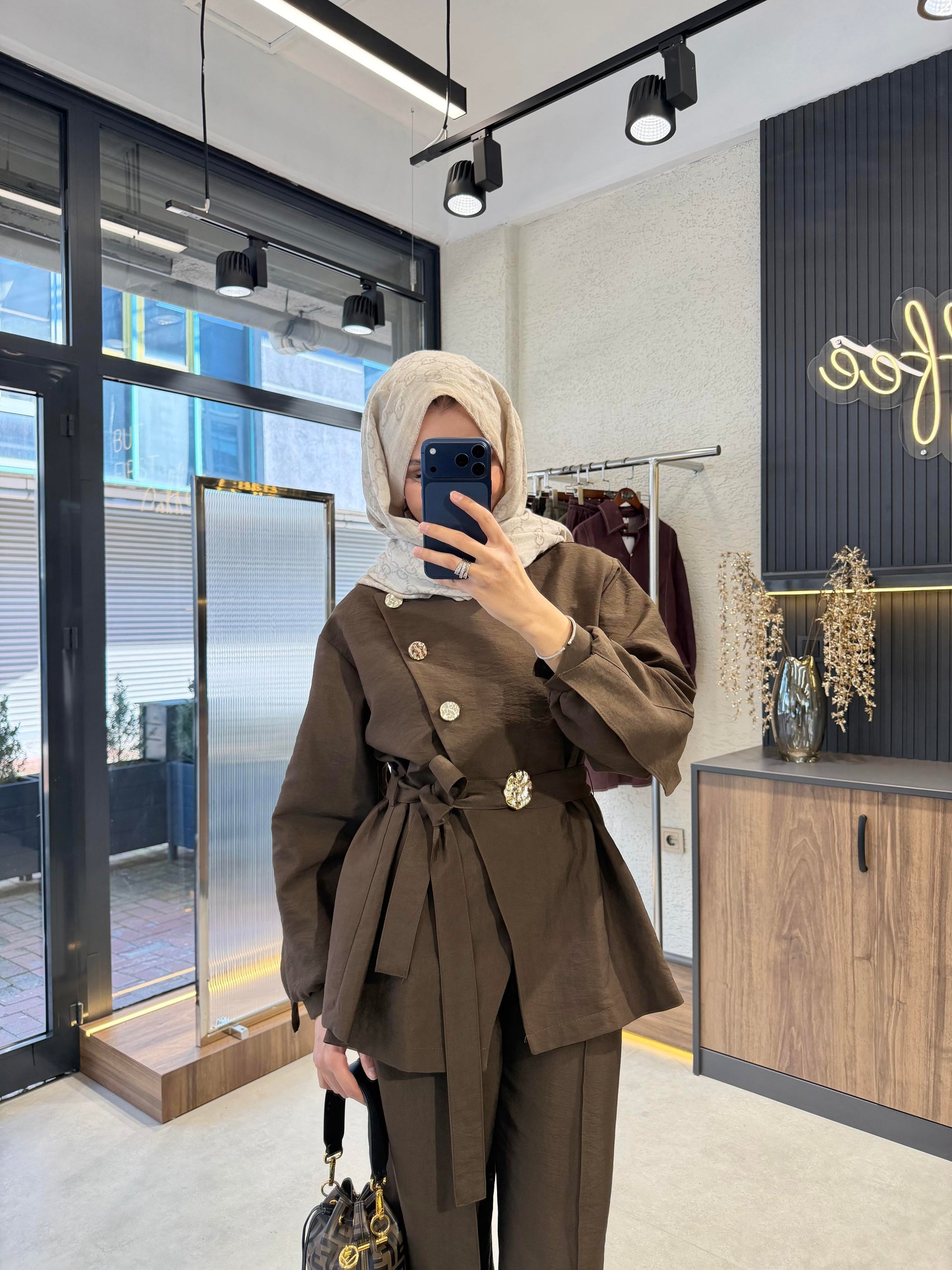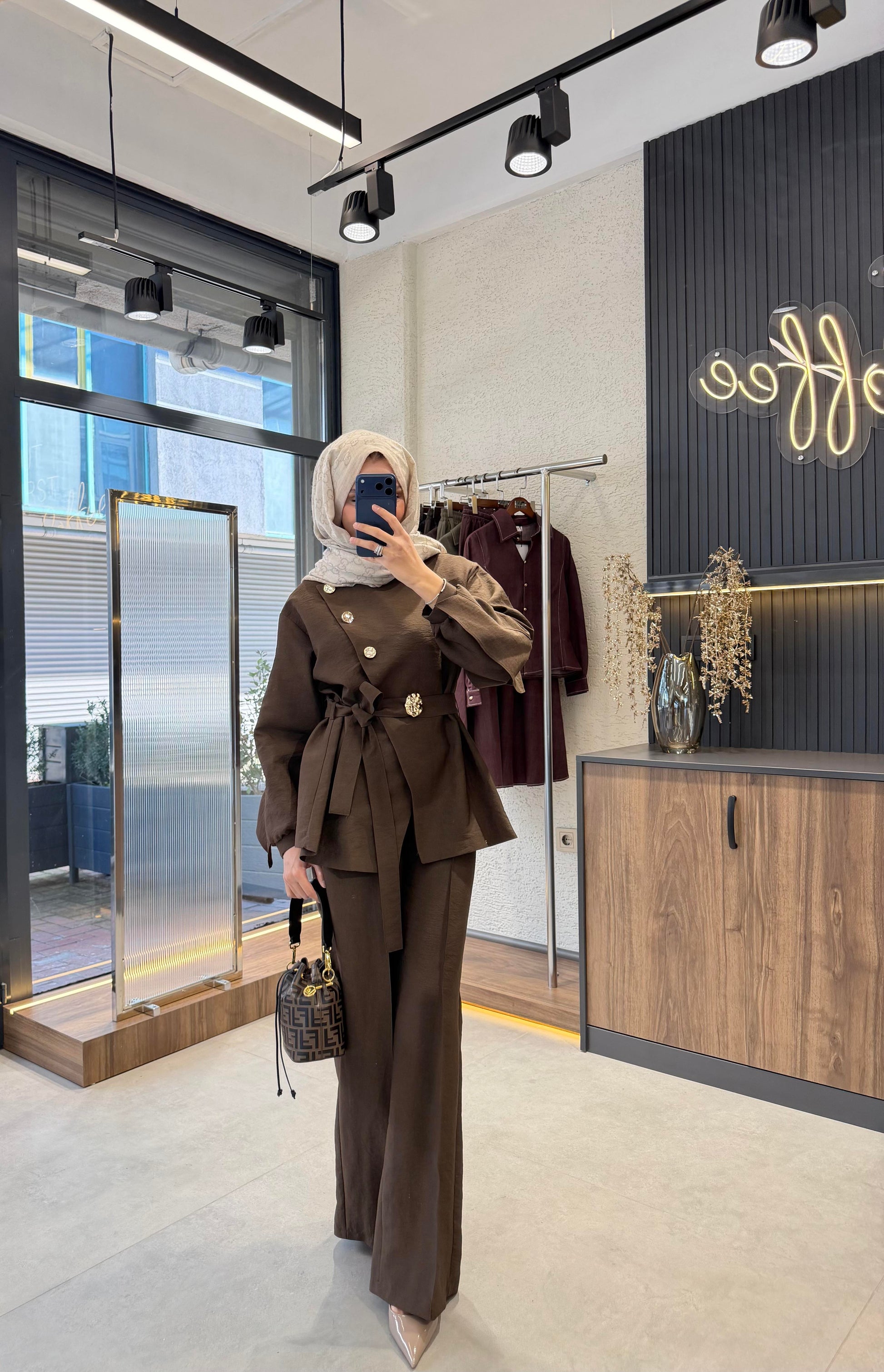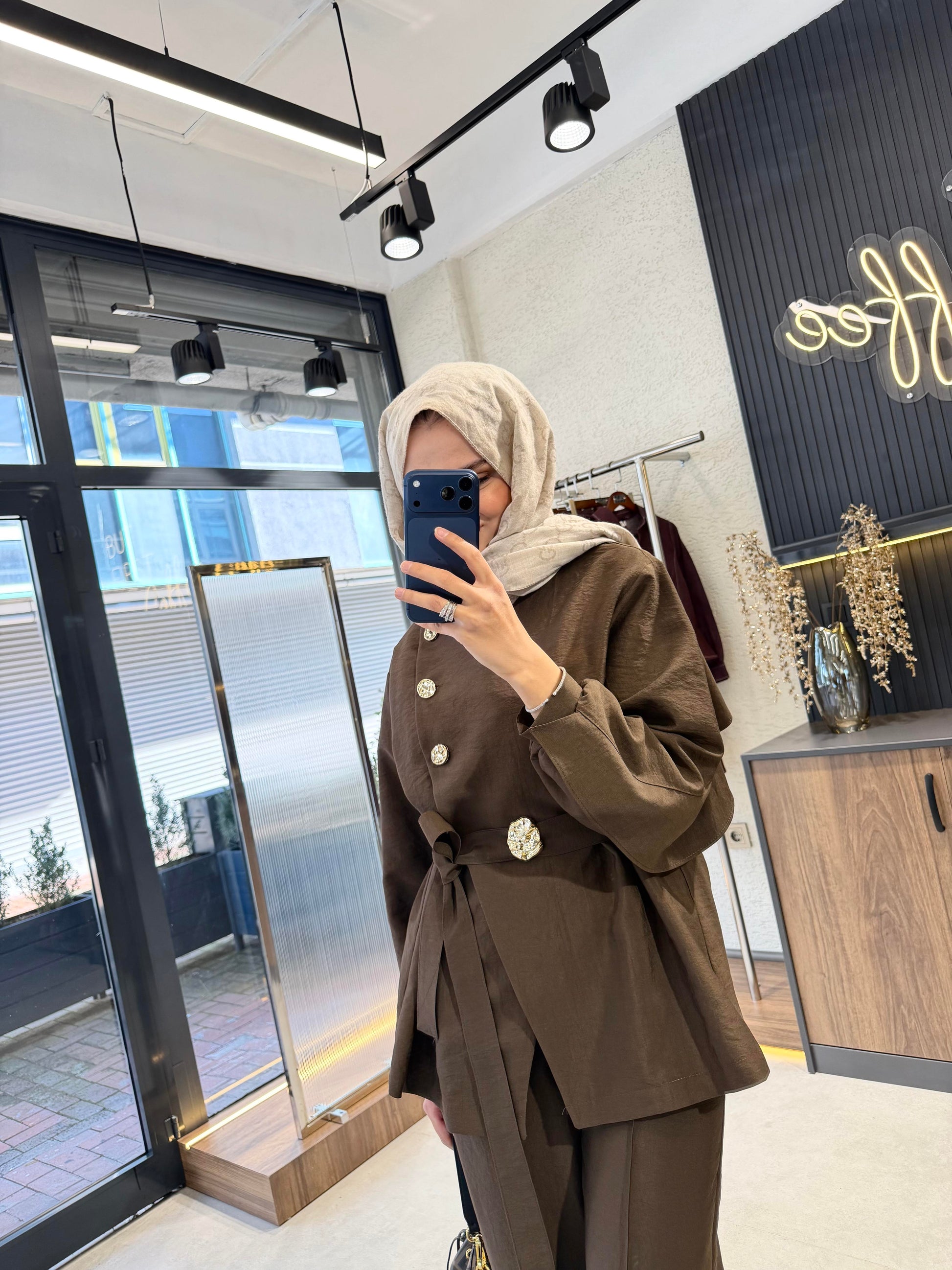 Luxury Gold Button Cupro Two-Piece Set- Brown