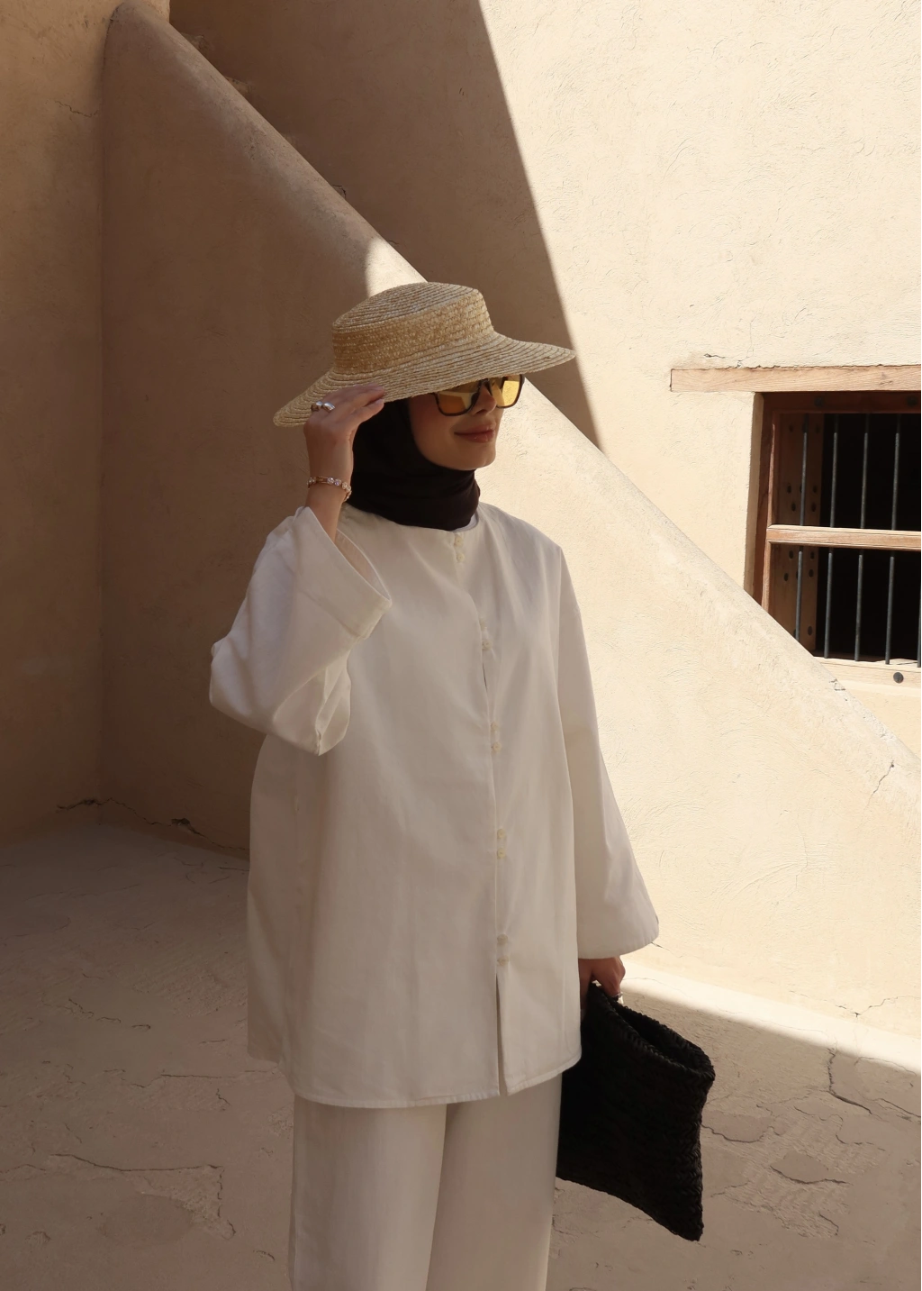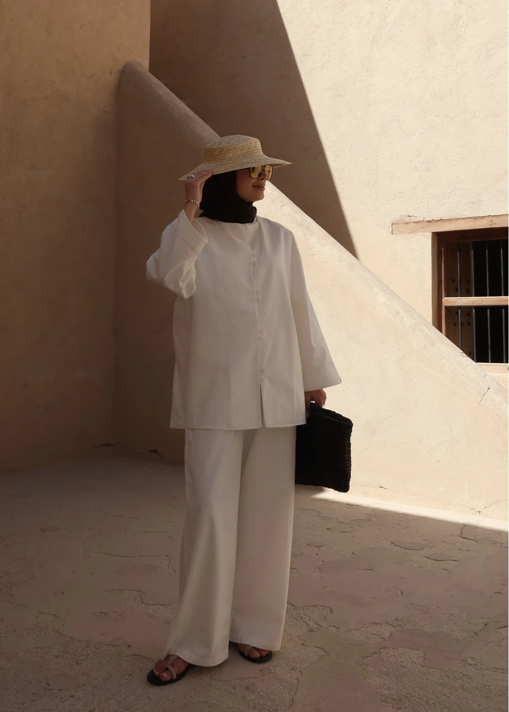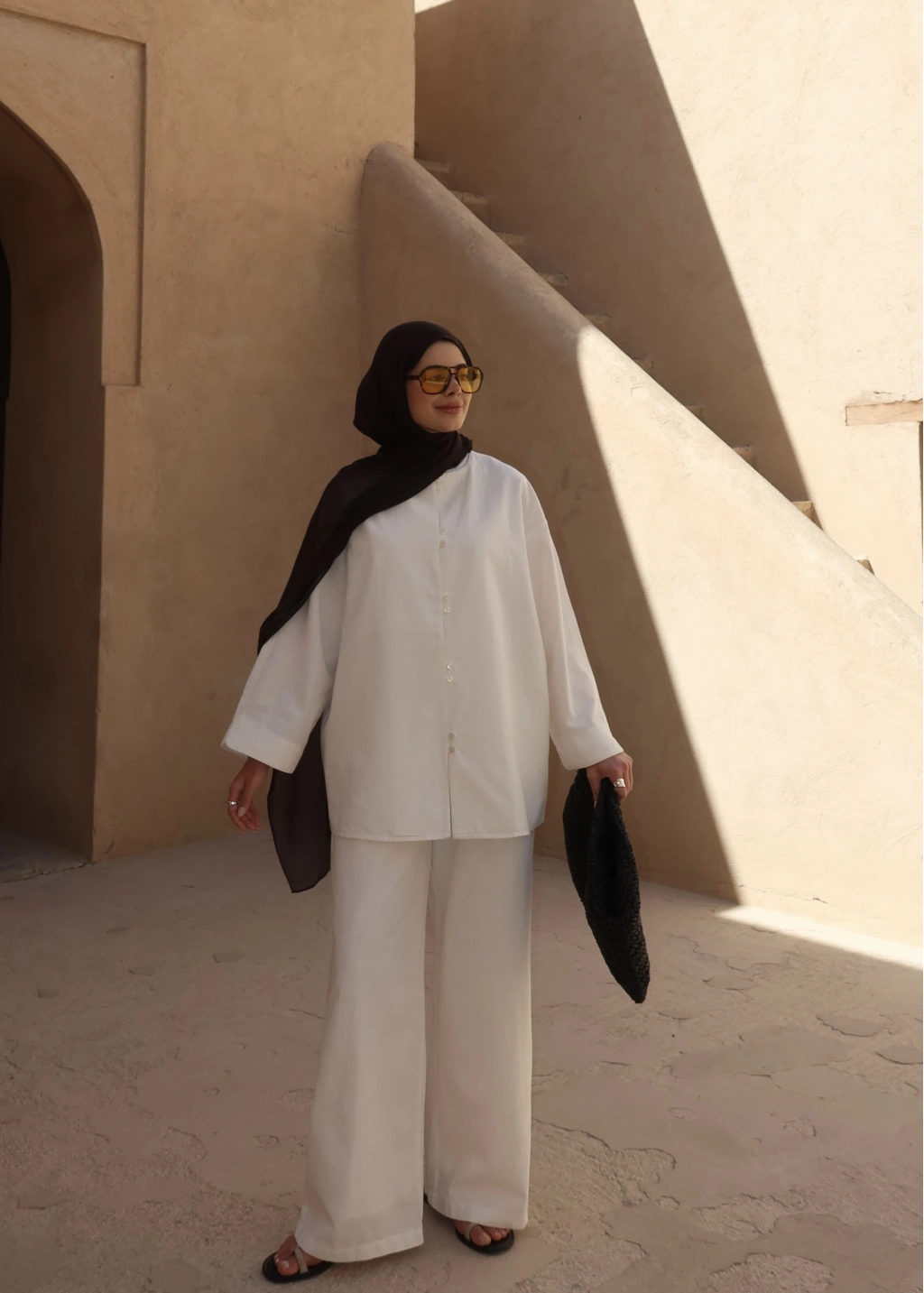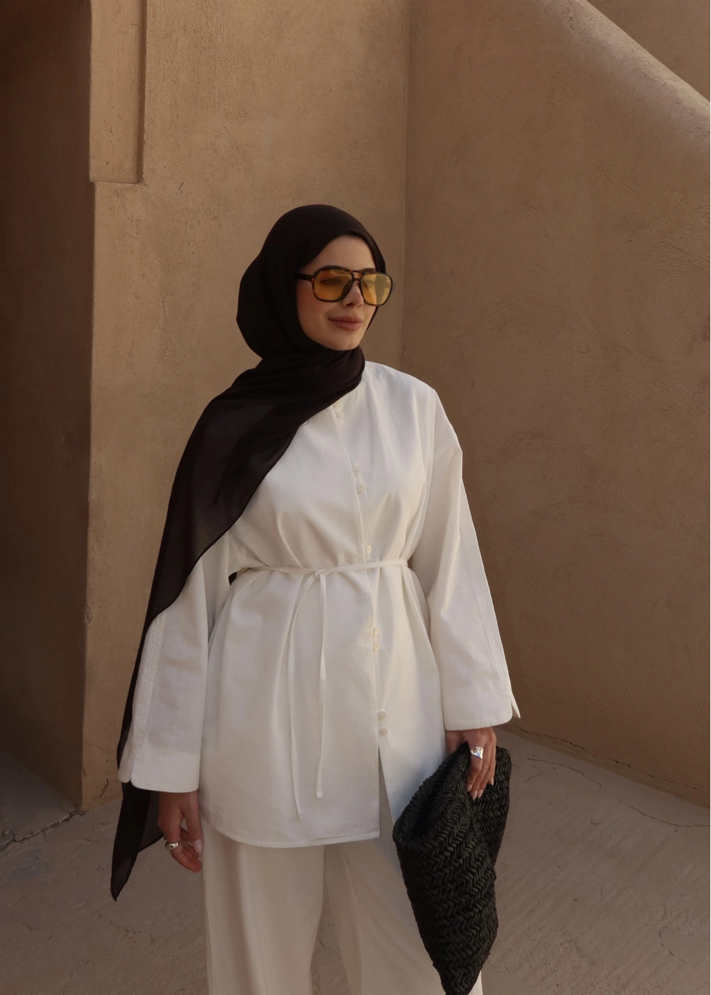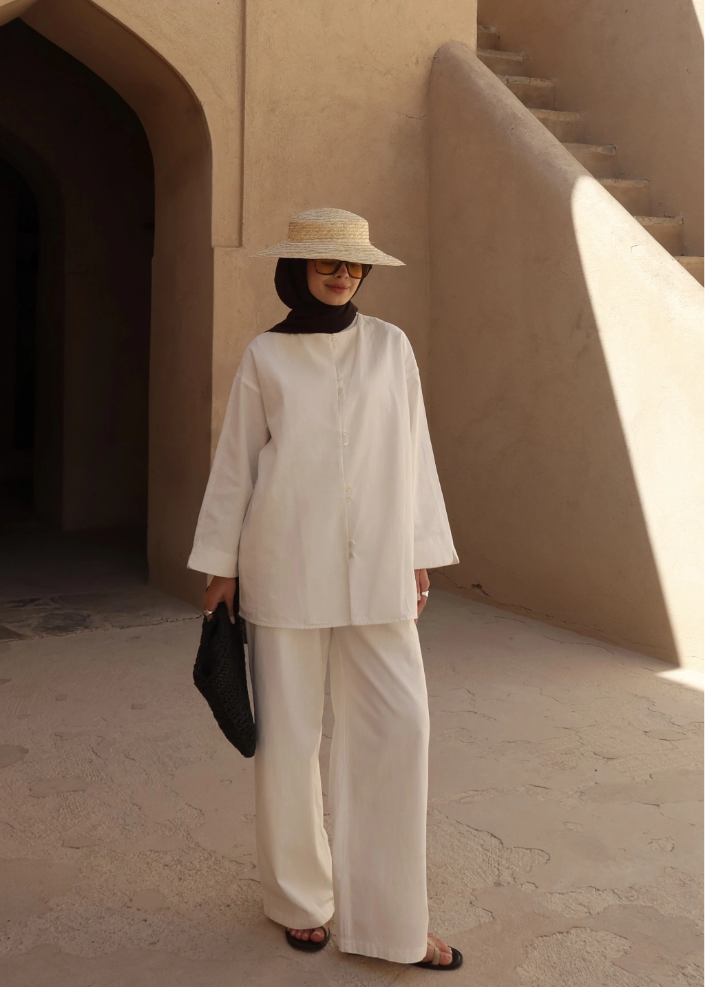 Effortless tailoring meets breathable comfort. The Mocha Button Detail Linen Set is crafted from 100% cotton with a natural linen look, offering a structured yet relaxed silhouette. Designed for modest elegance and everyday wear, this two-piece set features a standard-fit top and adjustable elastic waist trousers.