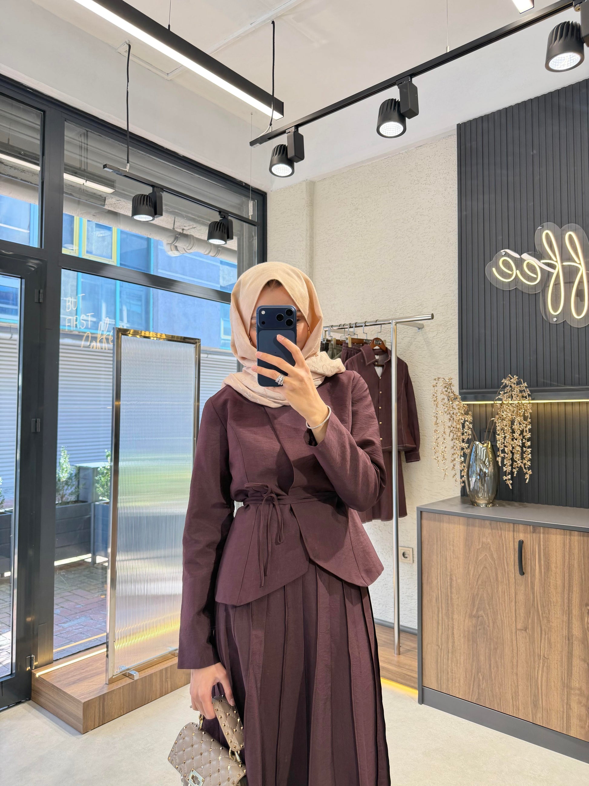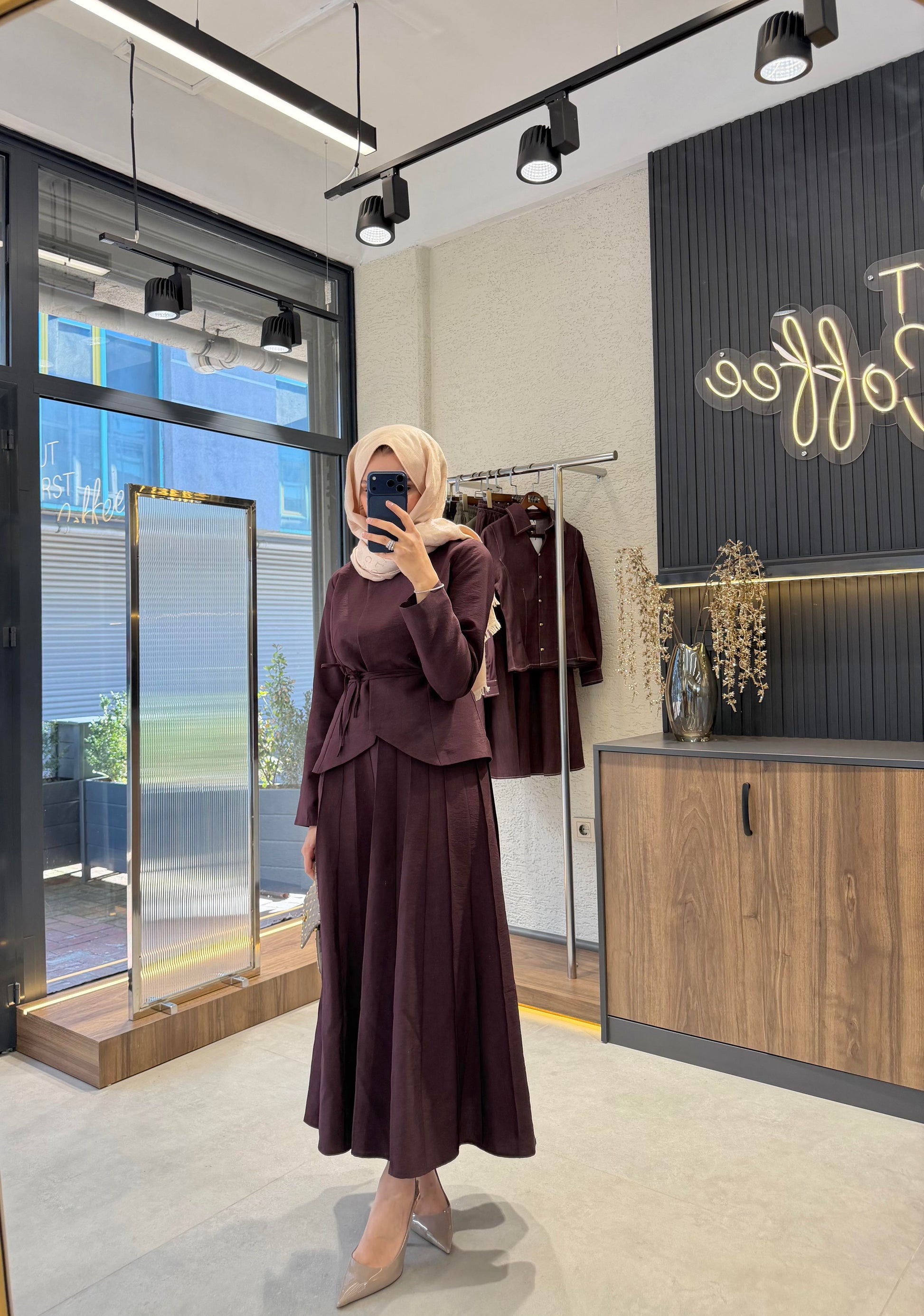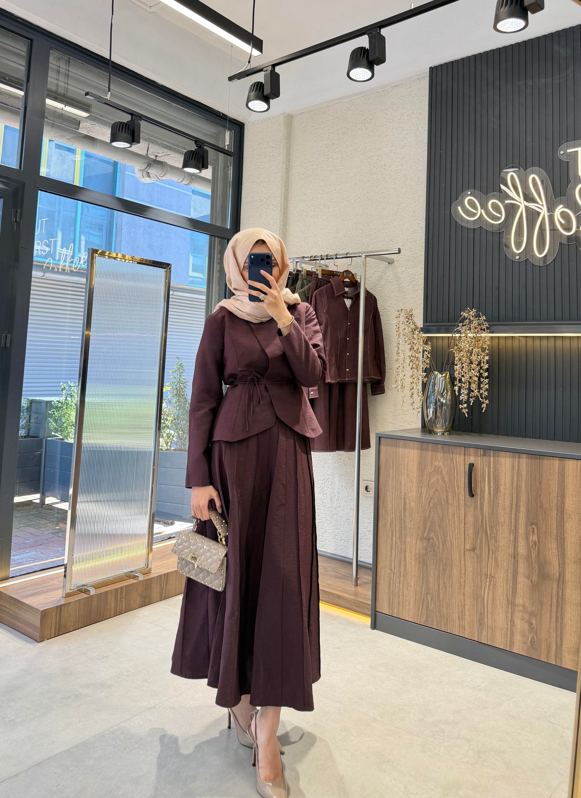 The Nora Pleated Skirt Set – Brown is made from premium cupra fabric with a soft and fluid texture. The jacket-style top is lined, while the pleated skirt is unlined, offering comfort and elegant movement.