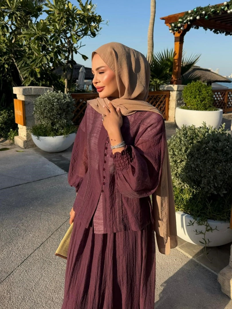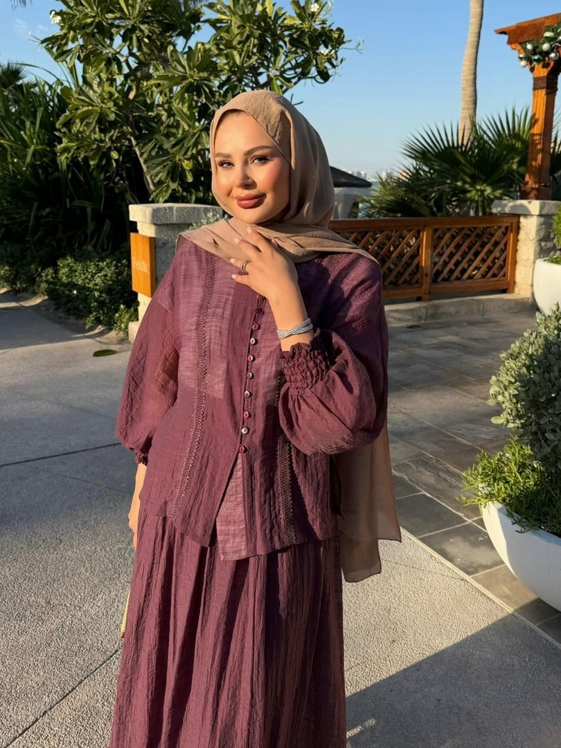 Understated, sun-kissed and utterly wearable — this lace-trim co-ord set is your new warm-weather essential. The relaxed blouse features a delicate lace trim running down the button-front placket, smocked balloon cuffs for a soft feminine touch, and a gently flared hem that sits beautifully over the matching maxi skirt. The flowing skirt mirrors the blouse with a matching lace trim along the hem, tying the whole look together with effortless elegance.