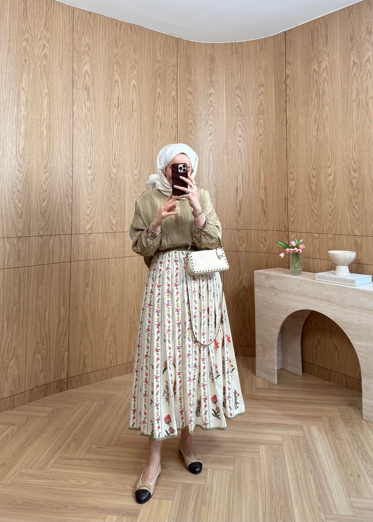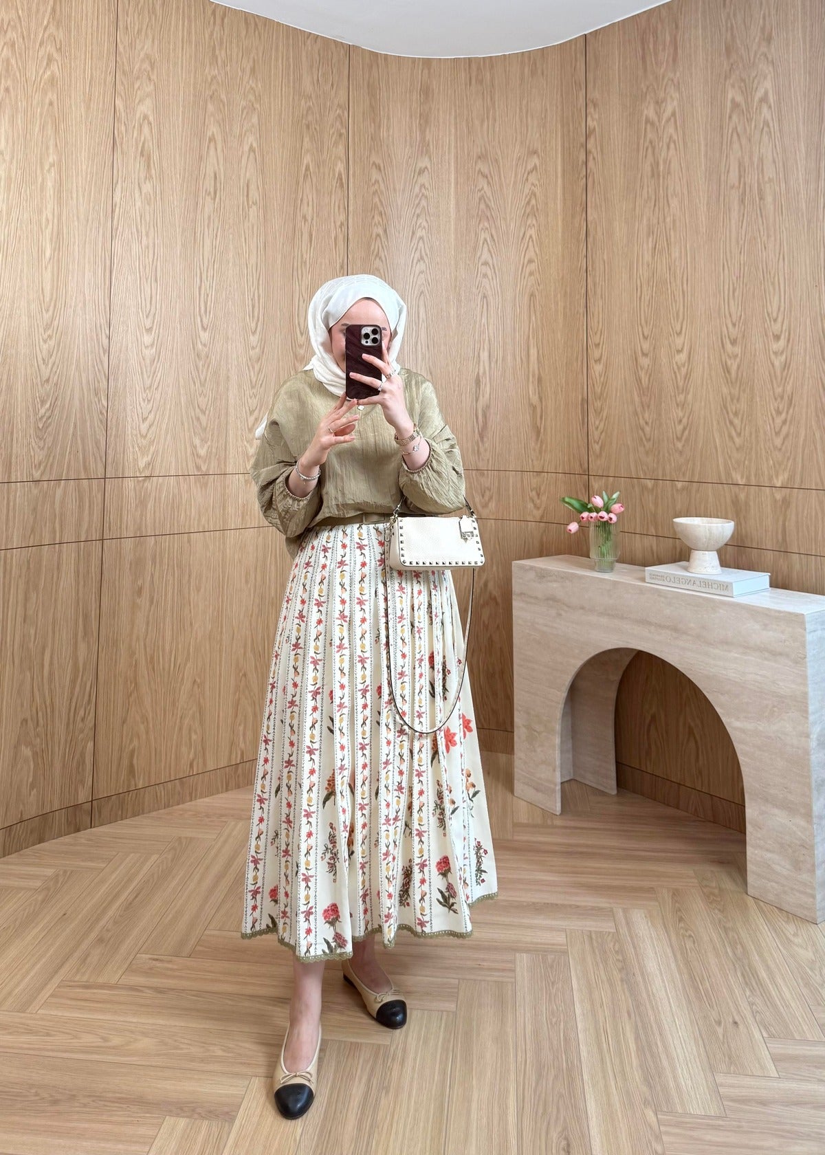 Lily Co-ord Set — Beige Textured Blouse & Floral Pleated Midi Skirt