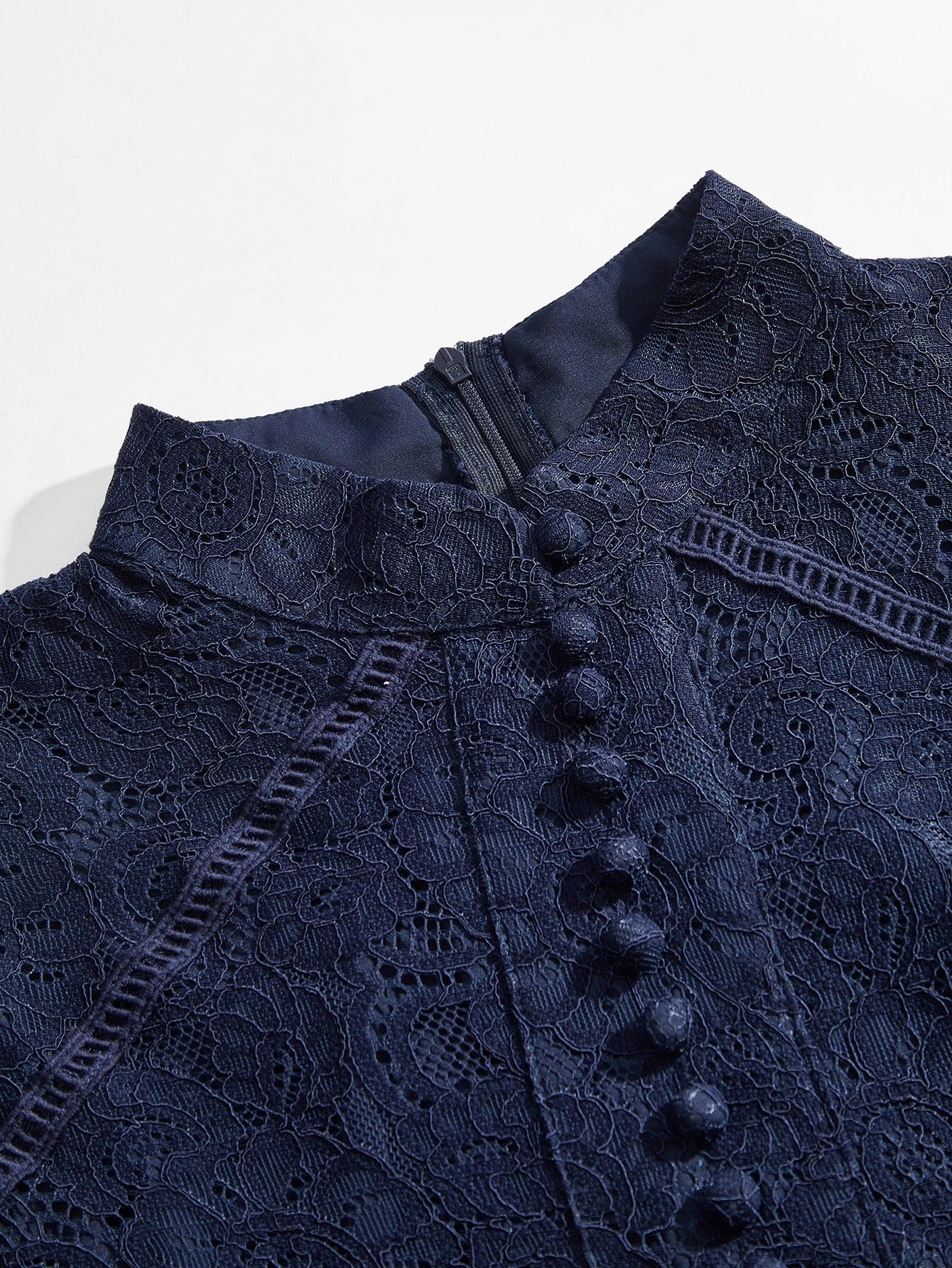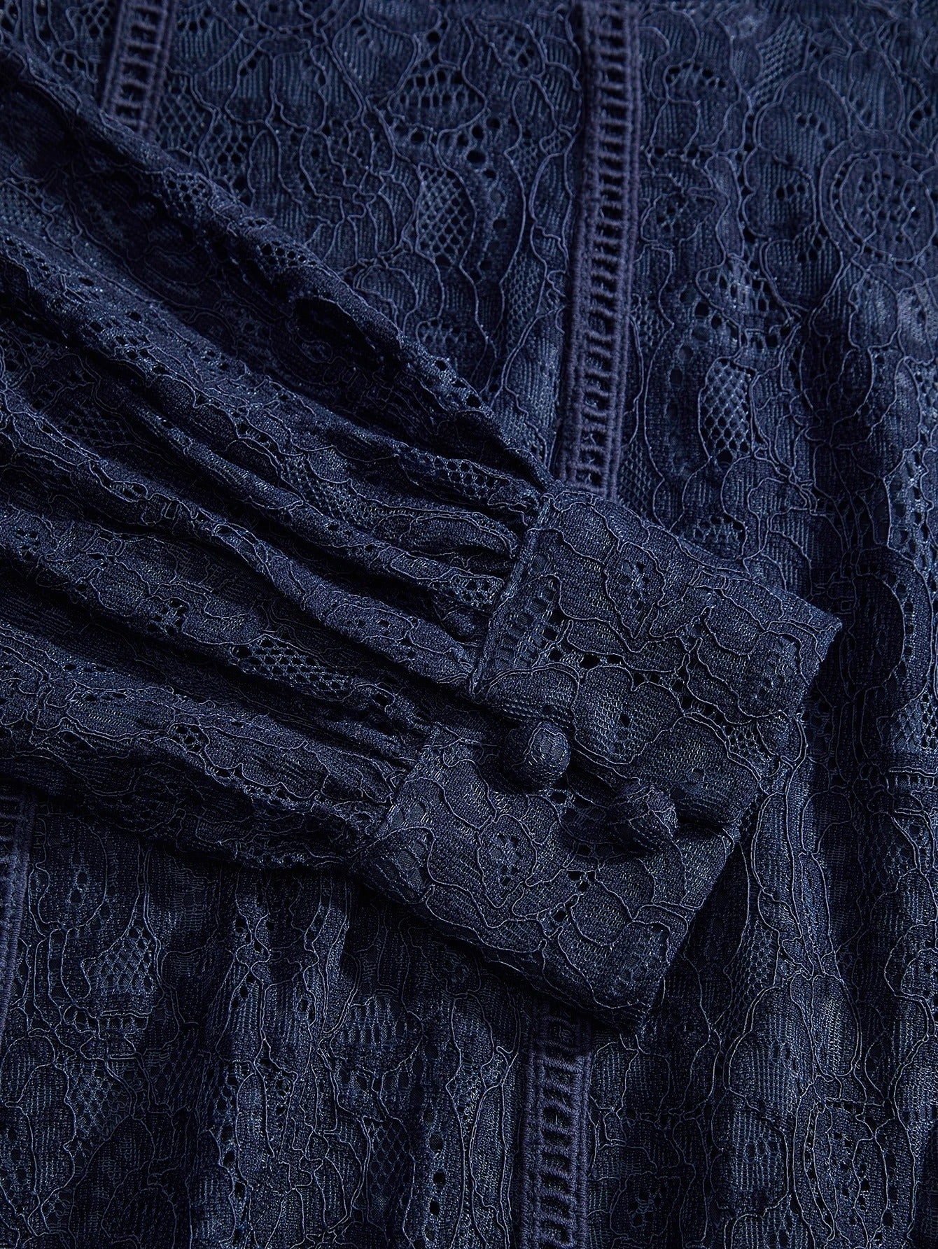 Long‑Sleeve Rose Lace Maxi Dress – Navy Blue