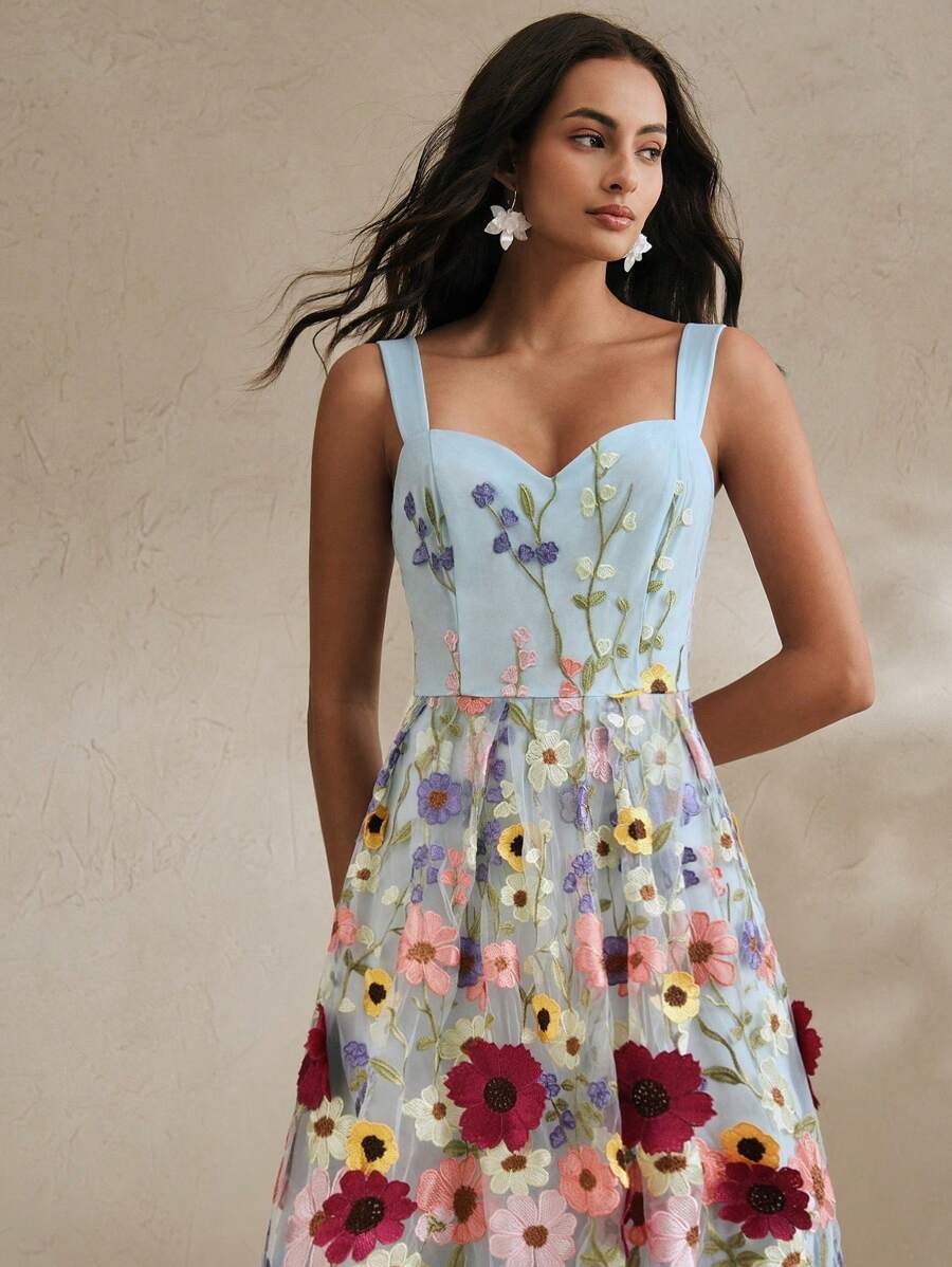 This breezy slip-style maxi dress features 3D floral embroidery for a romantic, textured look. Ideal for beach vacations, summer festivals, or casual elegant outings.