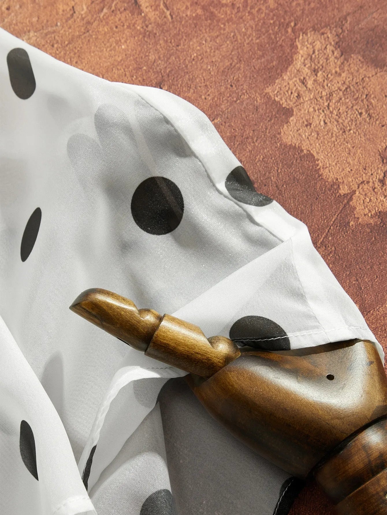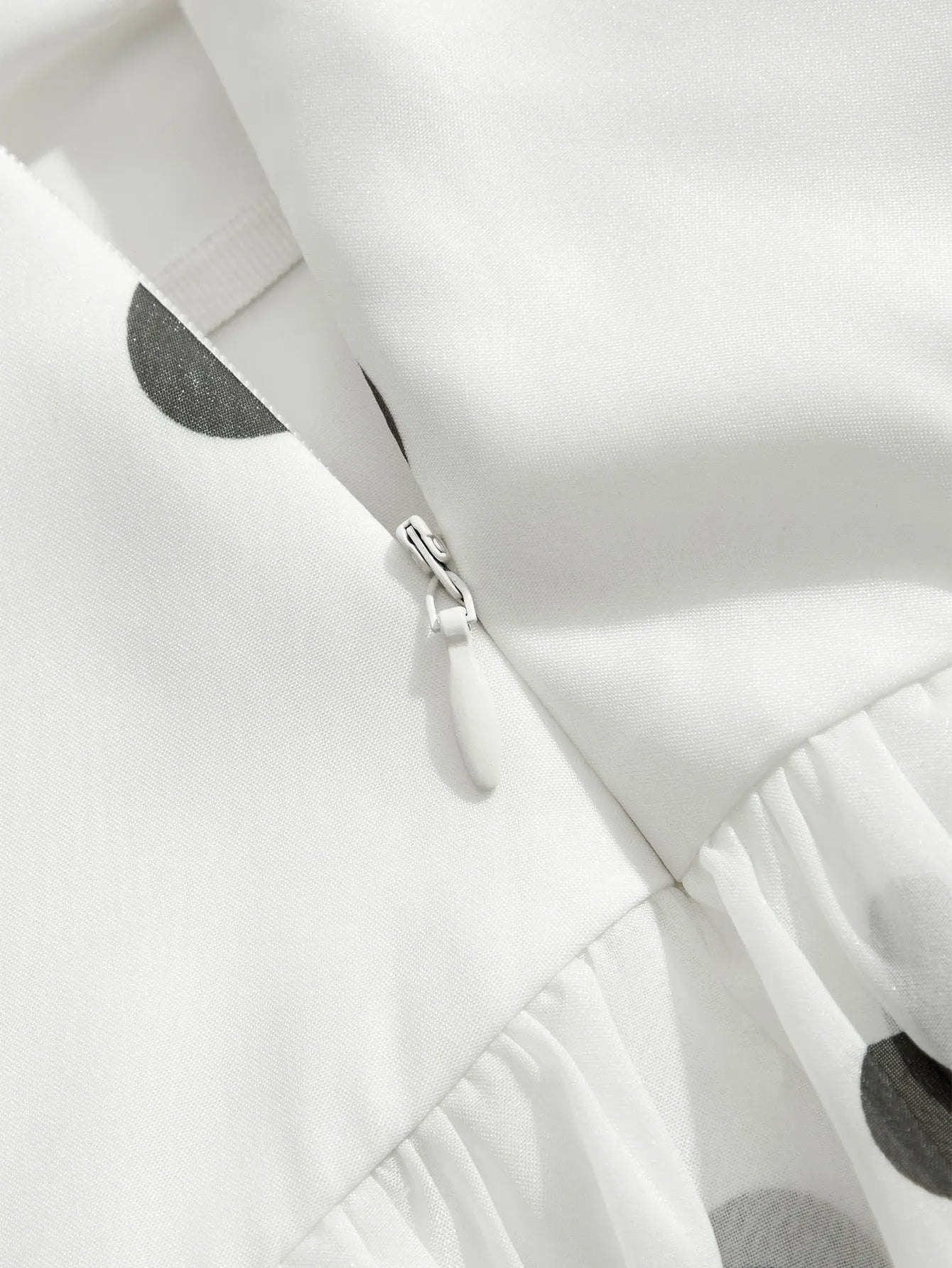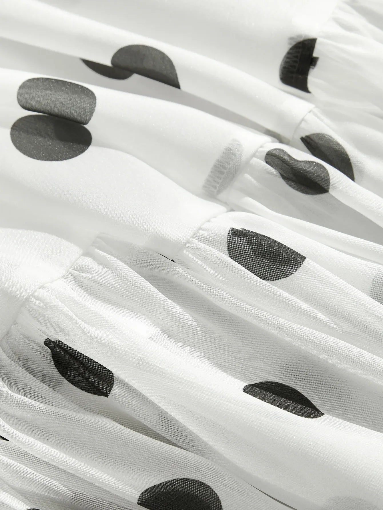 A playful and romantic skirt designed for spring and summer vacations. Featuring a polka dot pattern, a ruffled yoke, and a flounce hem that creates a light, flowing “cake” silhouette.