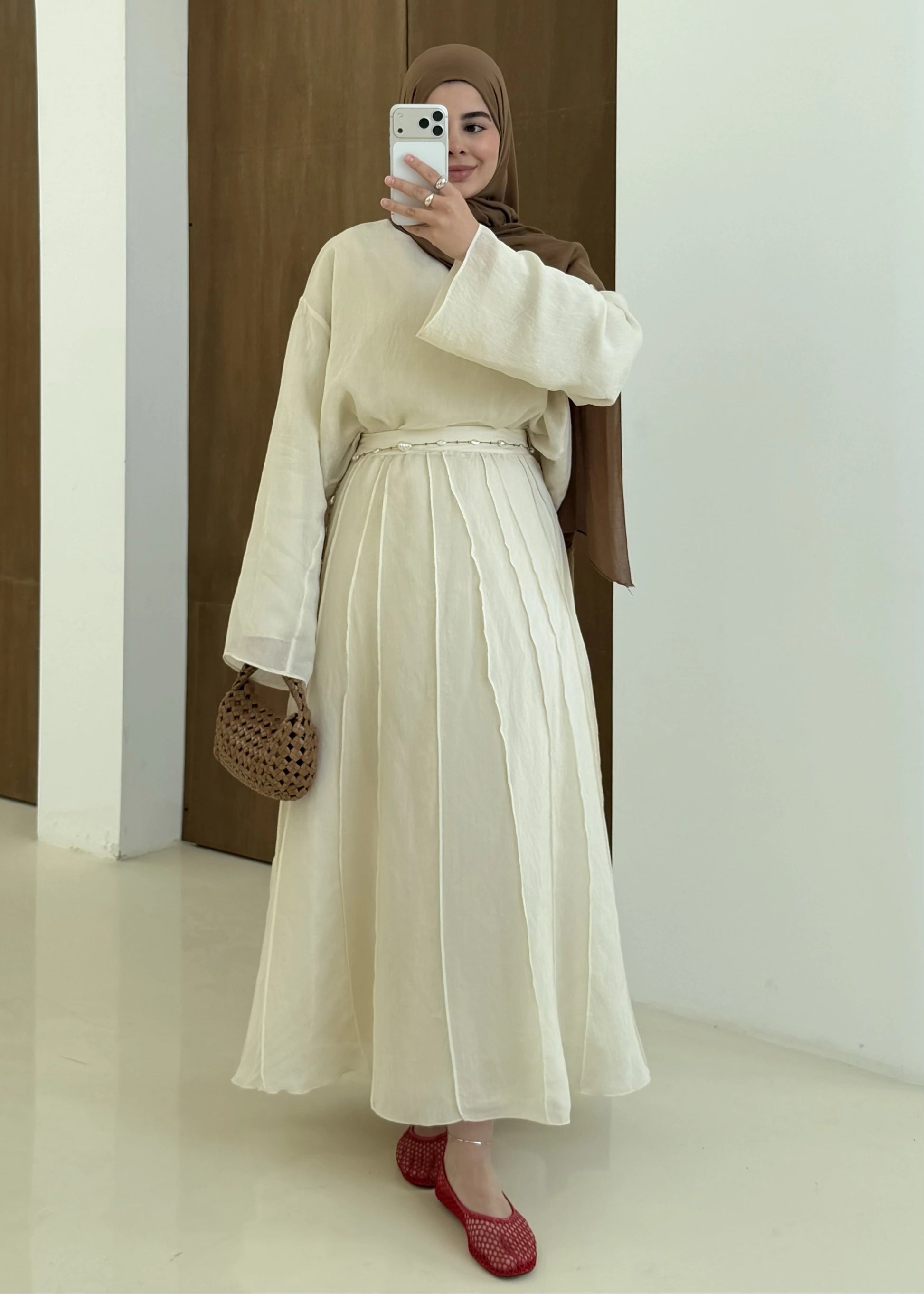 The set features a contemporary top with unique reverse stitch detailing and a matching maxi skirt that flows beautifully. For added comfort and a flawless silhouette, the entire set is fully lined, ensuring opacity and a smooth fit against the skin.
