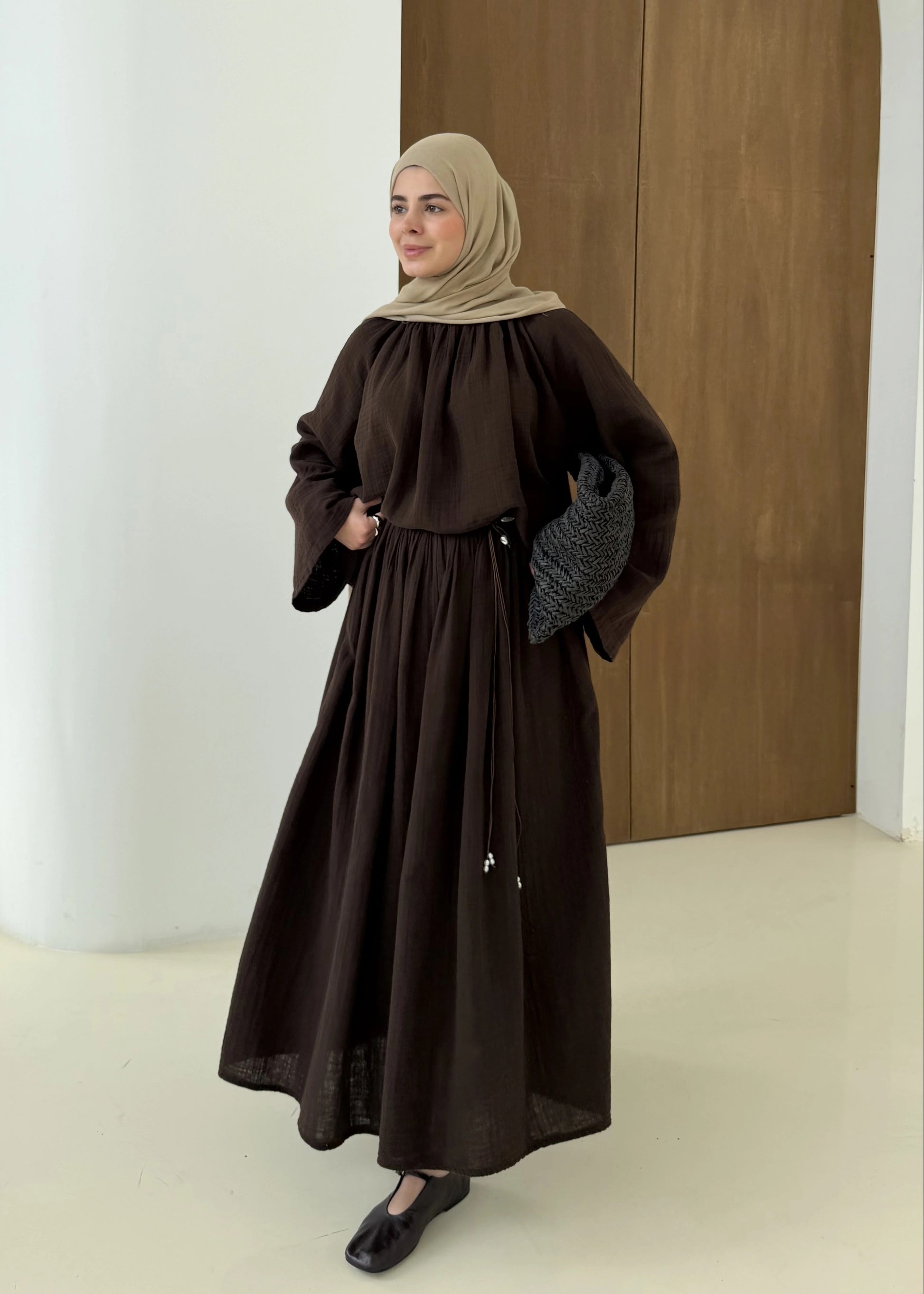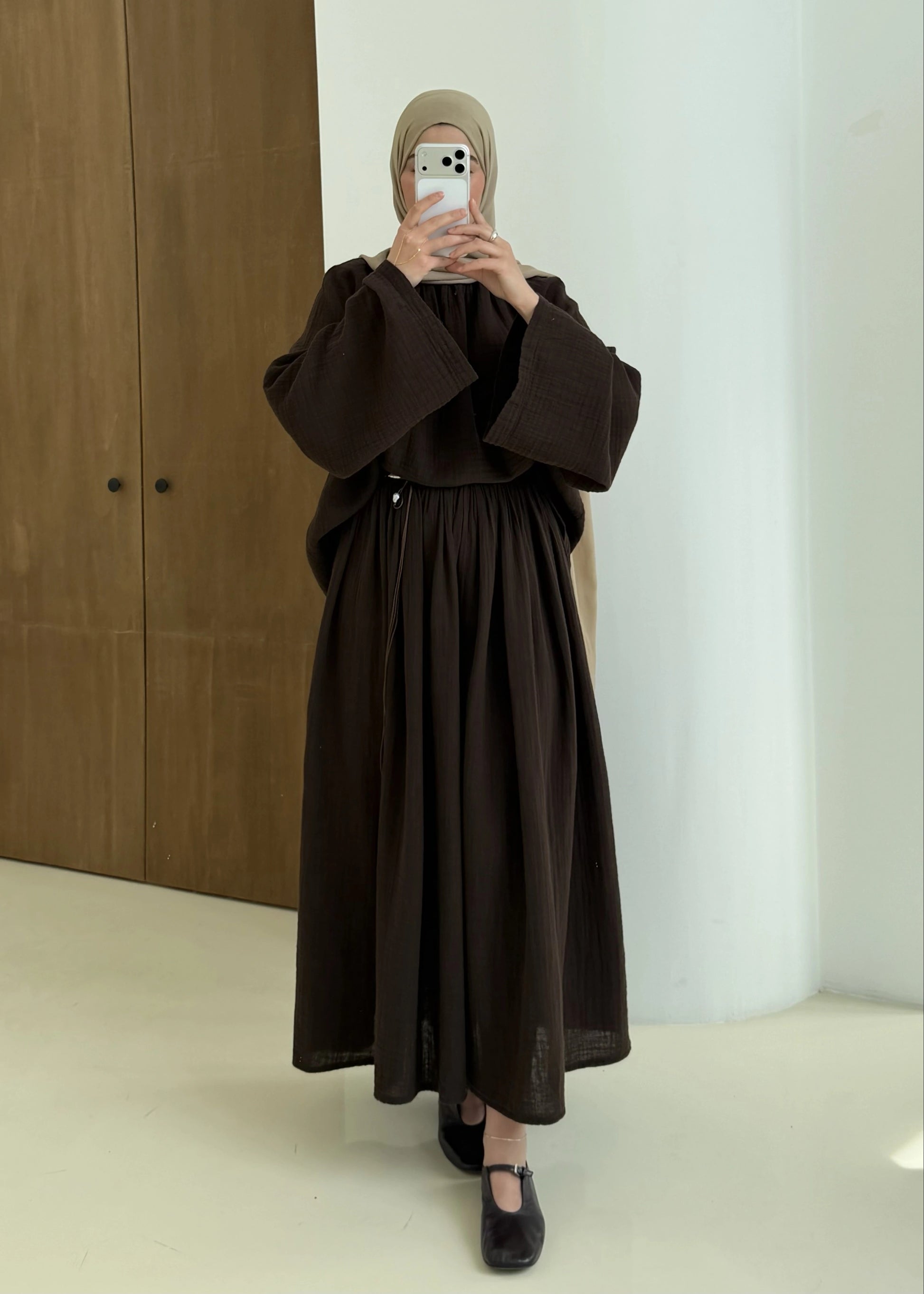 The set features a relaxed-fit tunic top and matching wide-leg trousers with an elasticated waistband for a pinch-free fit. Whether you're lounging at home, exploring a coastal town, or heading to a casual brunch, the rich coffee brown tone offers a grounded, sophisticated look that pairs beautifully with gold accessories and leather sandals.