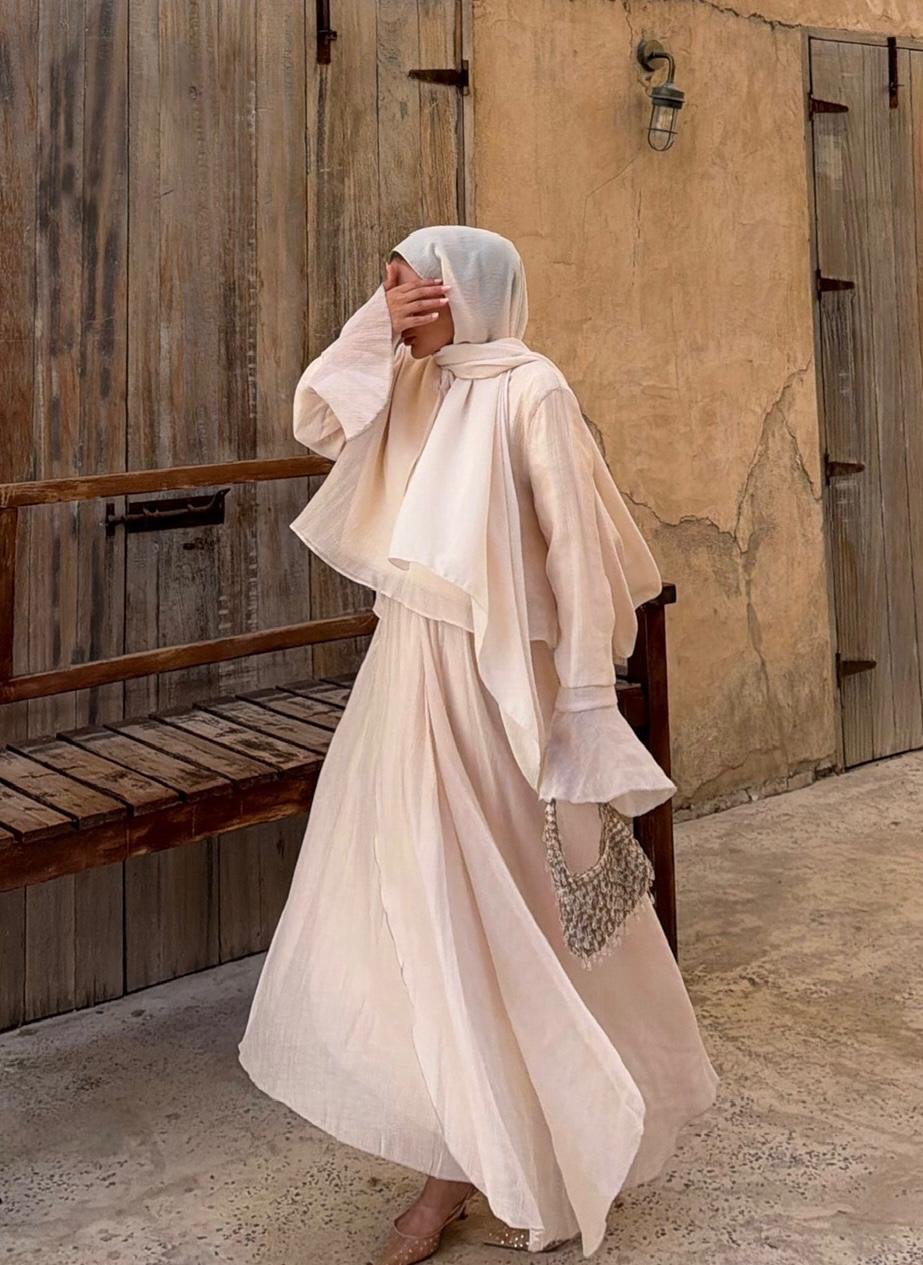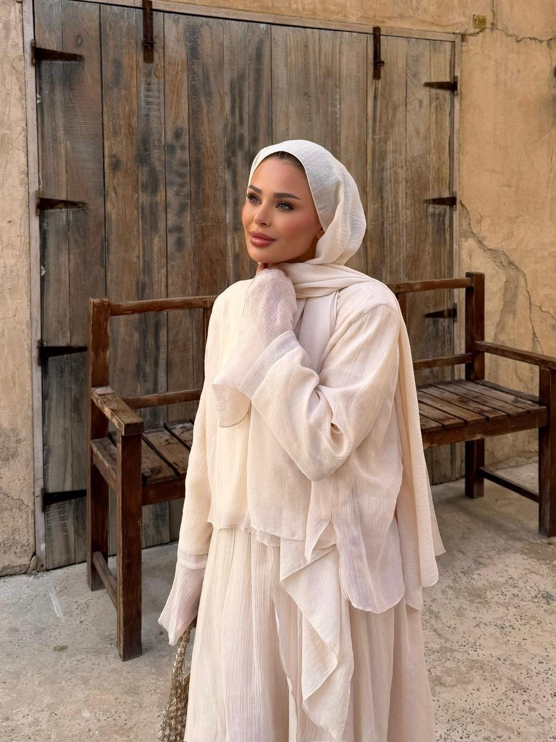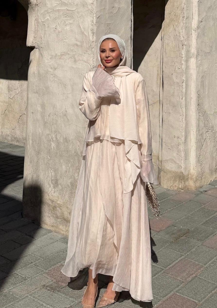 A refined two-piece set designed for effortless elegance in modest wear. Featuring a matching top and skirt, this set offers a clean silhouette with a soft, neutral tone that works perfectly for both daily styling and special occasions.