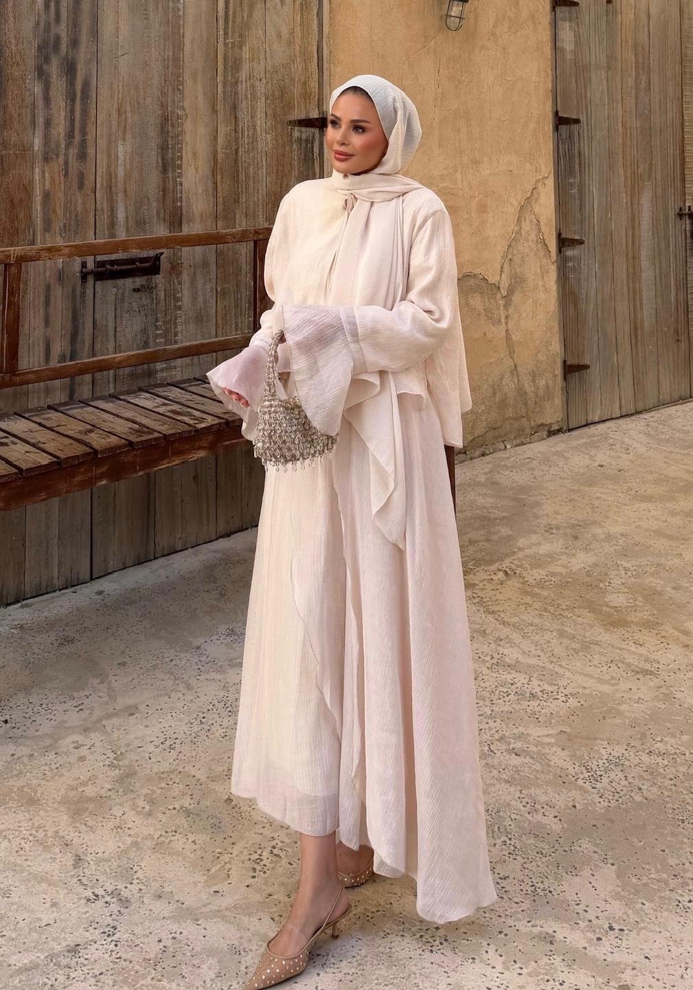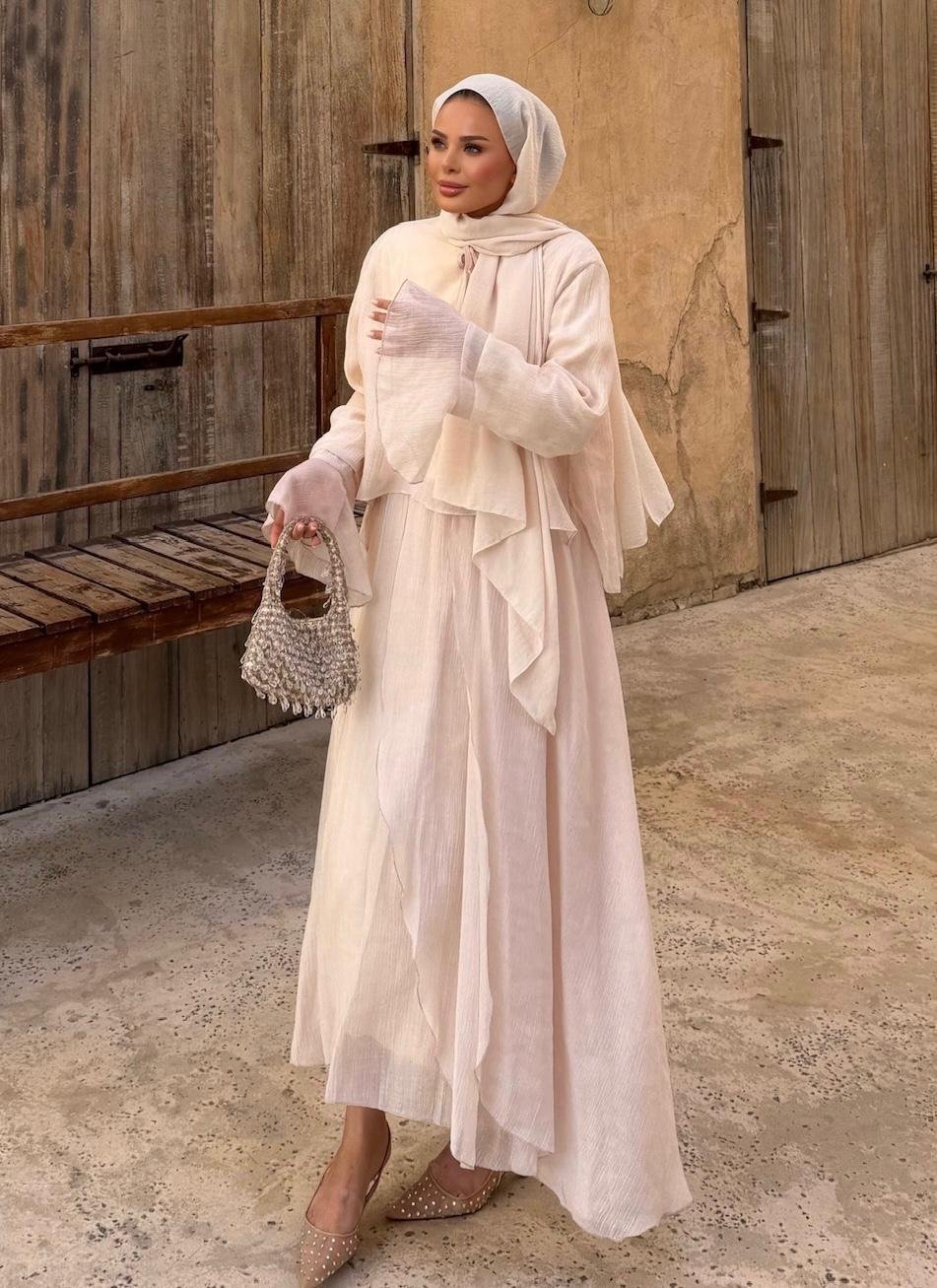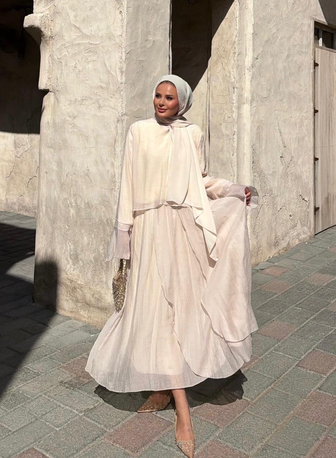 A refined two-piece set designed for effortless elegance in modest wear. Featuring a matching top and skirt, this set offers a clean silhouette with a soft, neutral tone that works perfectly for both daily styling and special occasions.