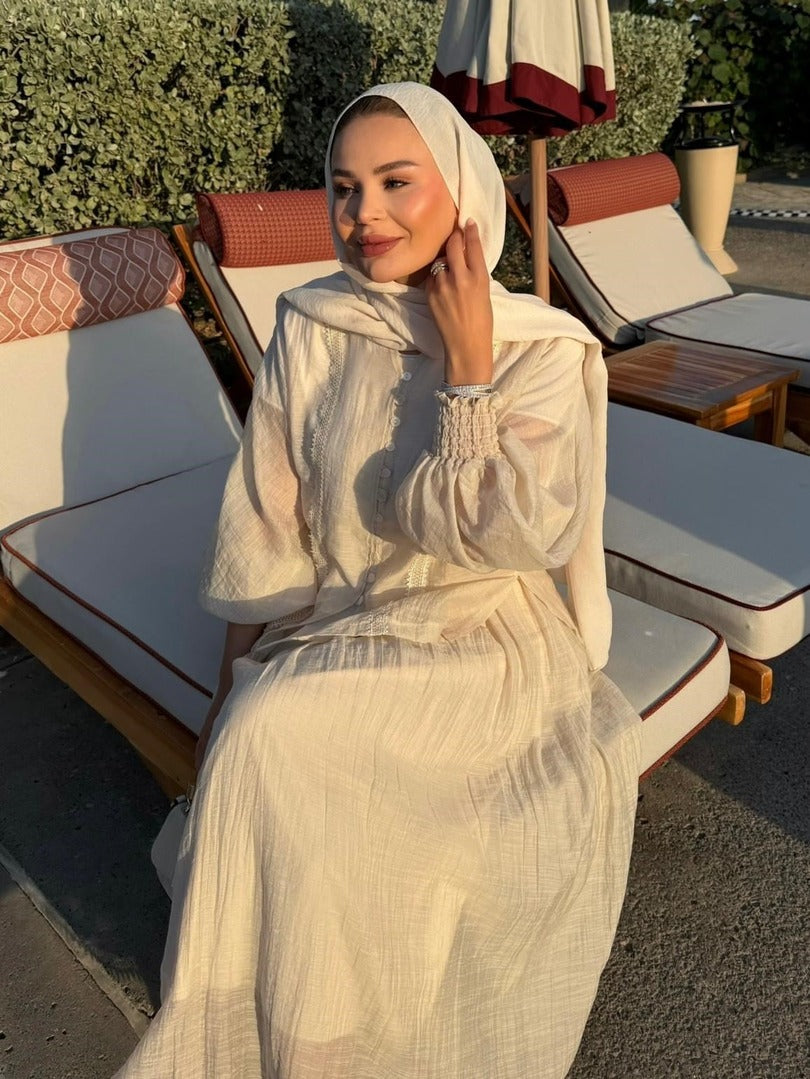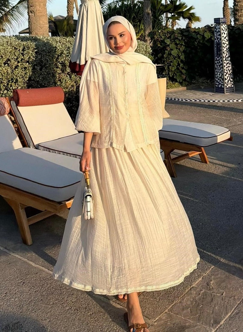Understated, sun-kissed and utterly wearable — this lace-trim co-ord set is your new warm-weather essential. The relaxed blouse features a delicate lace trim running down the button-front placket, smocked balloon cuffs for a soft feminine touch, and a gently flared hem that sits beautifully over the matching maxi skirt. The flowing skirt mirrors the blouse with a matching lace trim along the hem, tying the whole look together with effortless elegance.