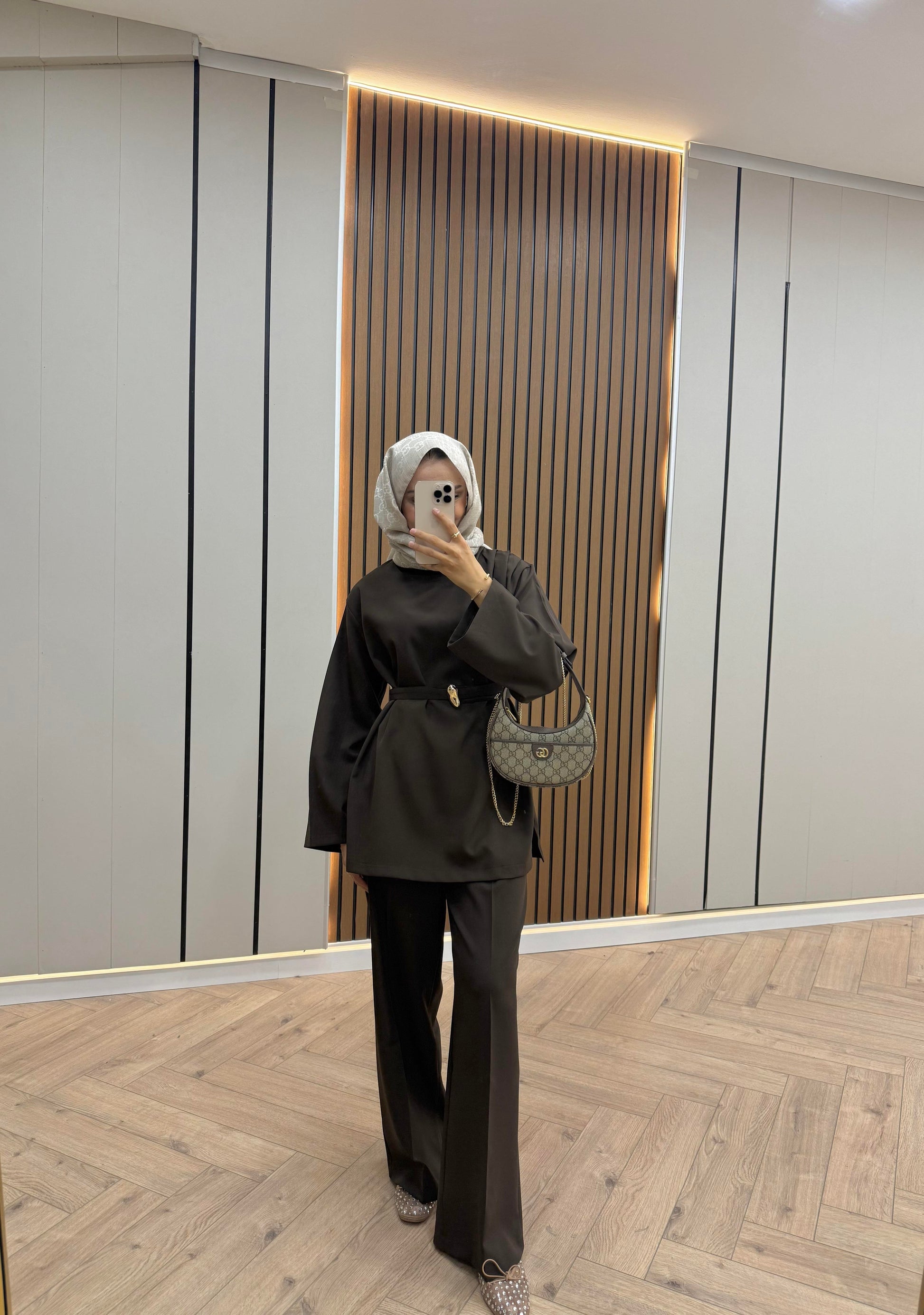 Gold Brooch-Detail Pants Set – Brown