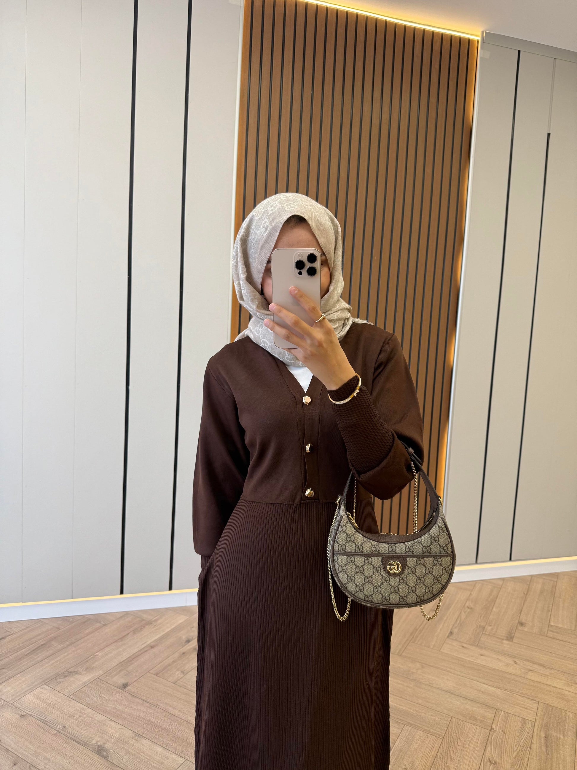 Gold-Button Knit Dress – Brown