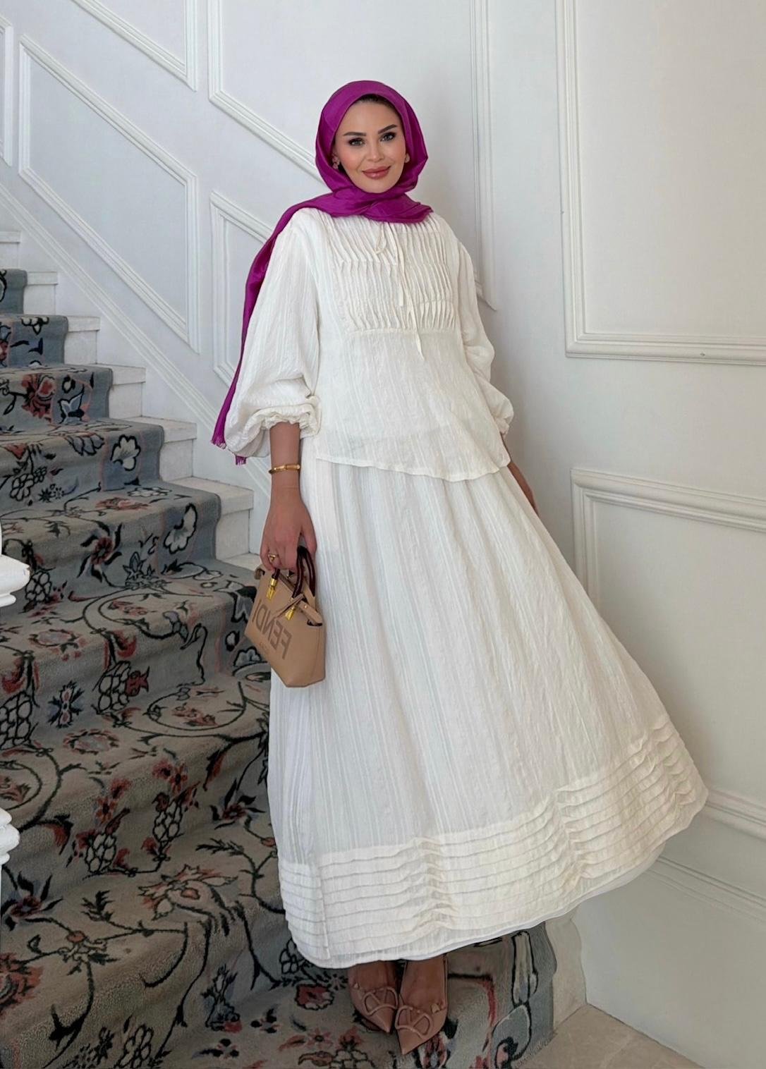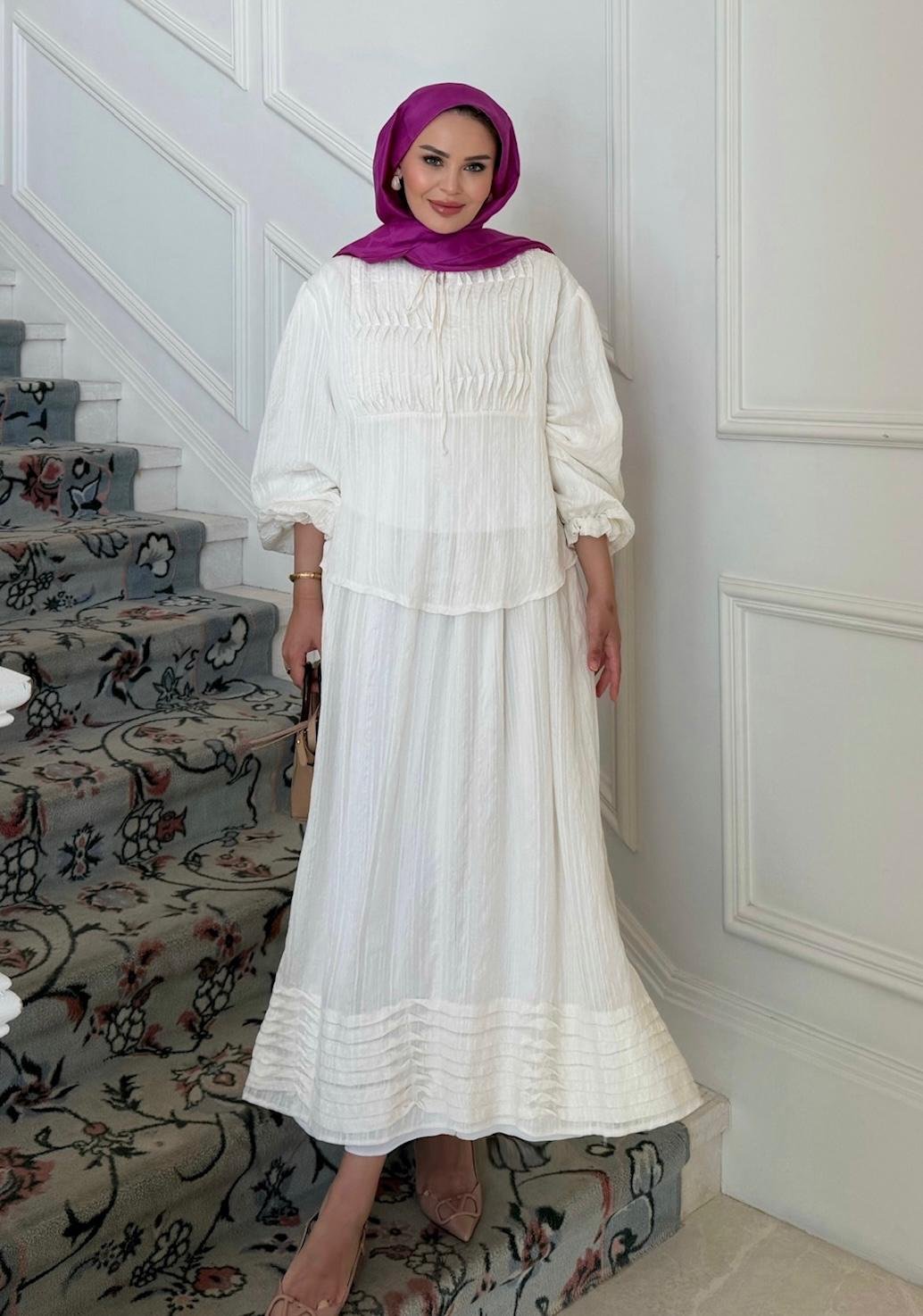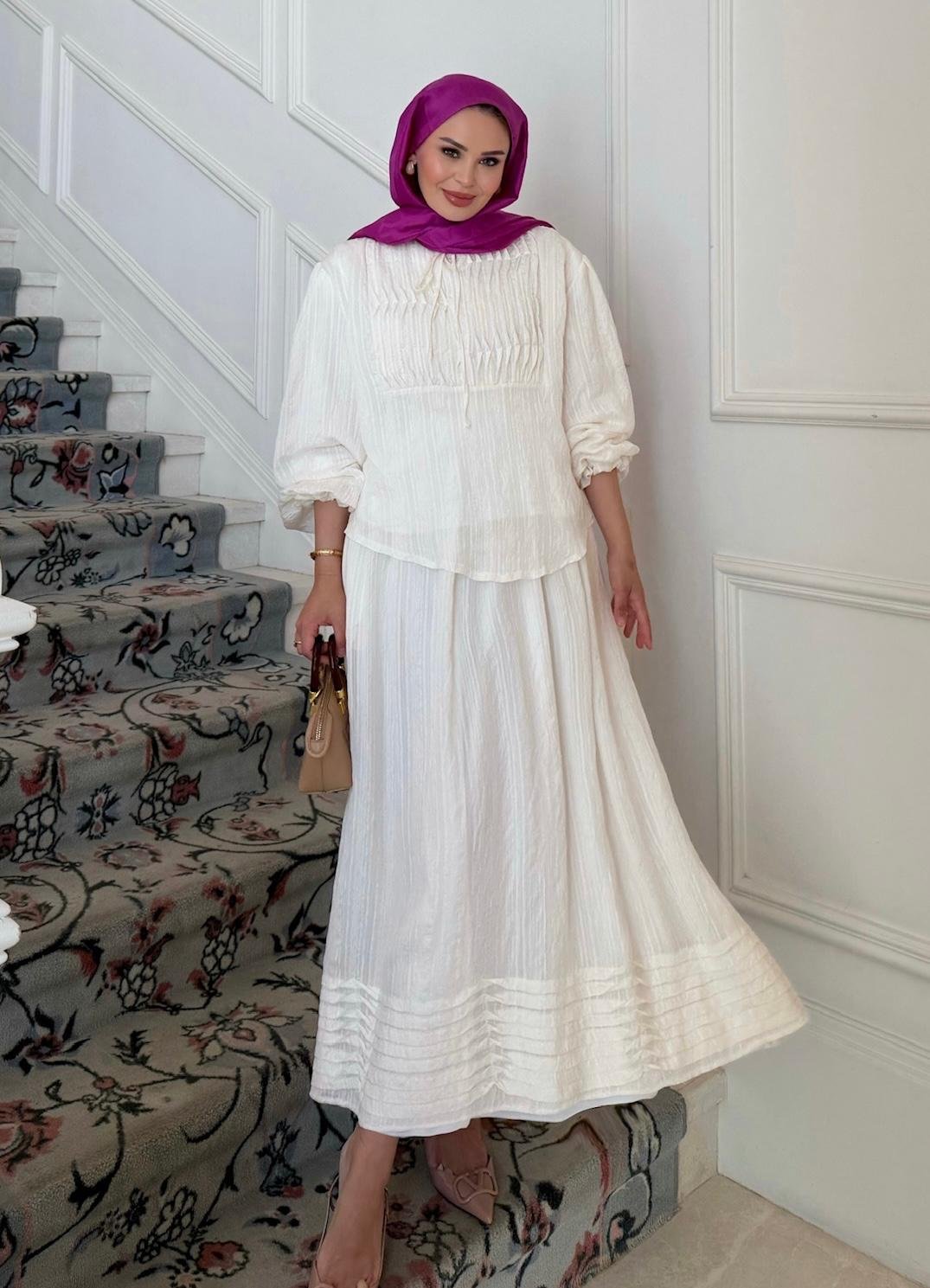 - Two-piece design: relaxed top + long skirt