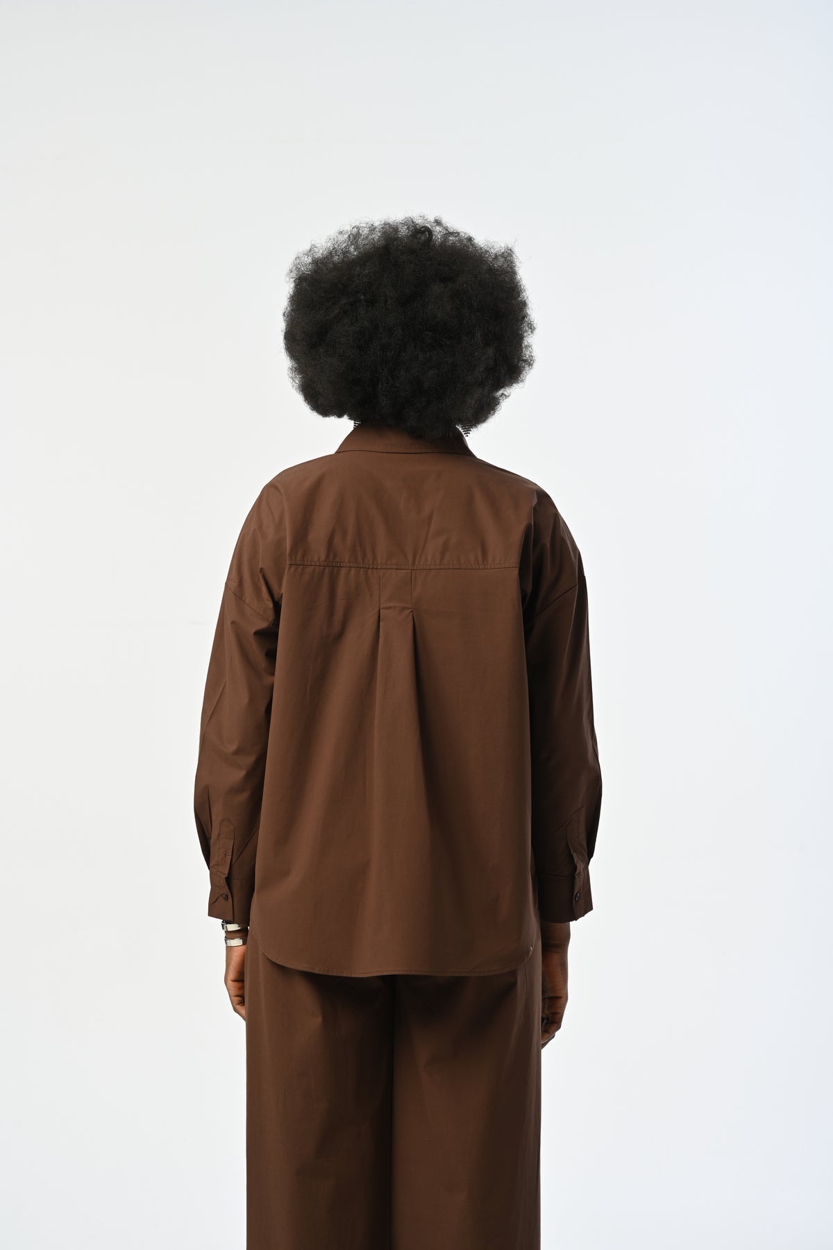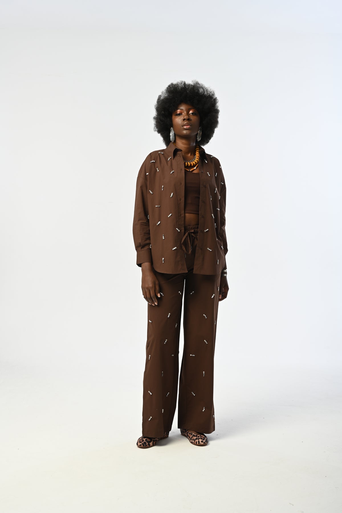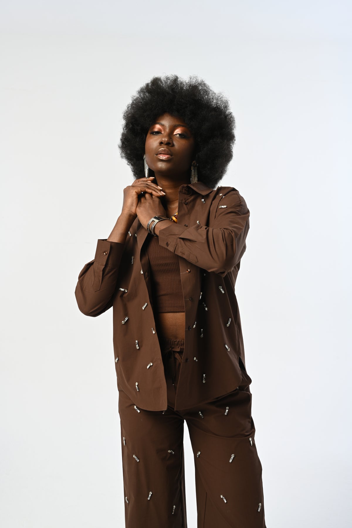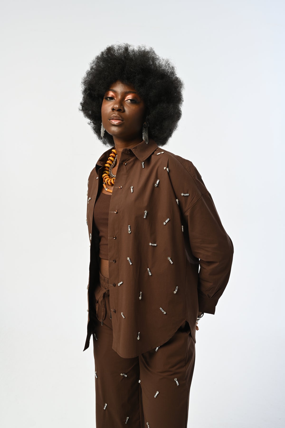 Combine elegance and comfort with this brown stone-embellished oversized shirt, perfect for both casual outfits and special occasions. The sparkling stone details on the front and the relaxed oversized fit create a modern, empowered look.
