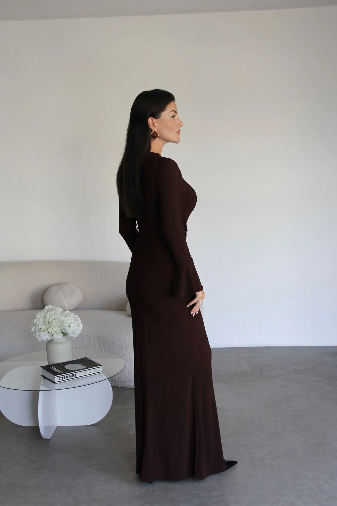 Premium Coffee Maxi Dress | Gold Brooch Detail & Gathered Waist Design