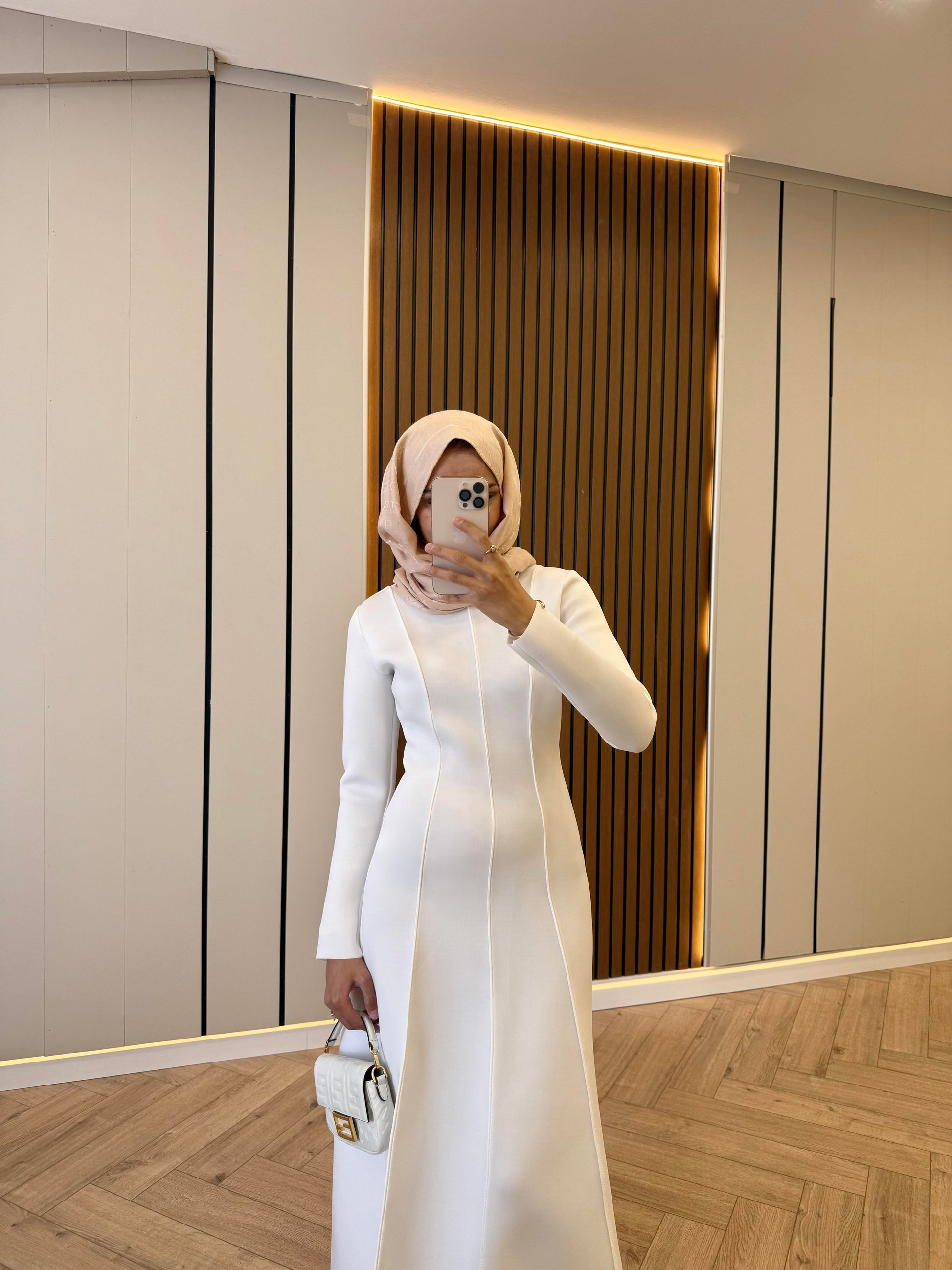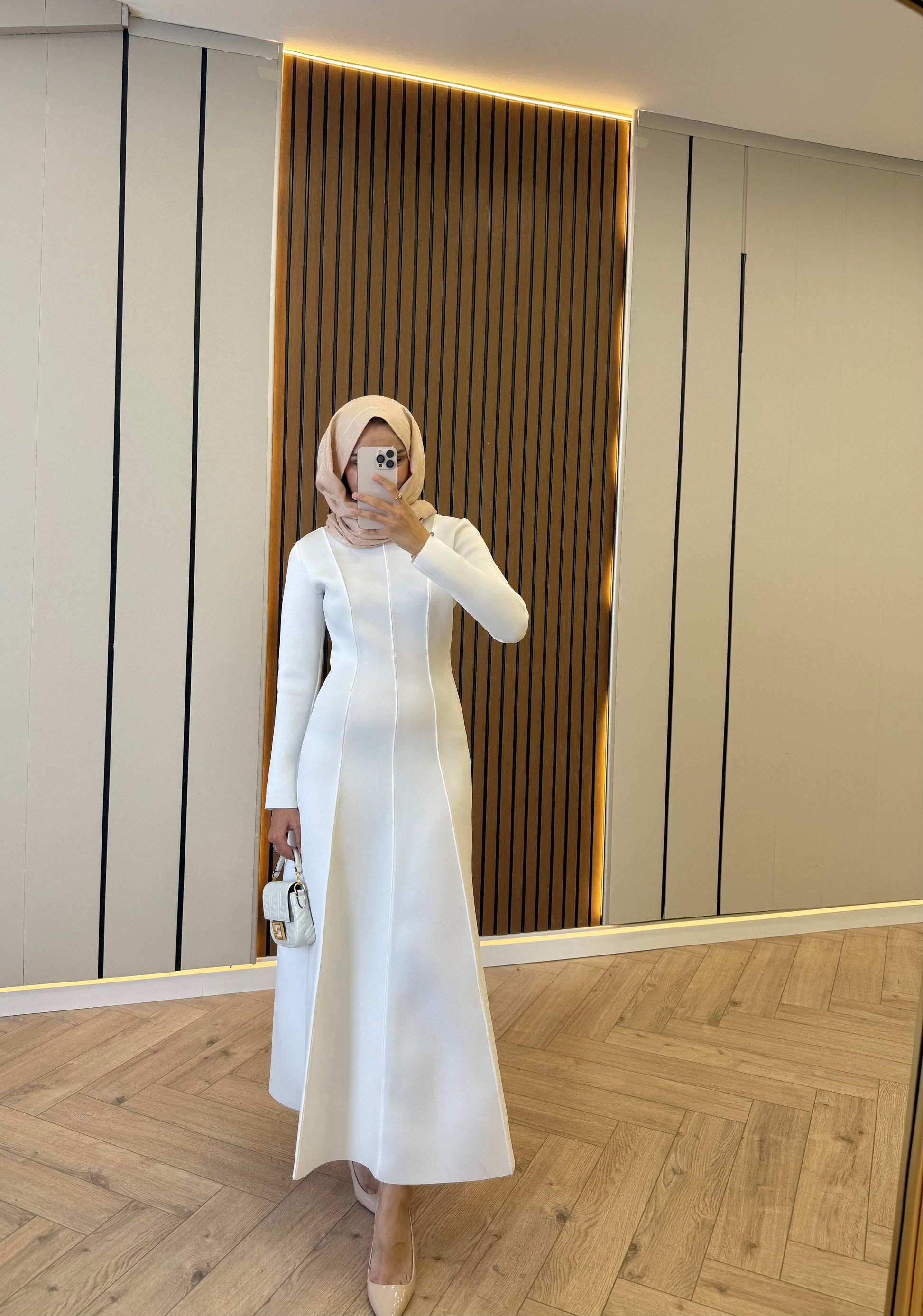 Puff-Detail Scuba Fabric Dress – White
