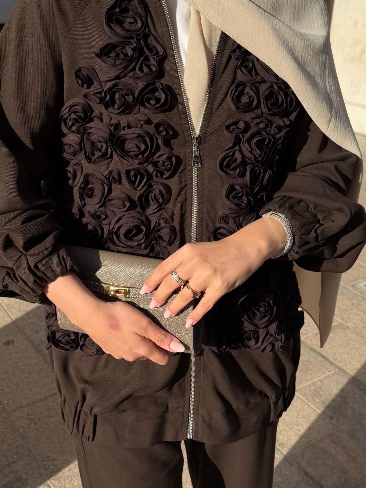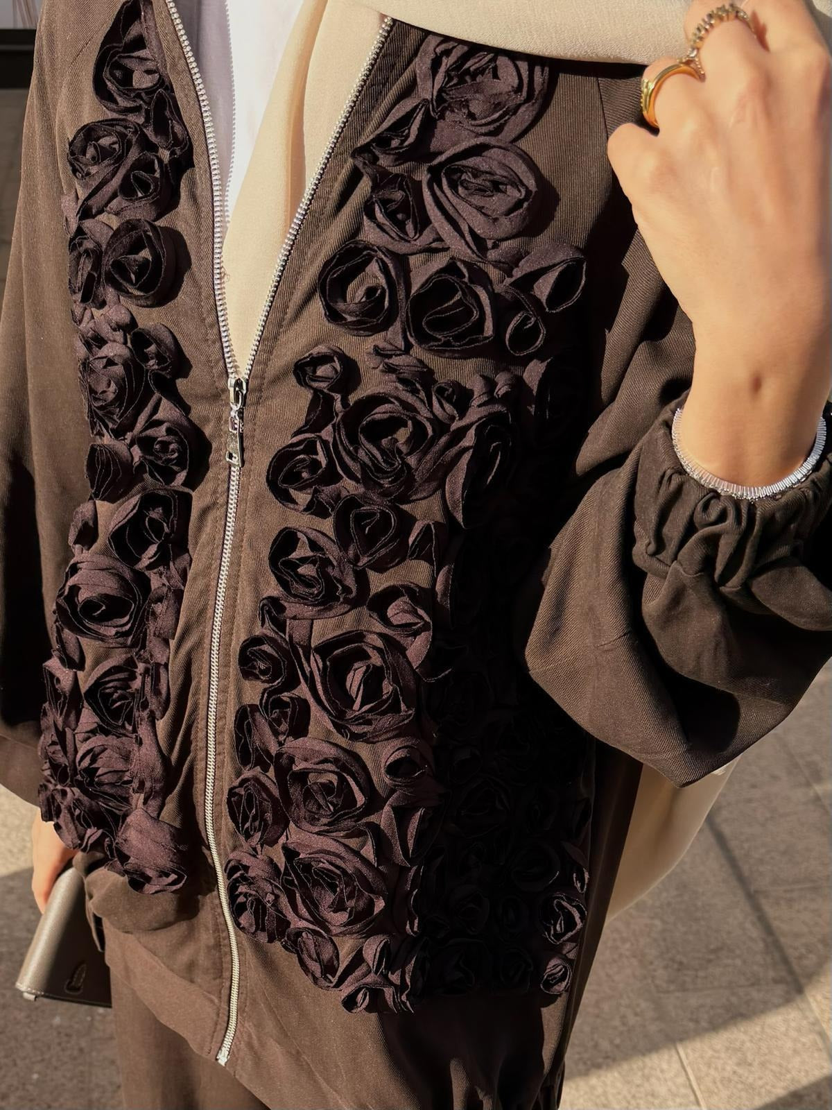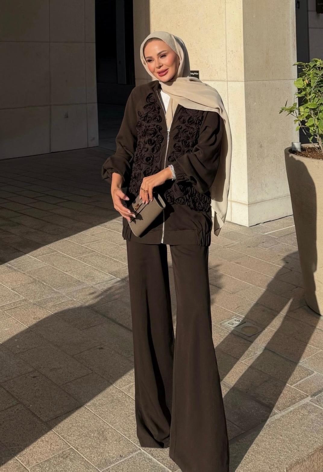 Rose Embellished Pants Set – Brown