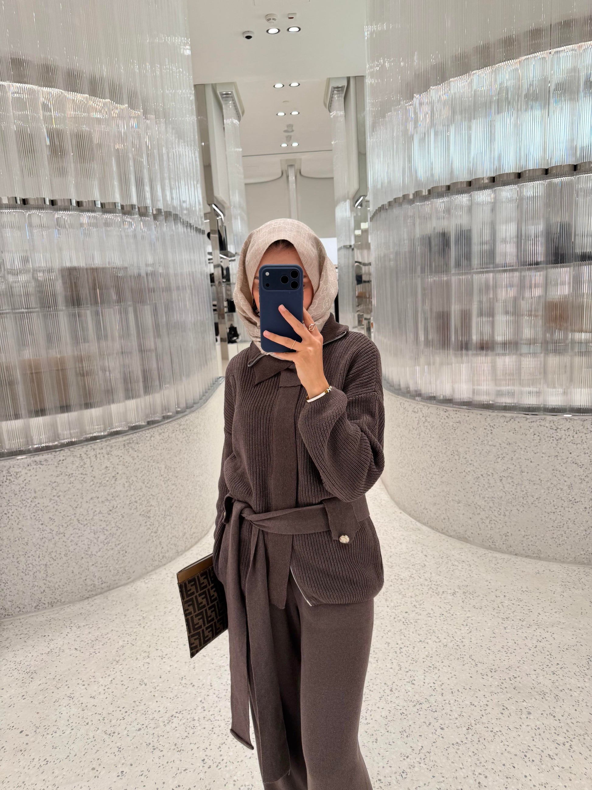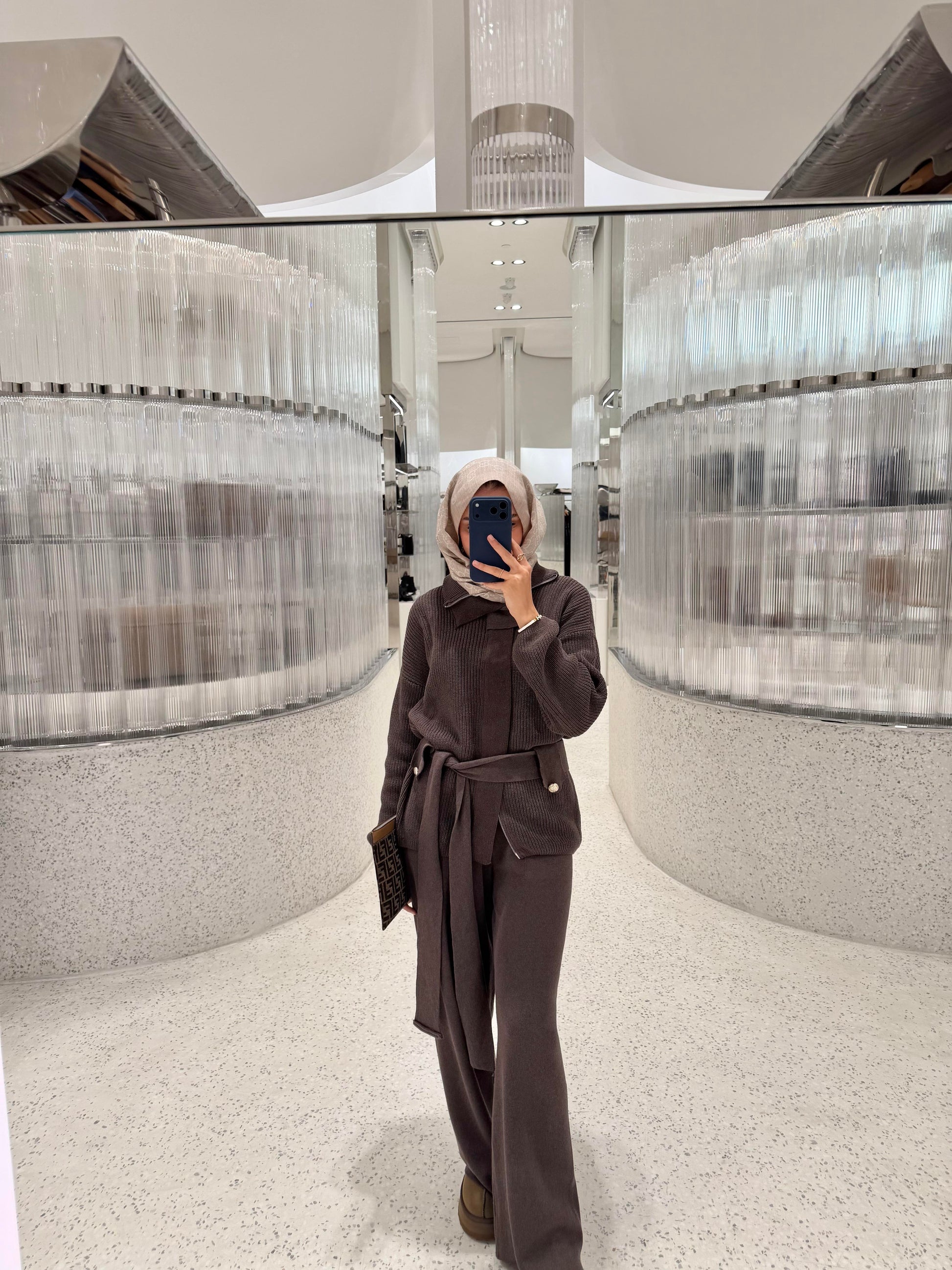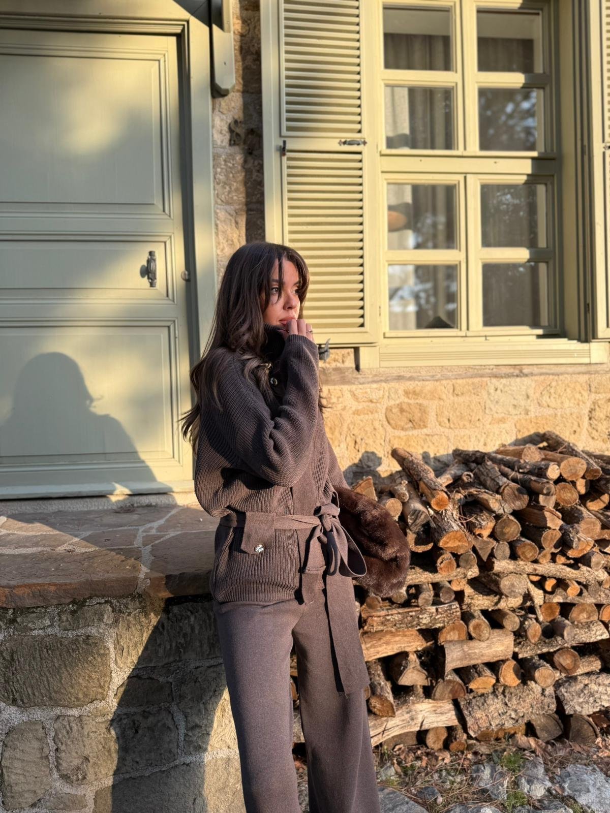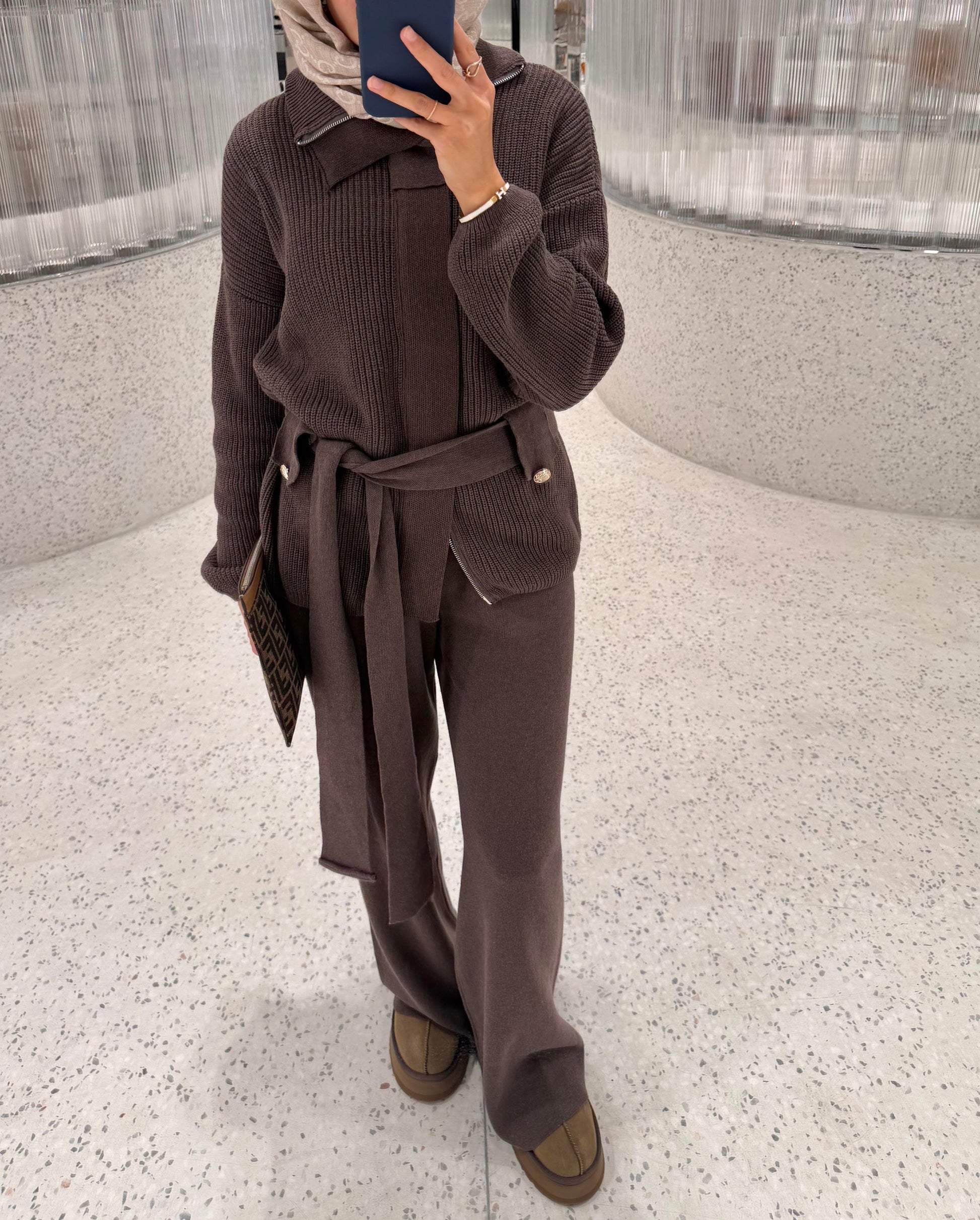 A two-piece knit set crafted from soft, breathable jersey-knit fabric for all-day comfort. The set includes a long-sleeve top and relaxed wide-leg trousers. The warm mocha-toned light-coffee colour adds a touch of understated sophistication—perfect for effortless everyday styling.