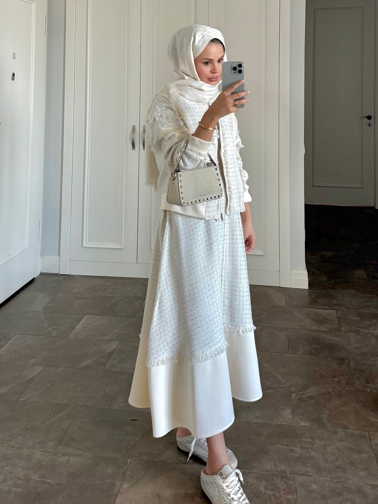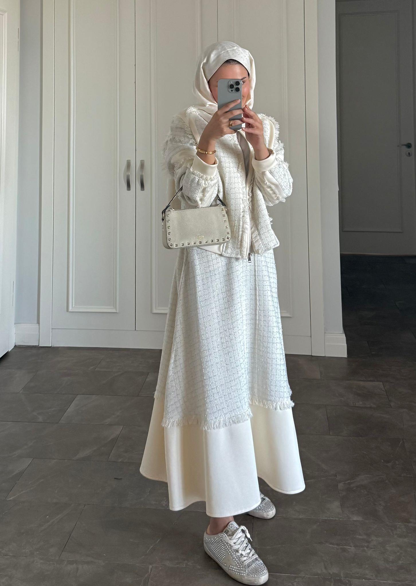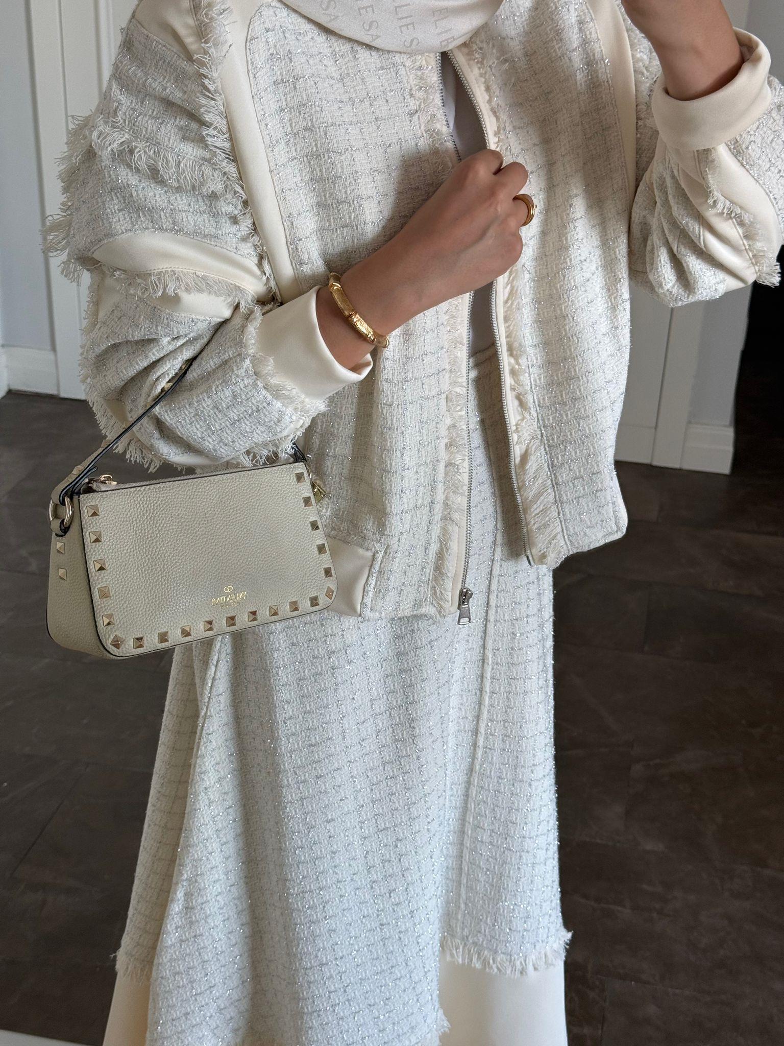 Elevate your modest wardrobe with this sophisticated two-piece set crafted from scuba fabric and tweed trim. The ensemble includes a tailored jacket and a flared skirt in an elegant ecru shade—perfect for both professional settings and refined social occasions.