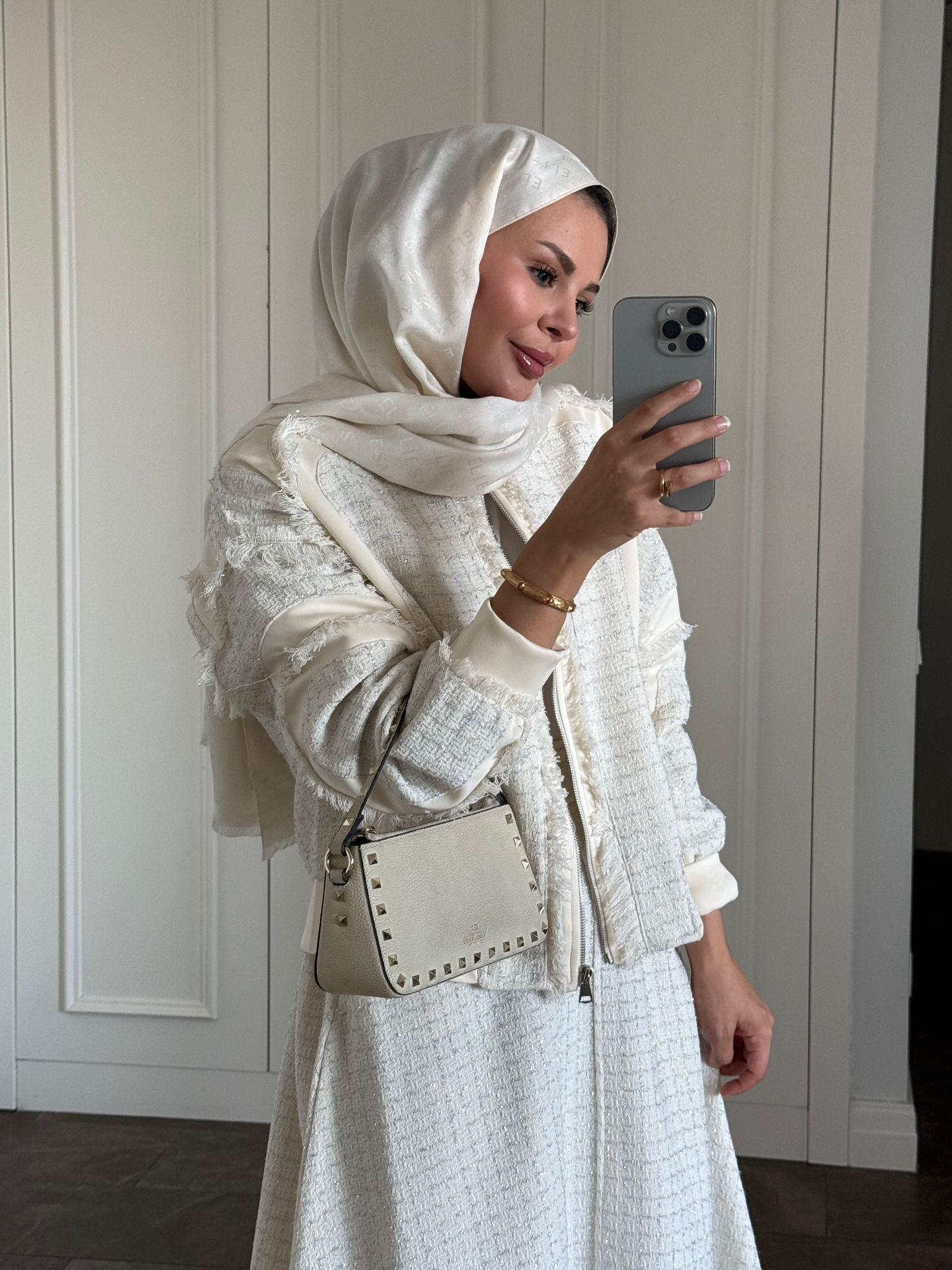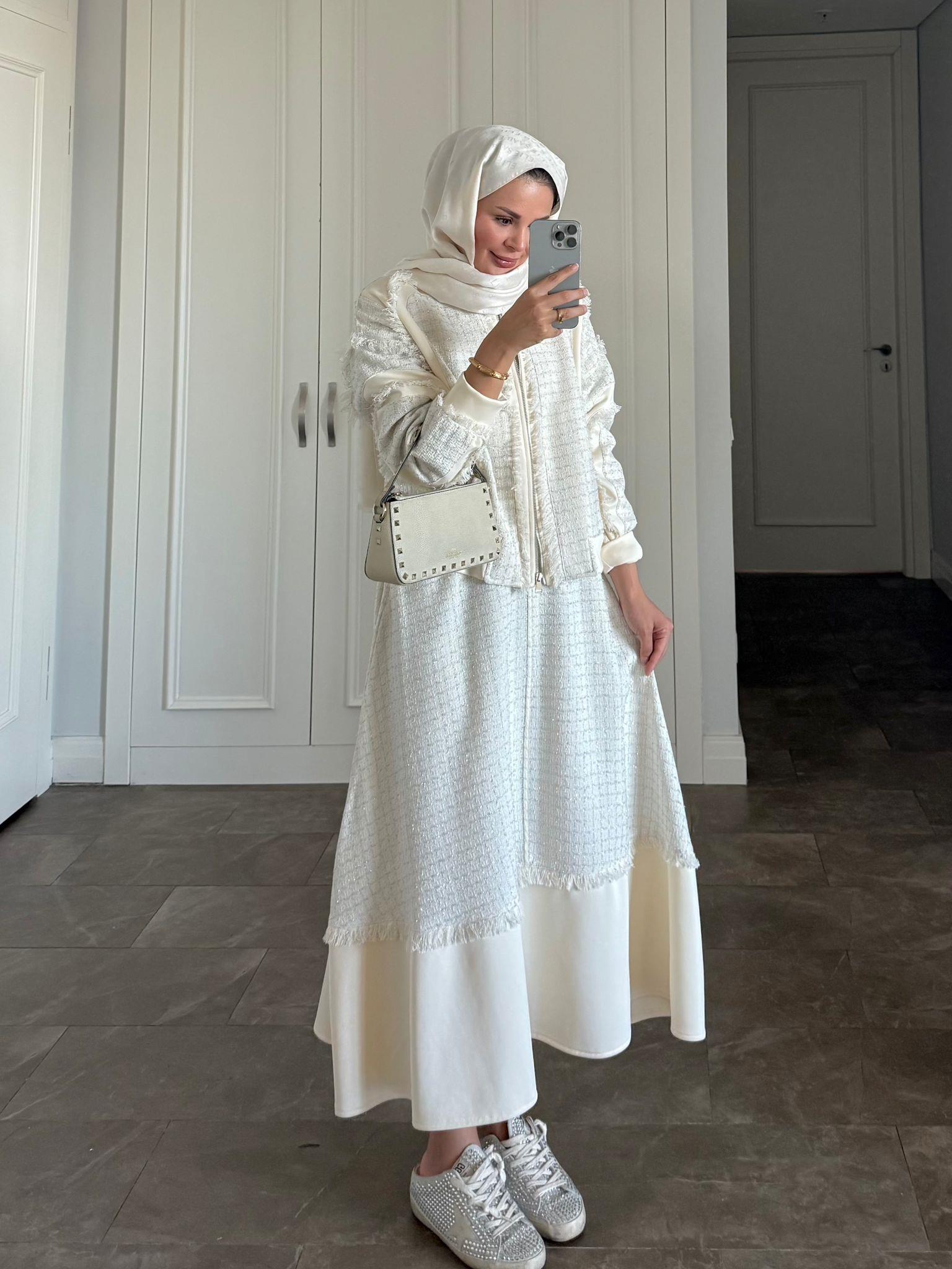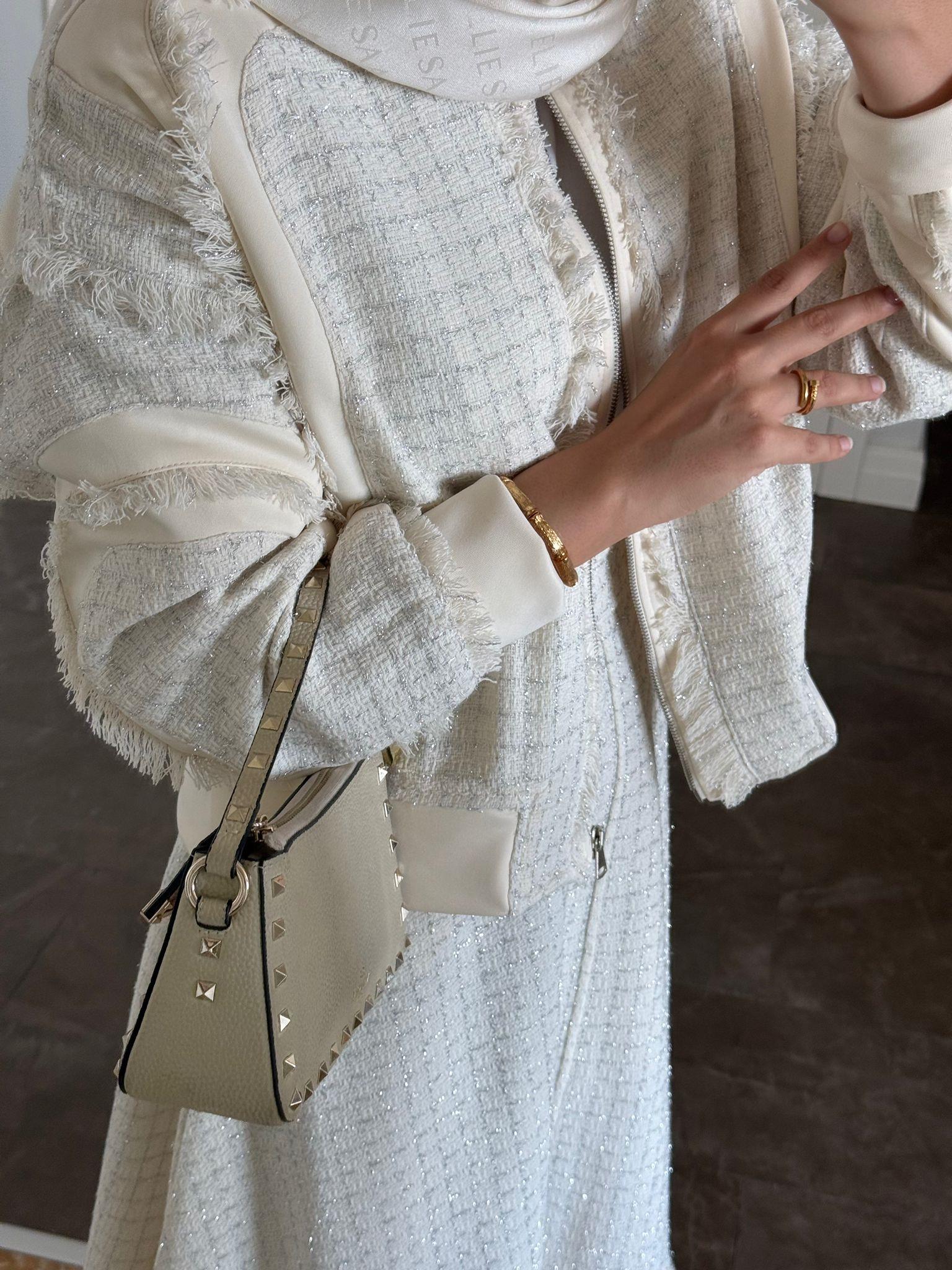 Elevate your modest wardrobe with this sophisticated two-piece set crafted from scuba fabric and tweed trim. The ensemble includes a tailored jacket and a flared skirt in an elegant ecru shade—perfect for both professional settings and refined social occasions.